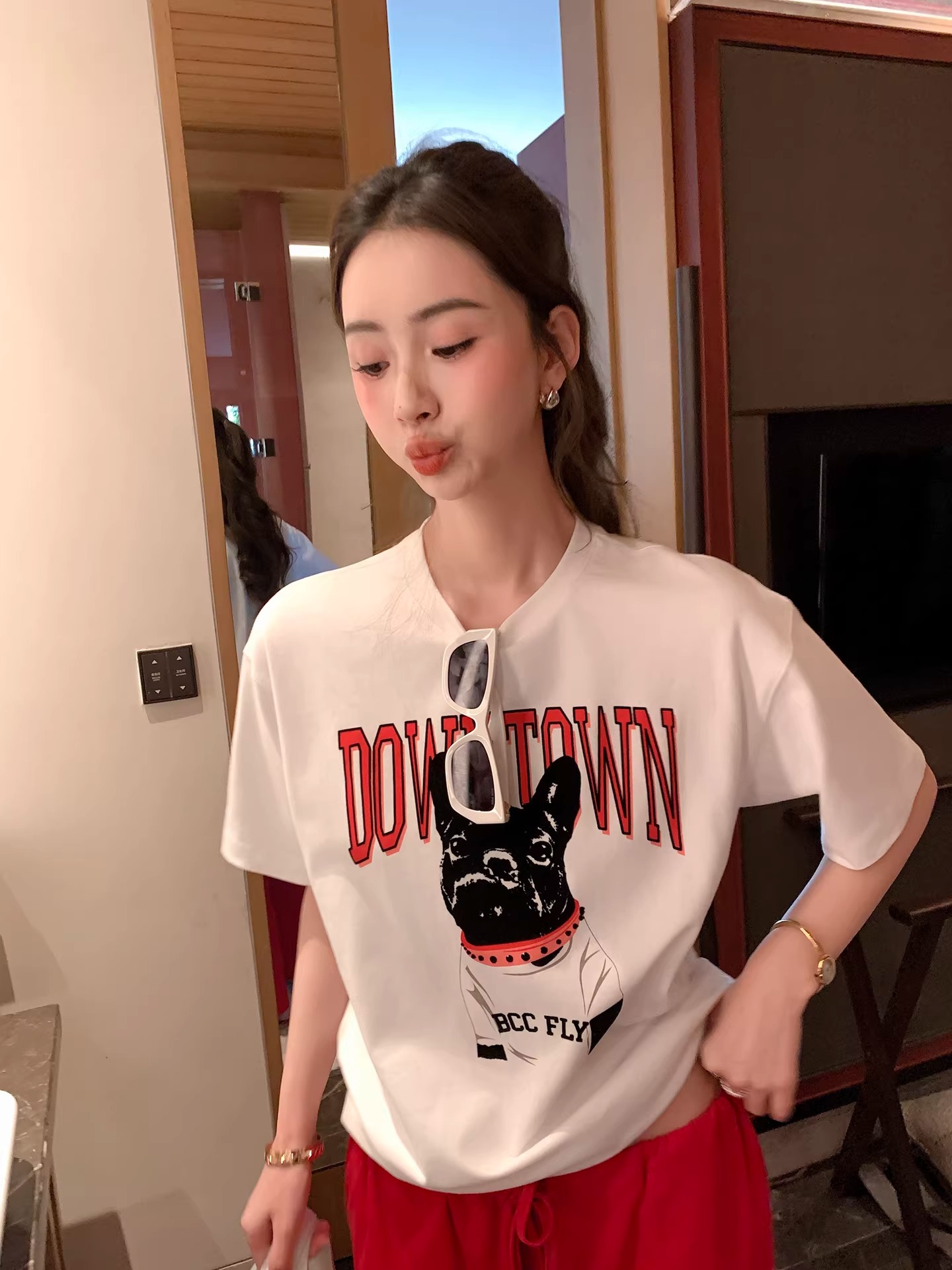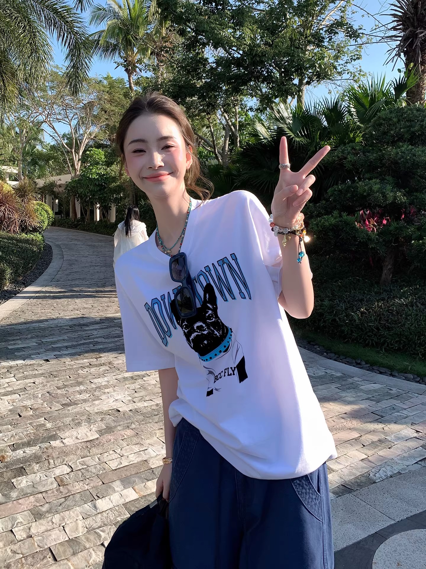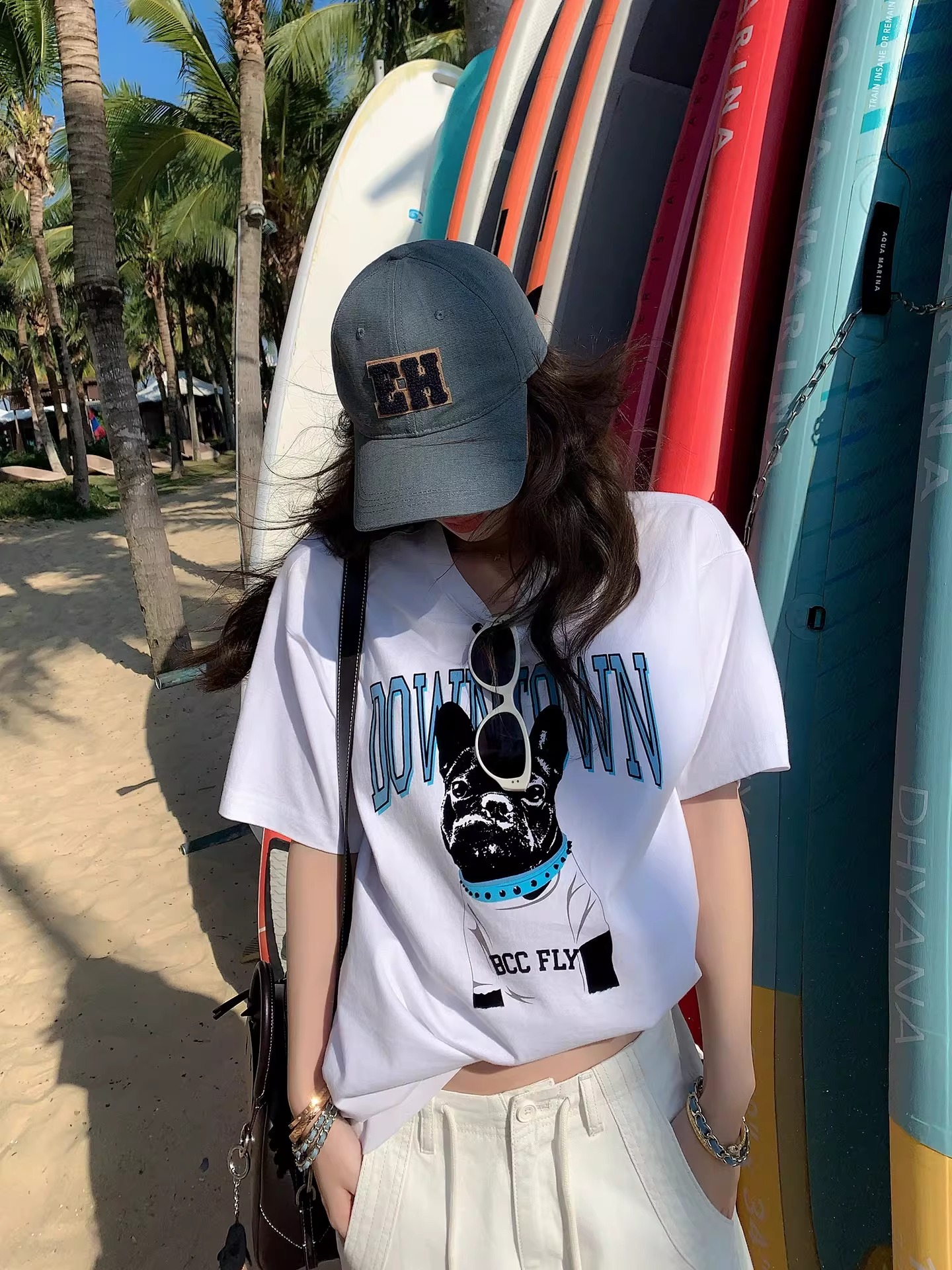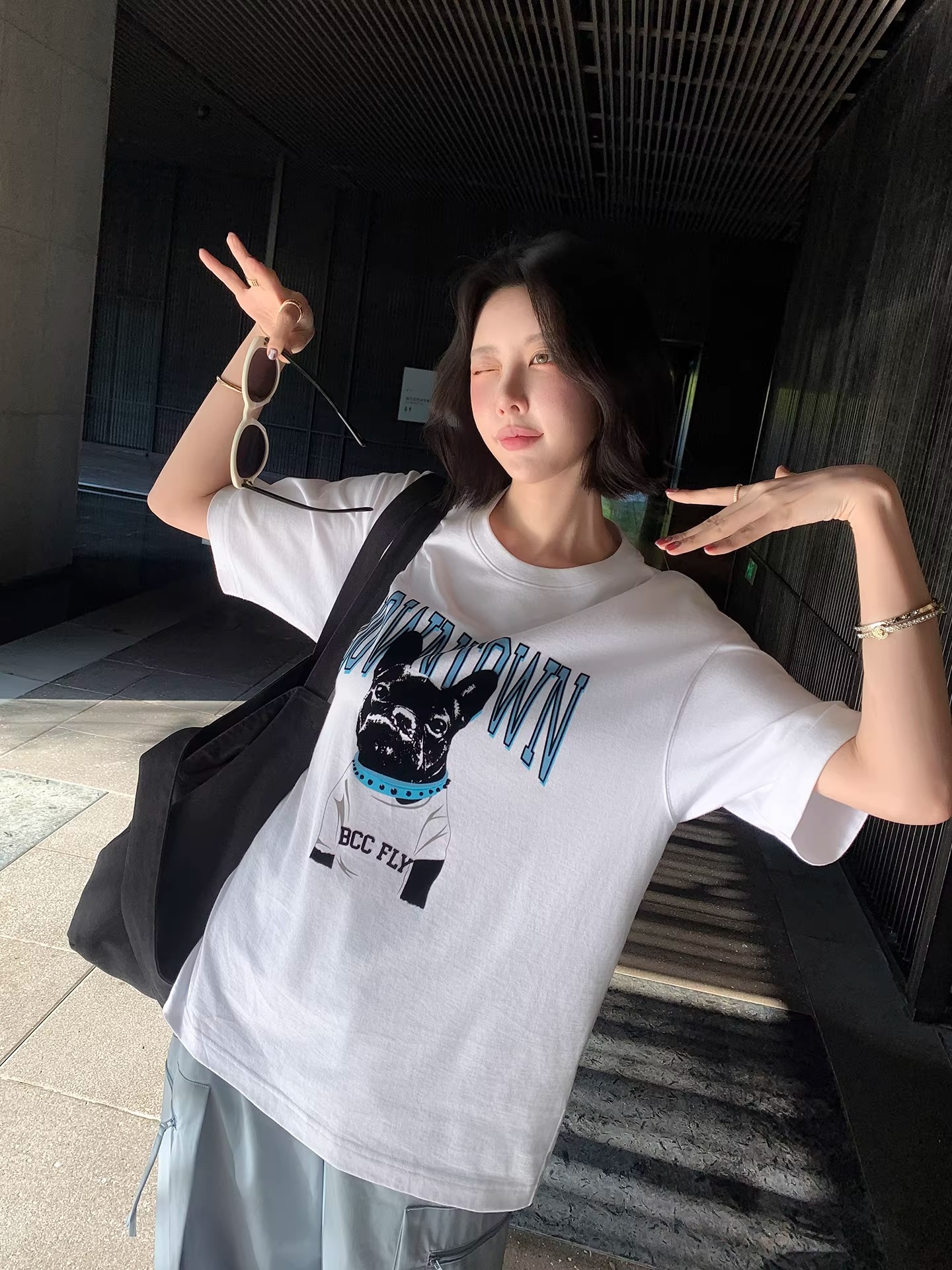 실사 한 부서 화이트 만화 조개 프린트 디자인 센스 긍정적 인 어깨 반팔 티셔츠 여성 여름 루즈핏 느긋한 맨위