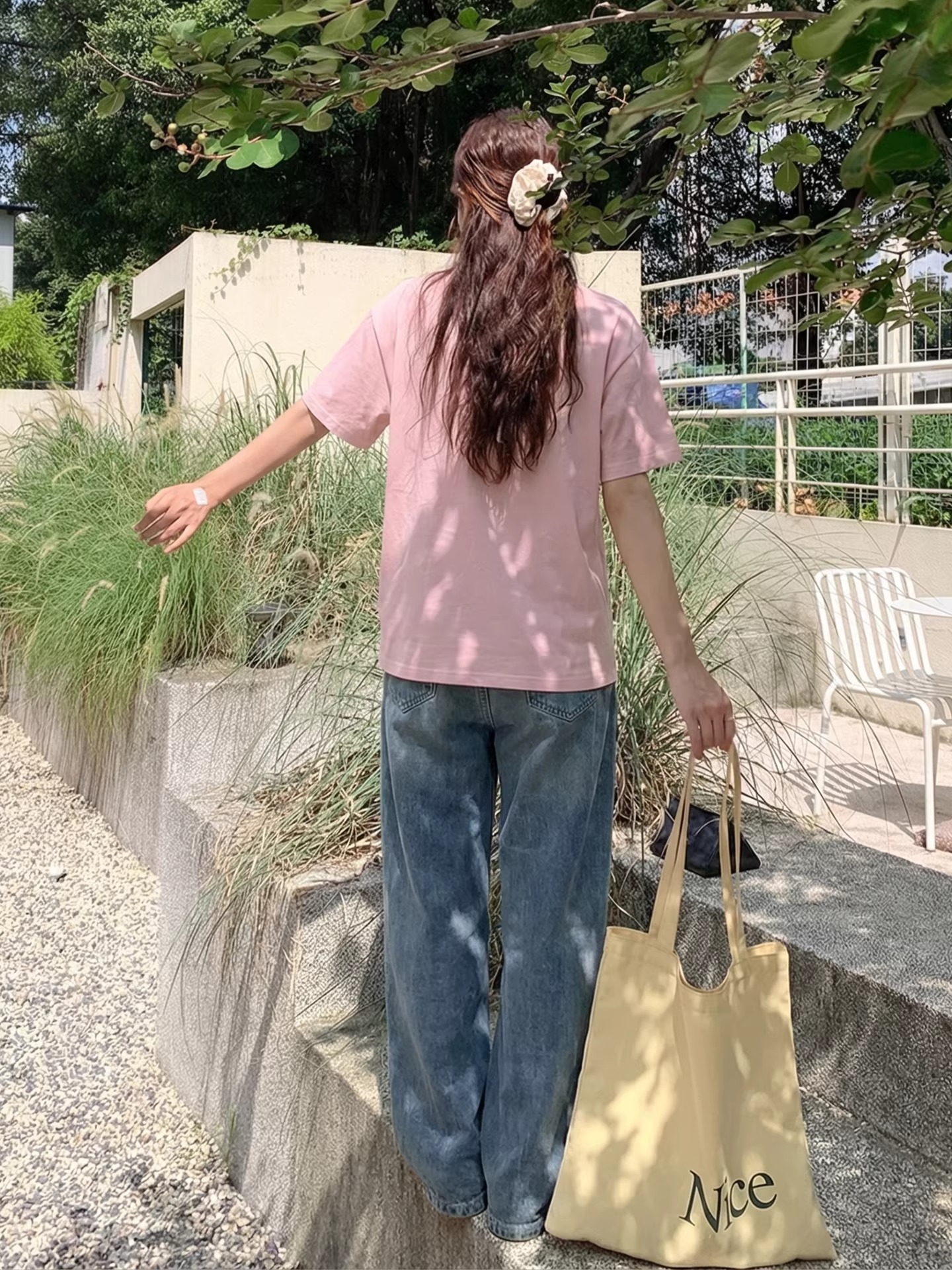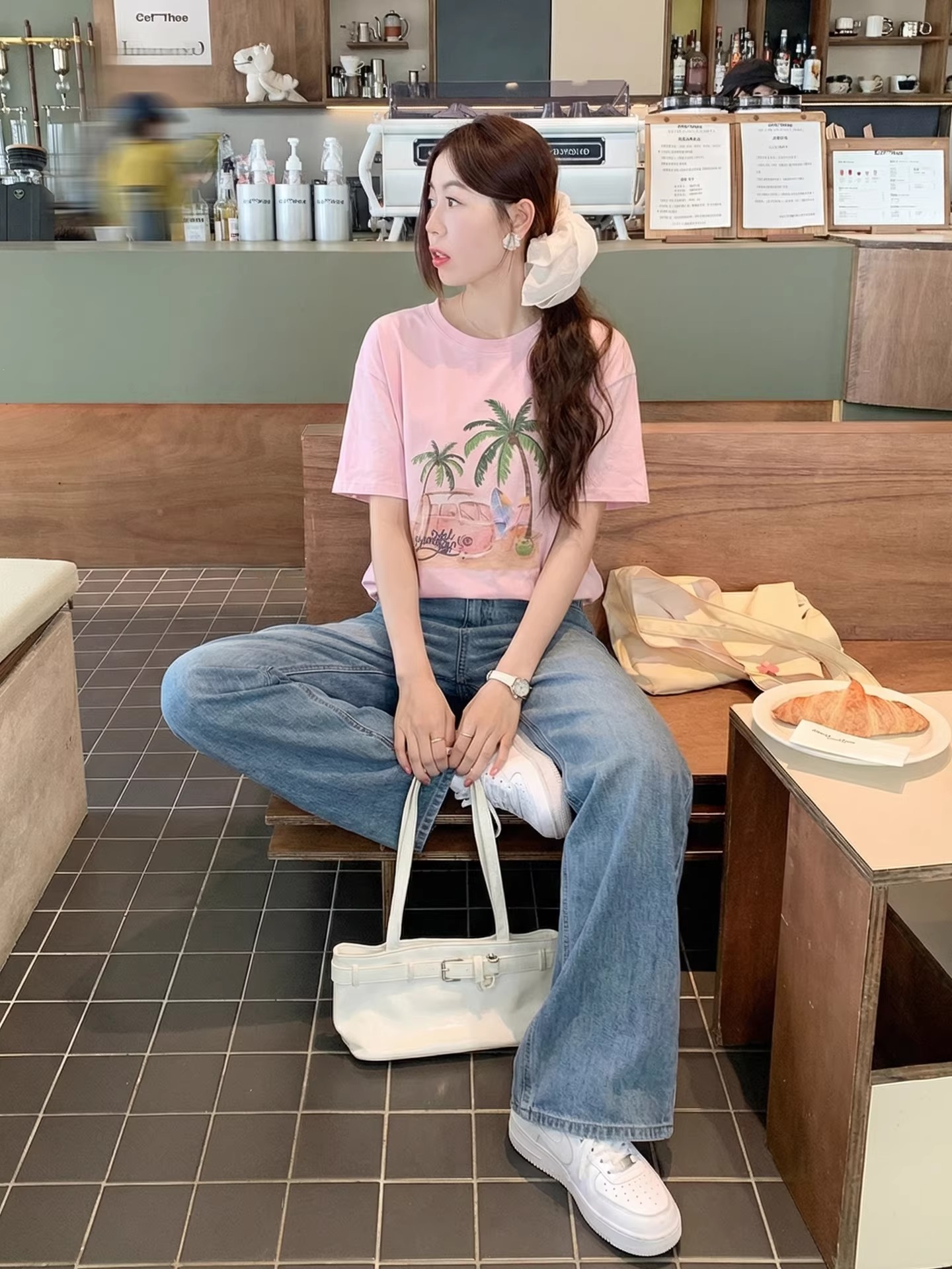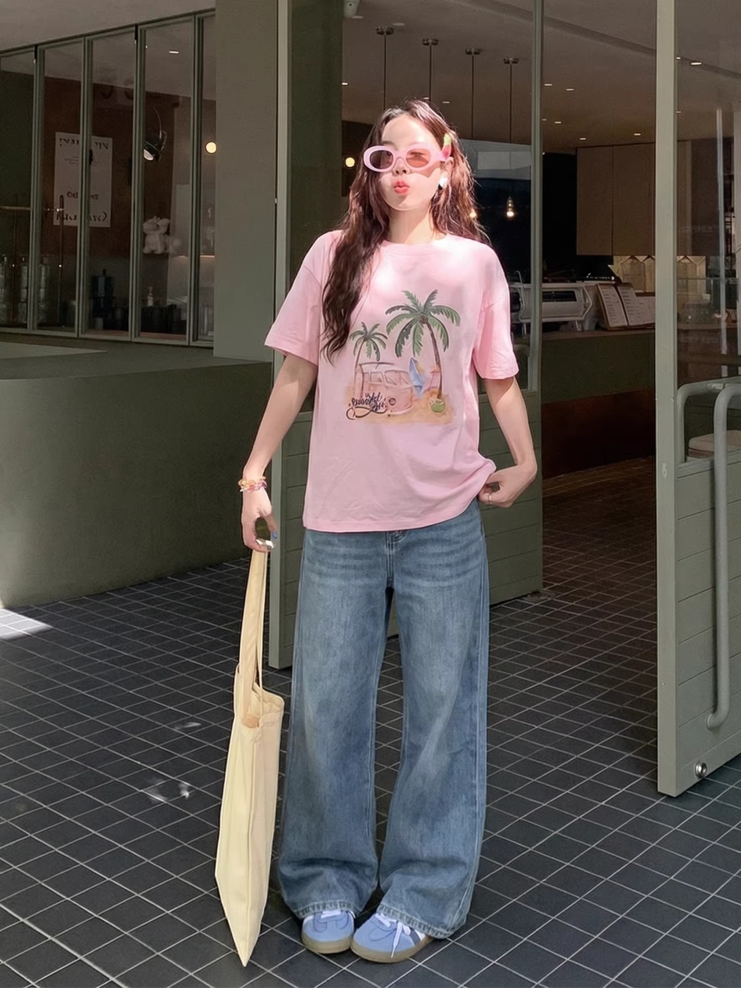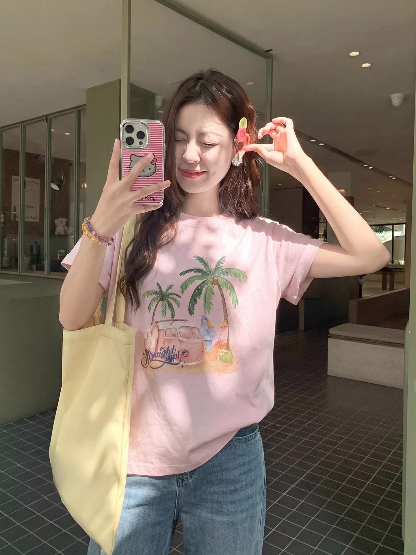경관 그림 21 순면 210 그램 2026 년 봄 여름 드레스 반팔 티셔츠 여성 한국 스타일 프린트