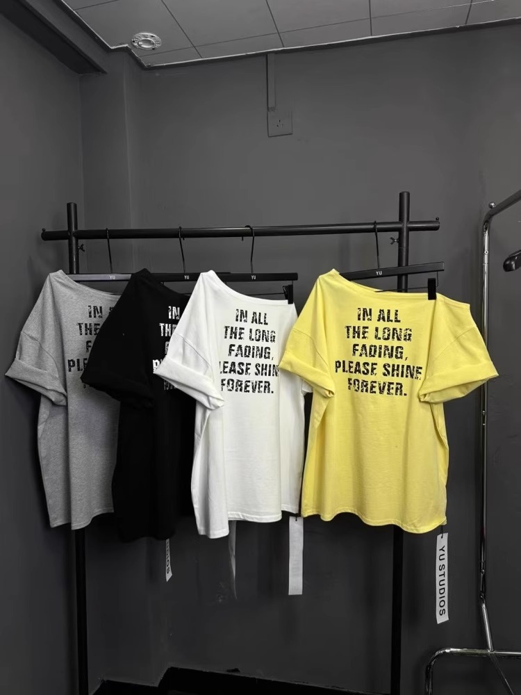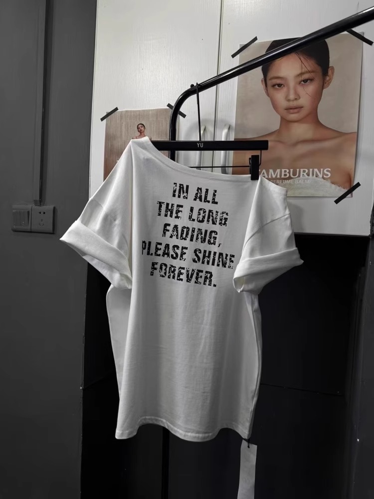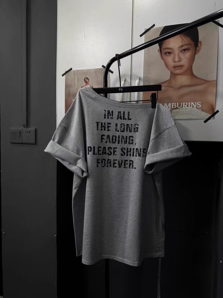 경관 그림 40 순면 220 그램 92 면 8 암모니아 Lun 비스듬한 칼라 오프숄더 오프숄더 반팔 티셔츠 여성 프린트