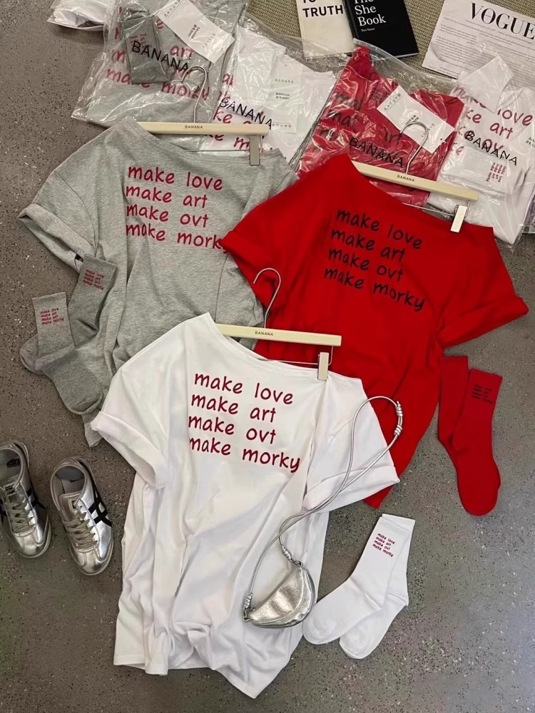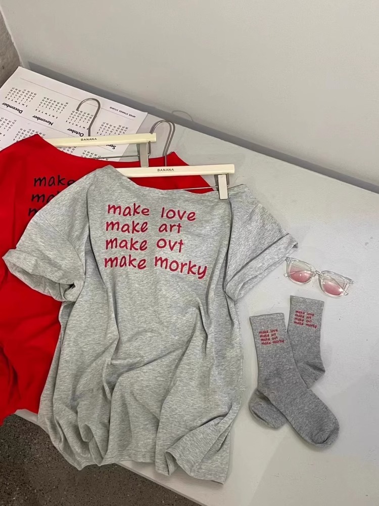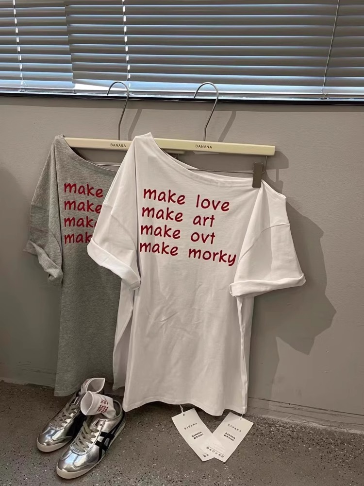 경관 그림 40 순면 220 그램 92 면 8 암모니아 Lun 비스듬한 칼라 오프숄더 오프숄더 반팔 티셔츠 여성 프린트