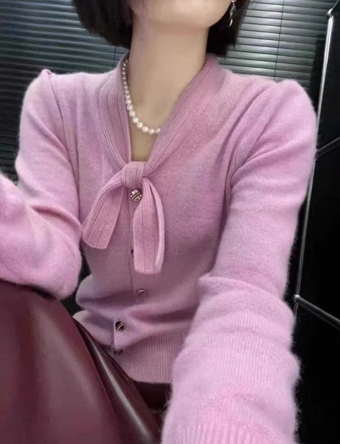 작은 샤넬 스타일 핑크색 숄 V넥 니트 얼음 실크 반팔 티셔츠 여성 여름 슈퍼 잘 생긴 부드러운 고유 한 쇼트 스타일 맨위
