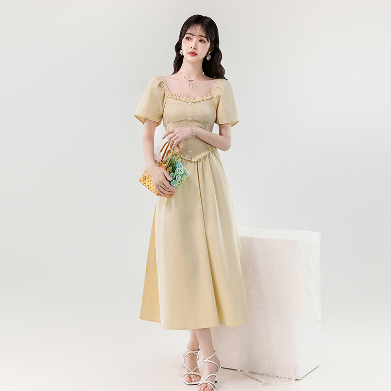 실사 2026 여름 새로운 달콤함 연령 감소 광장 칼라 프릴 하트 버클 신축성 허리 수축 슬림해 보이는 롱 코트 드레스