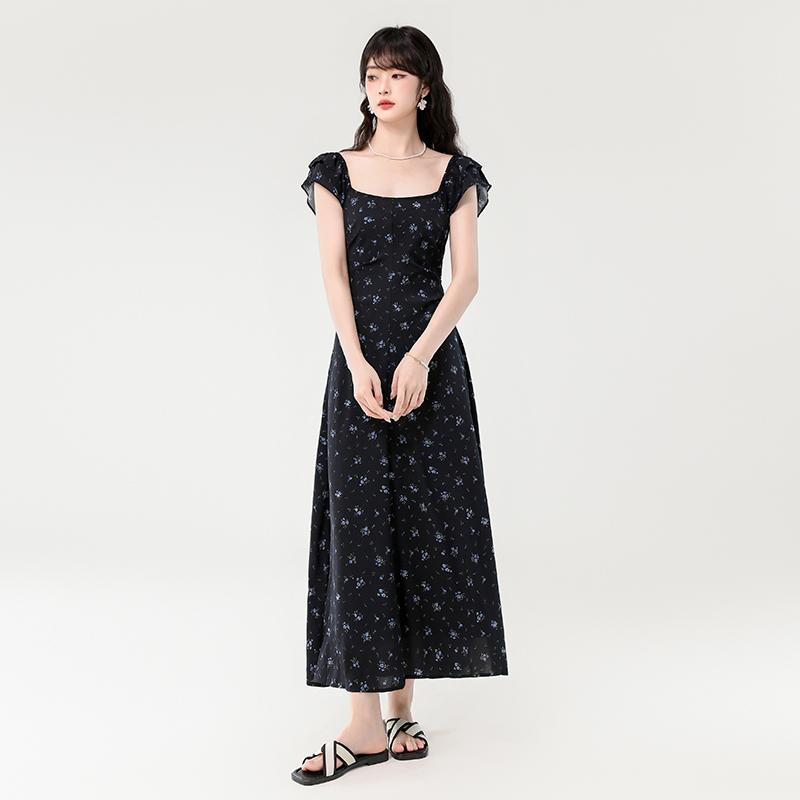 실사 2026 여름 새로운 프랑스식 광장 칼라 작은 날다 소매 롱 코트 슬림해 보이는 프린트 남쪽 법도 가짜 바람 드레스