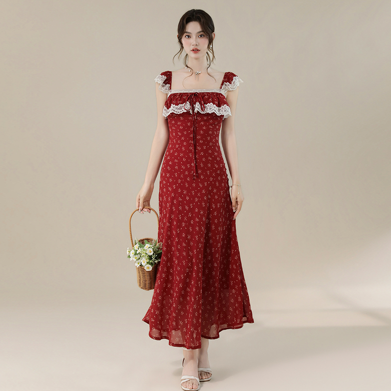 실사 2026 여름 새로운 프랑스식 레이스업 휴가 바람 허리 수축 슬림해 보이는 롱 코트 쉬폰 꽃무늬 슬립 드레스