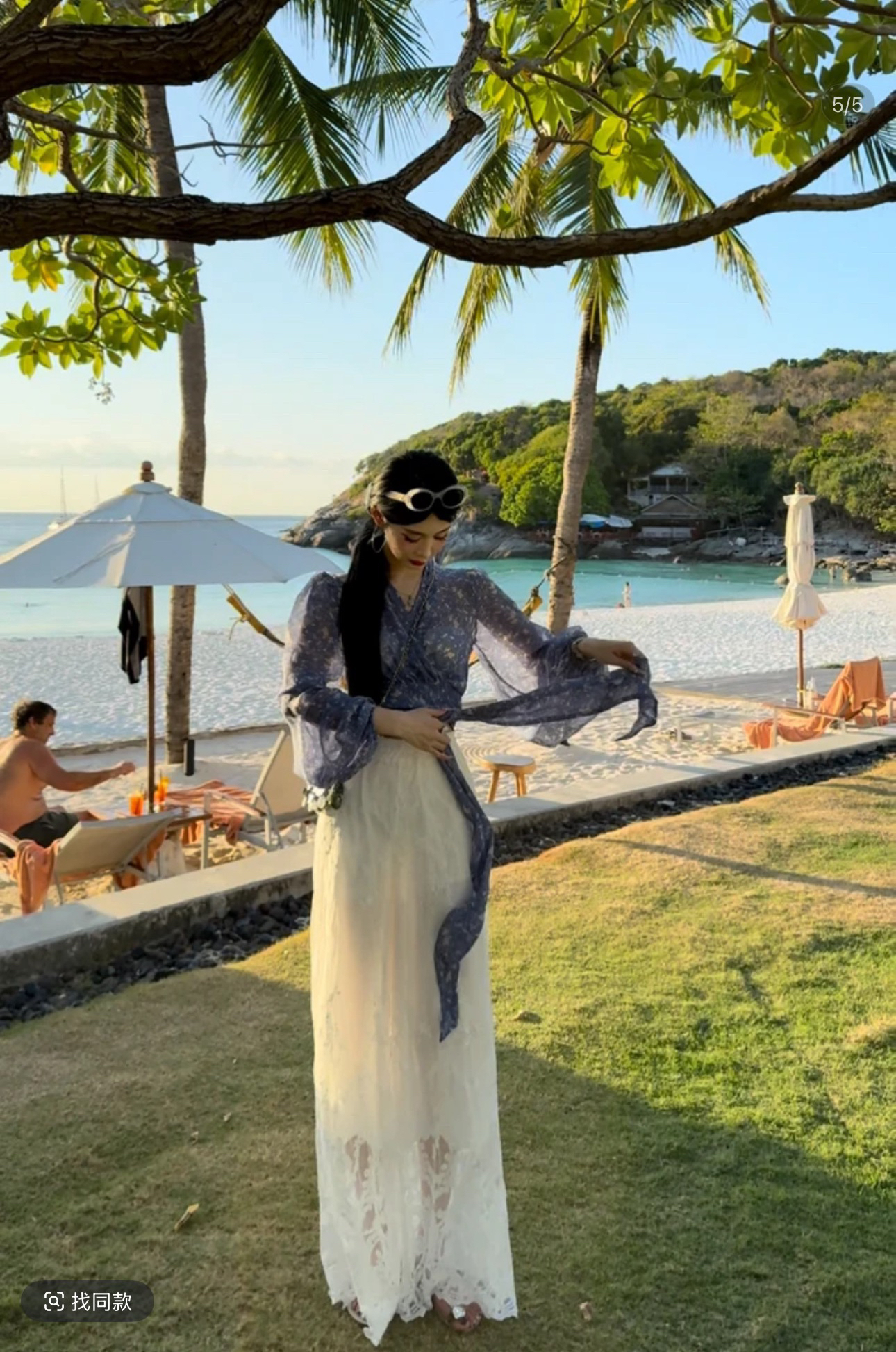 xu jing 블루 꽃무늬 스트랩 쉬폰 톱 화이트 레이스 긴 바지 여름 슬림해 보이는 품격 세트