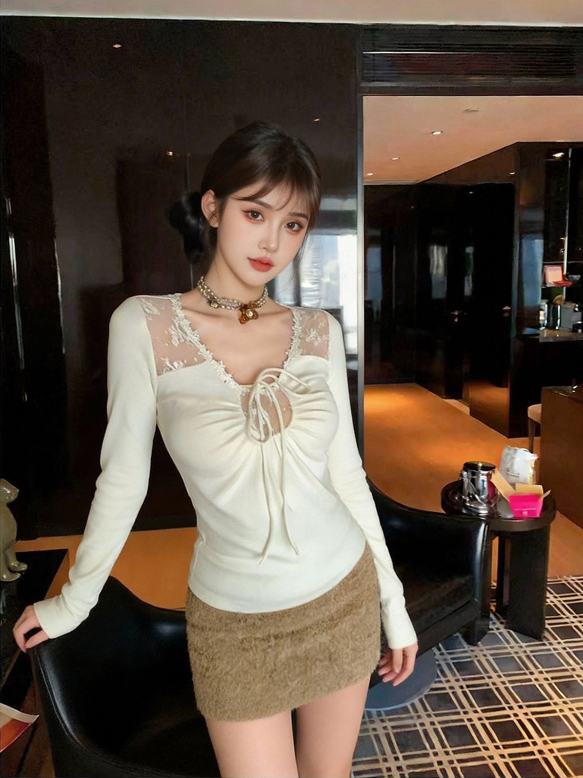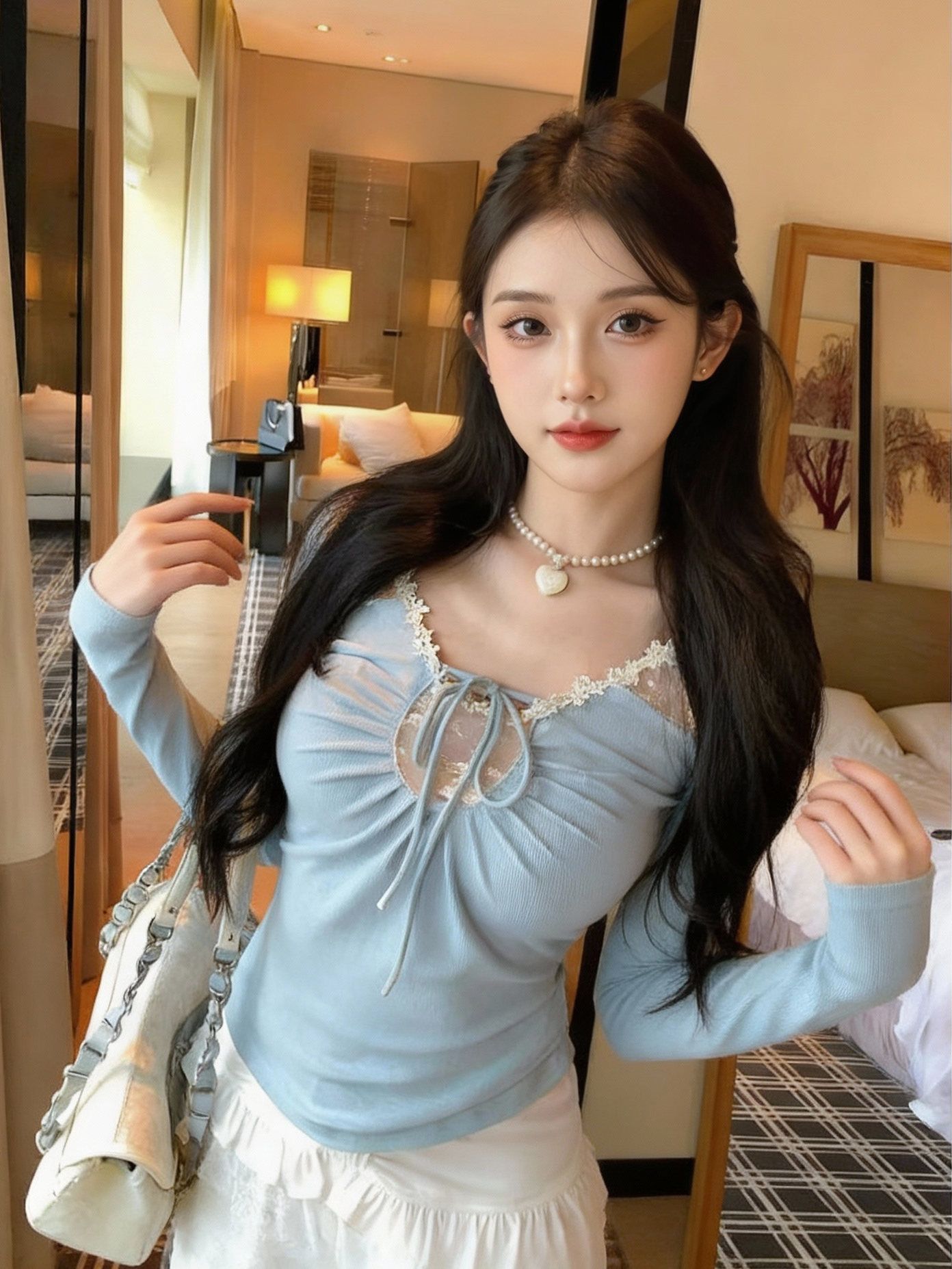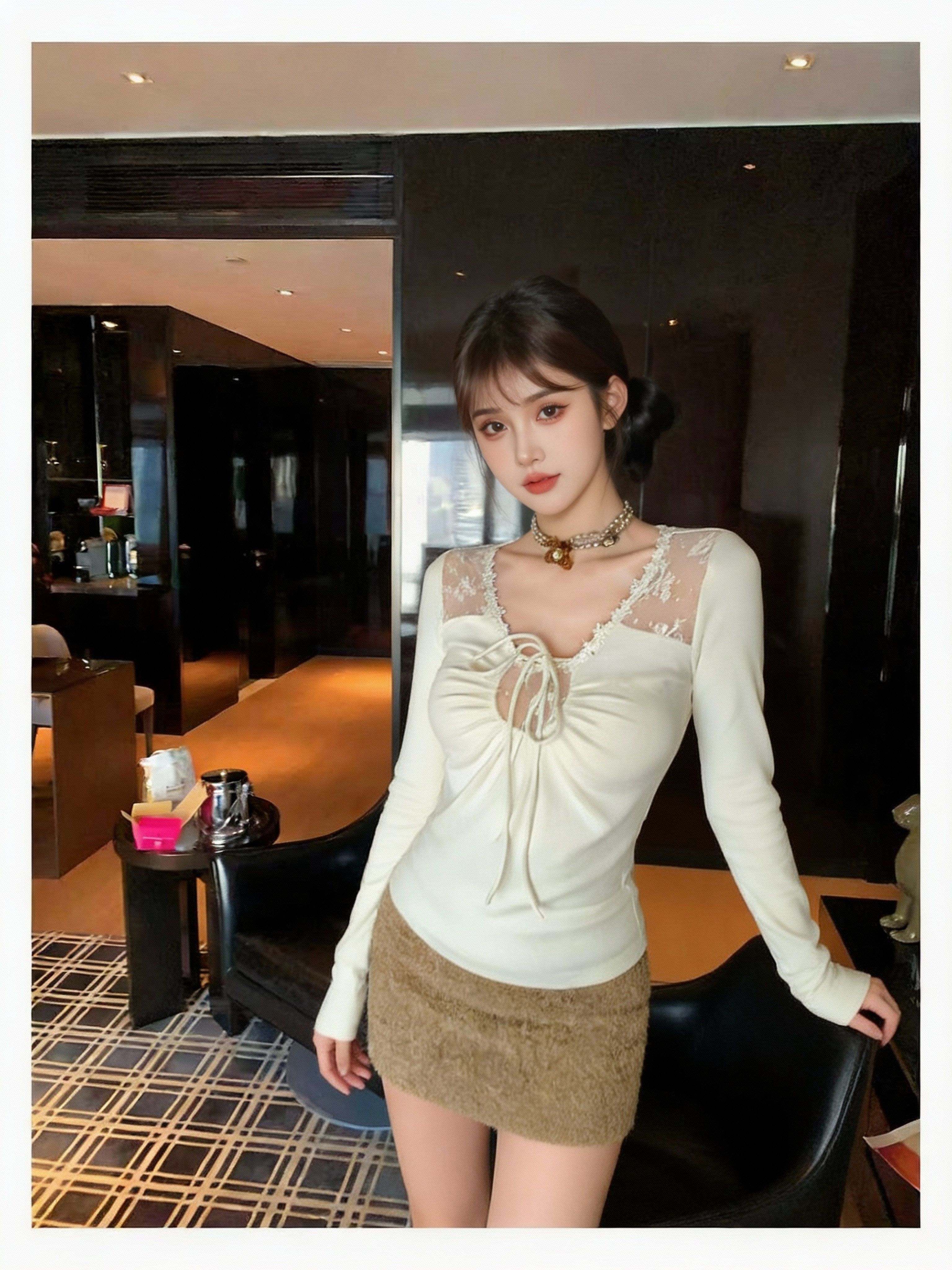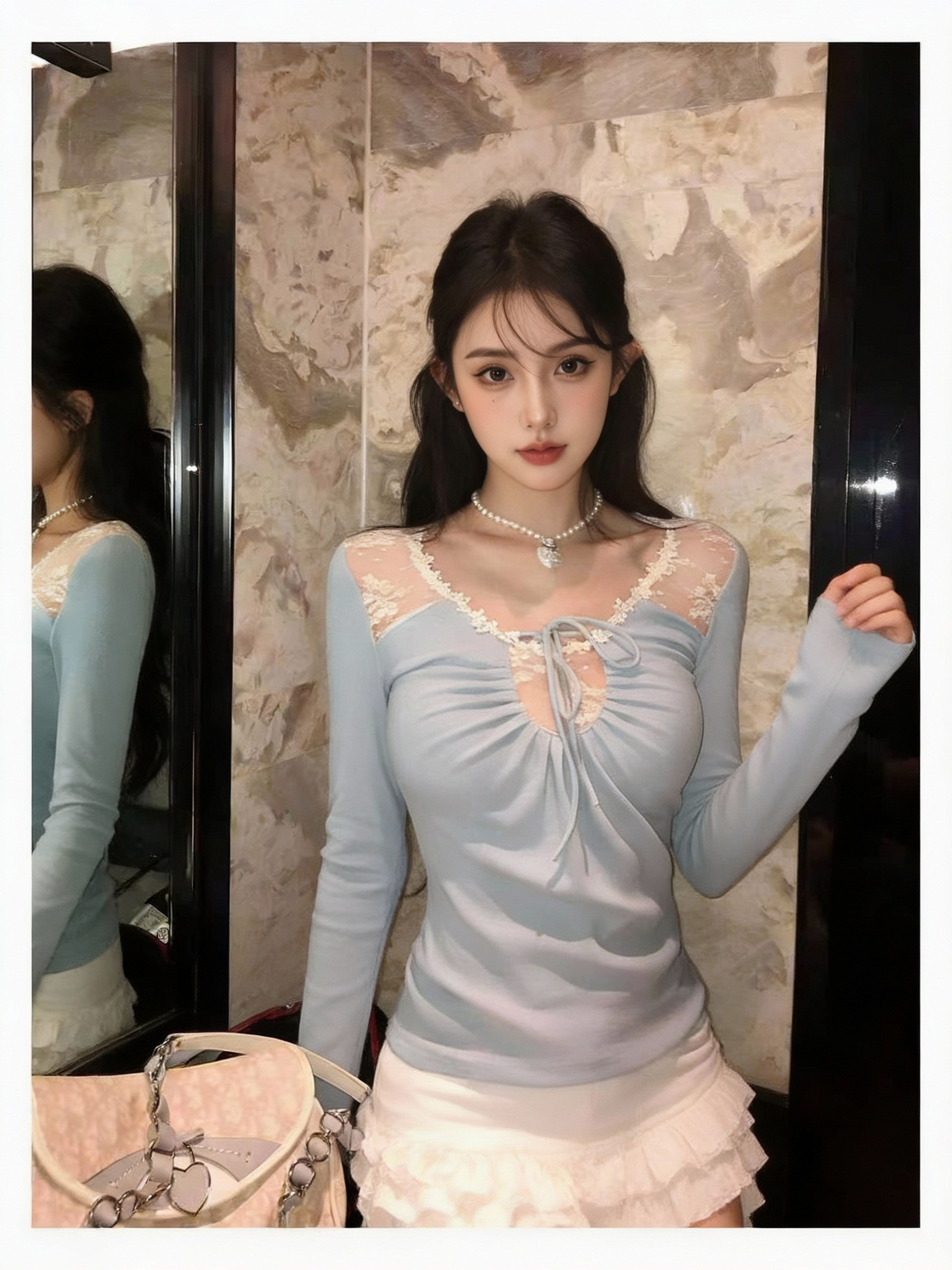 감기 센스 레이스 홀로우 아웃 해체 패치워크 자카드 몸매 가꾸기 인사이드 가져 가라. 긴팔 티셔츠 기본 셔츠