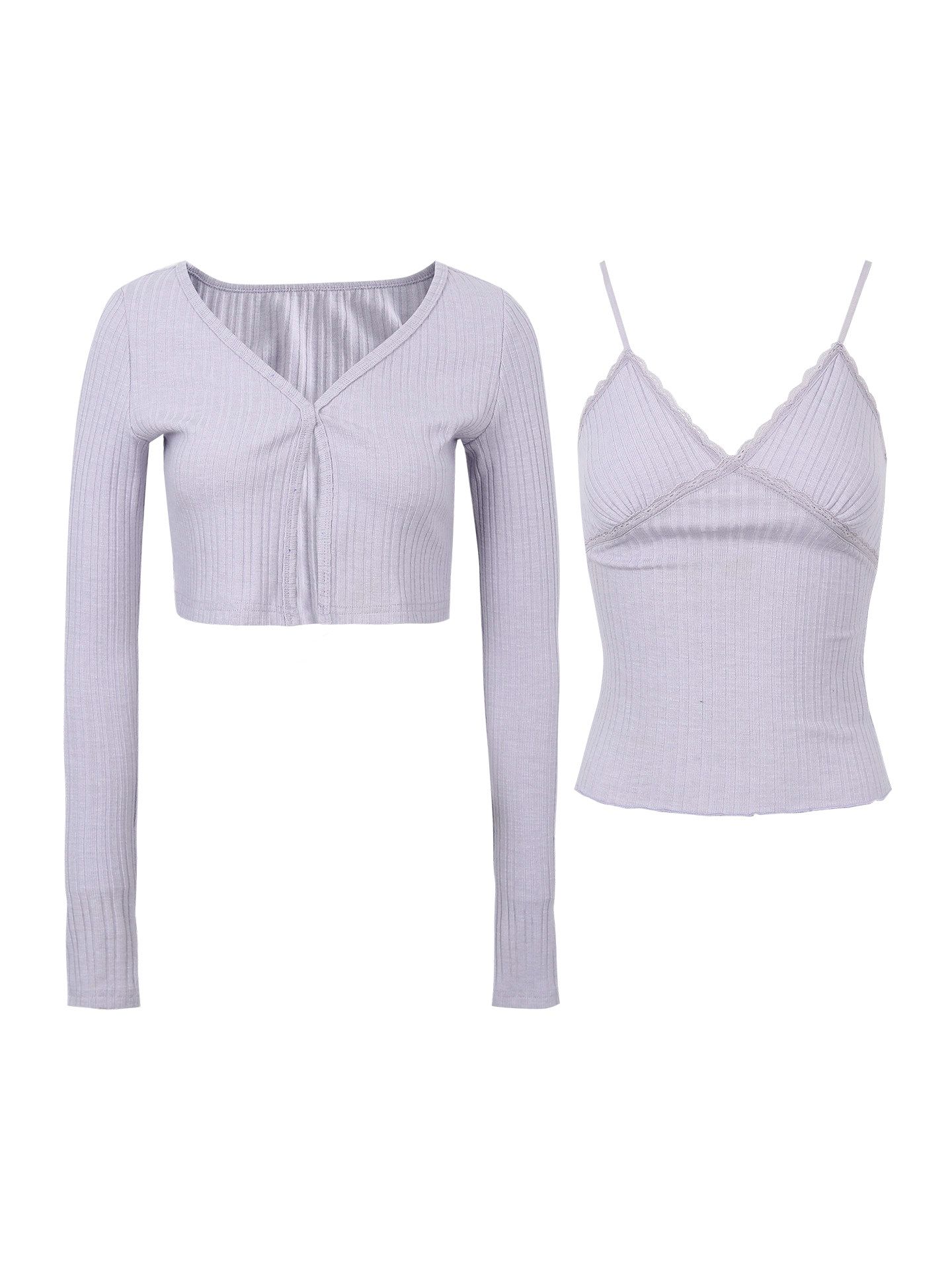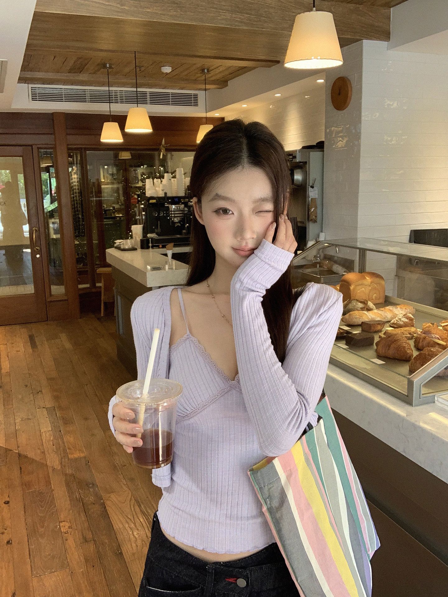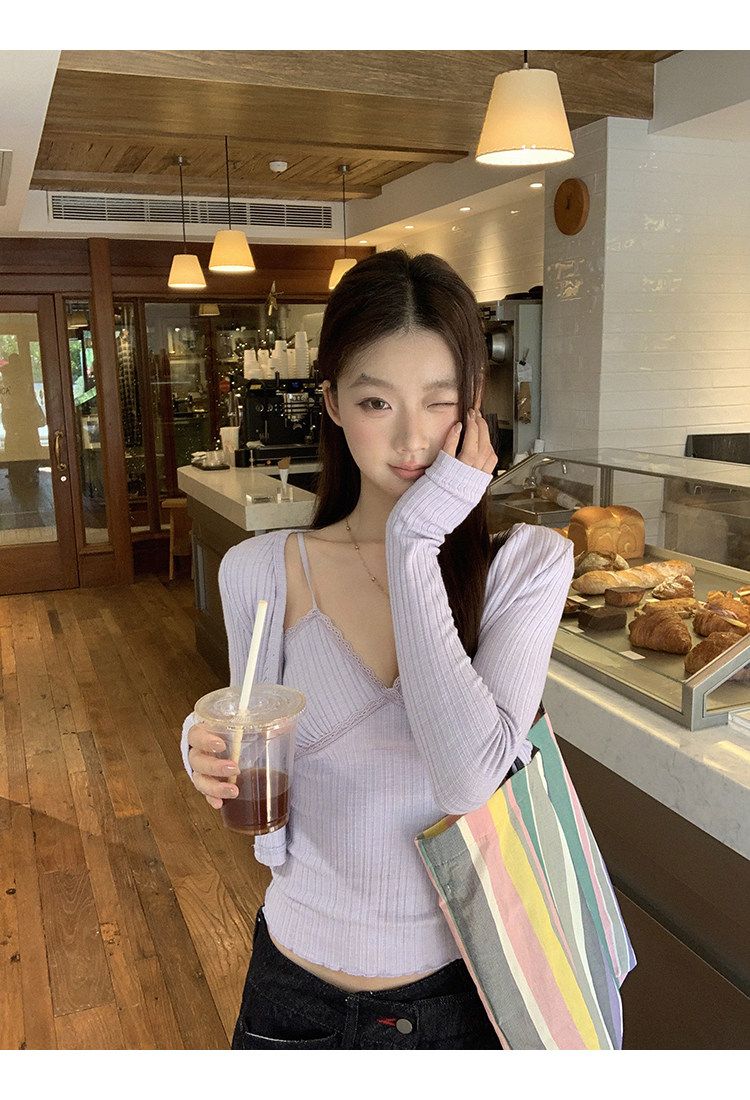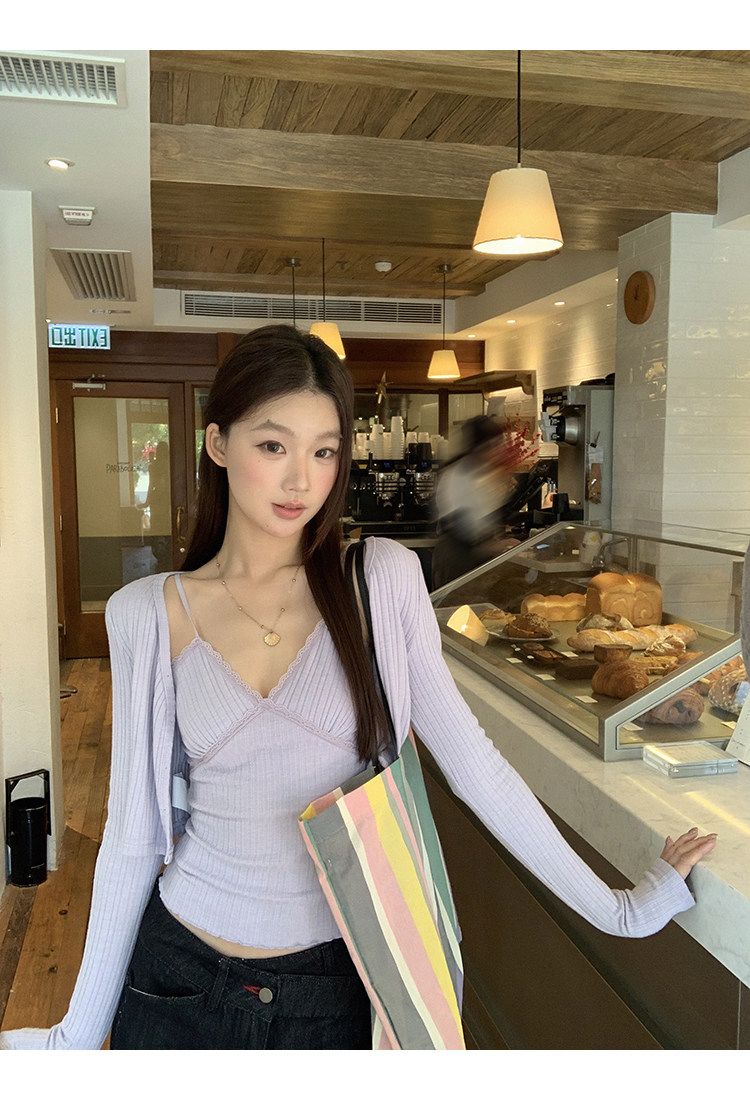 핫걸 세트 보라색 니트 오픈 가디건 여성 코트 여름 새로운 인사이드 가져 가라. 레이스 캐미솔 투피스 세트
