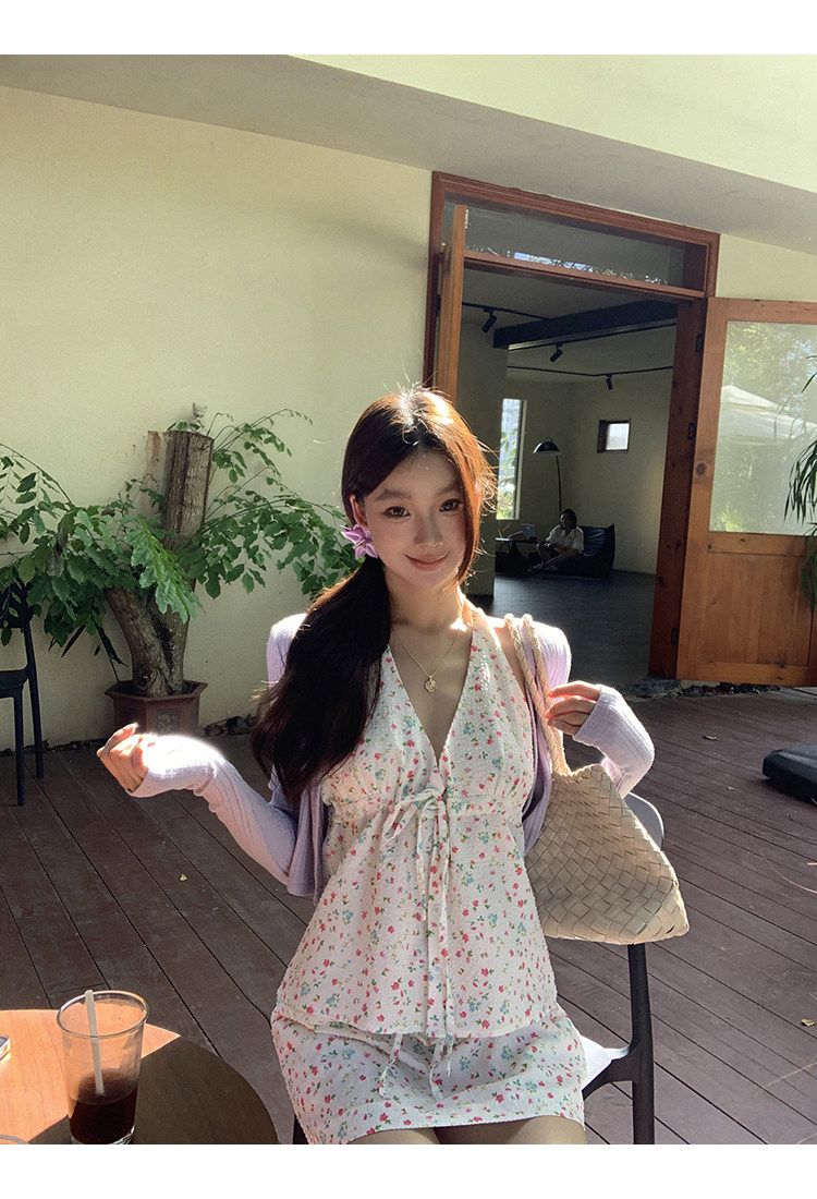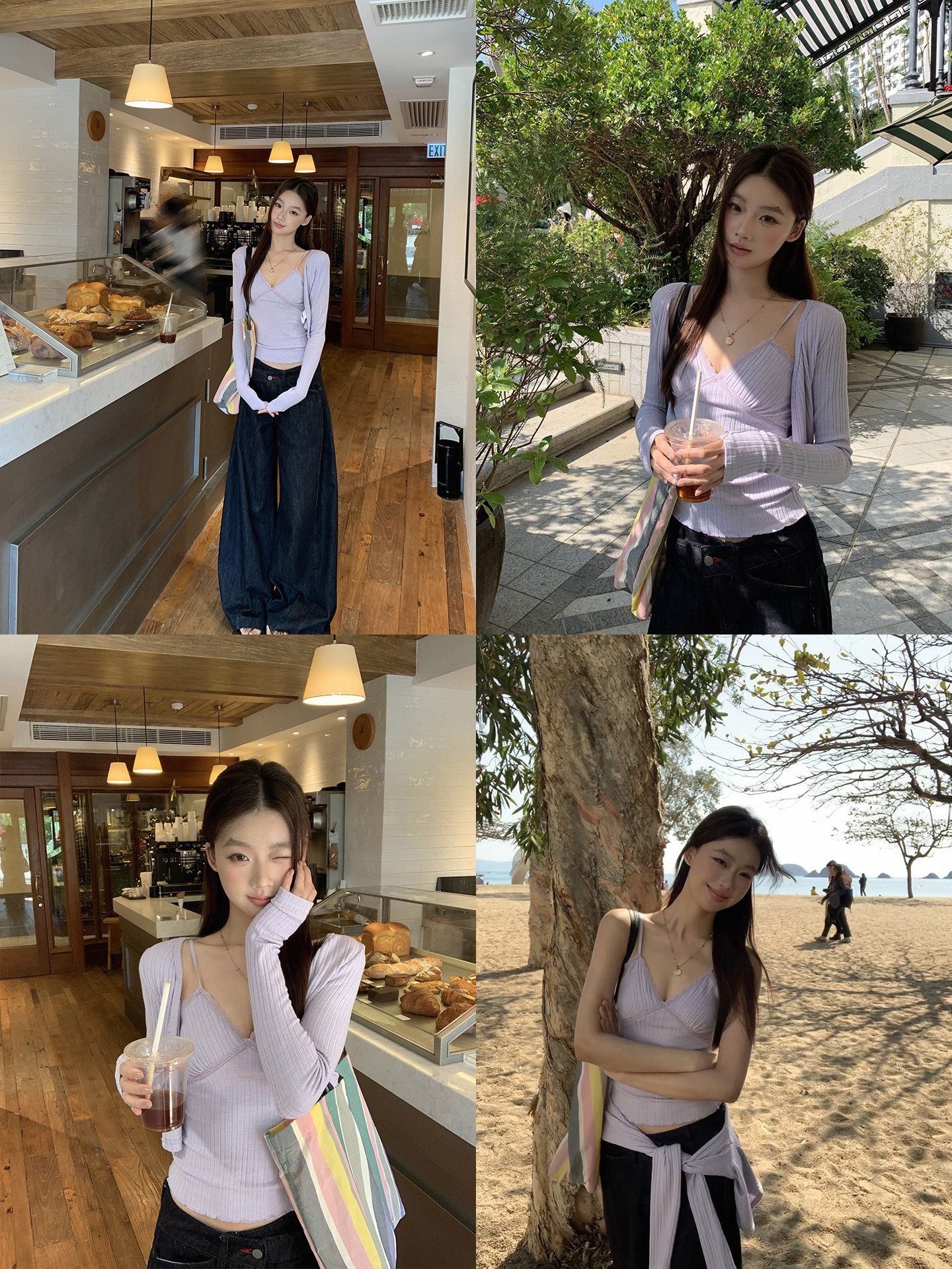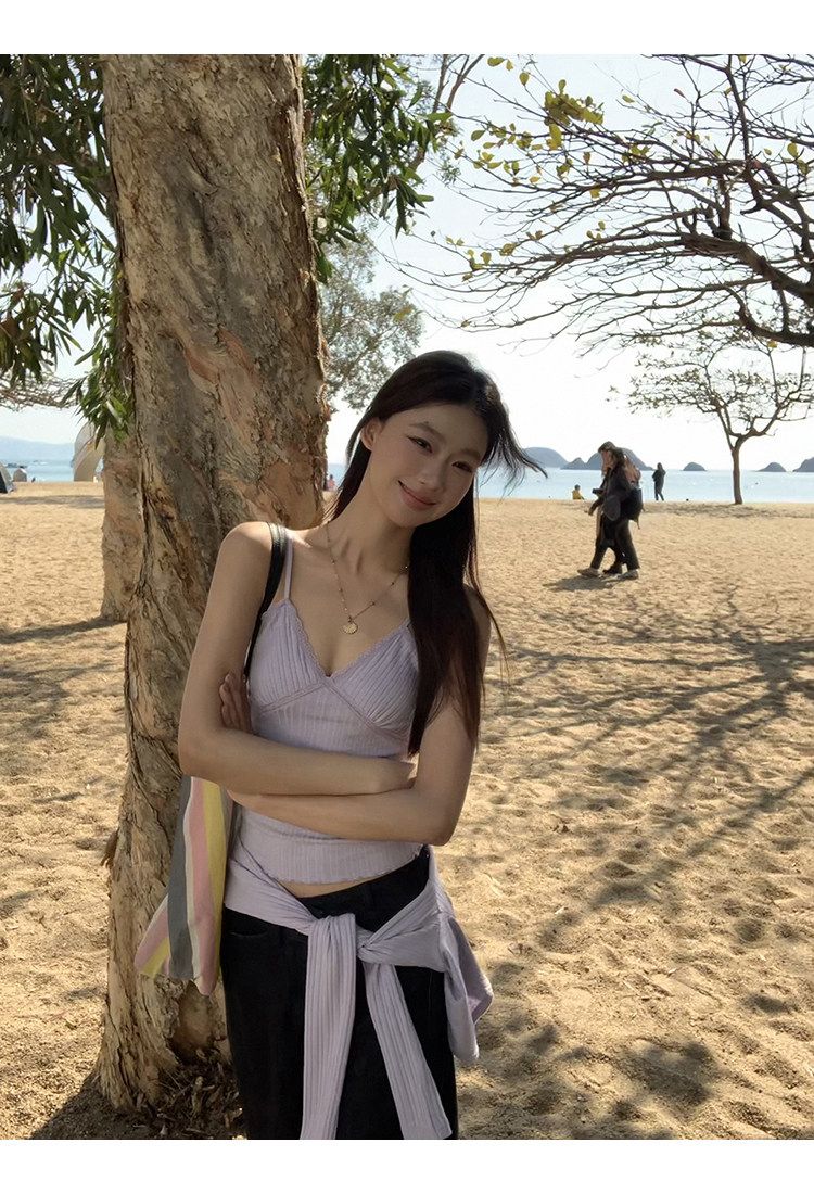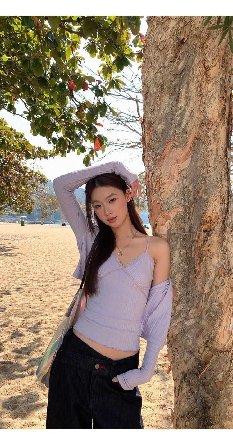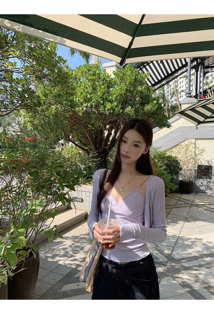 핫걸 세트 보라색 니트 오픈 가디건 여성 코트 여름 새로운 인사이드 가져 가라. 레이스 캐미솔 투피스 세트