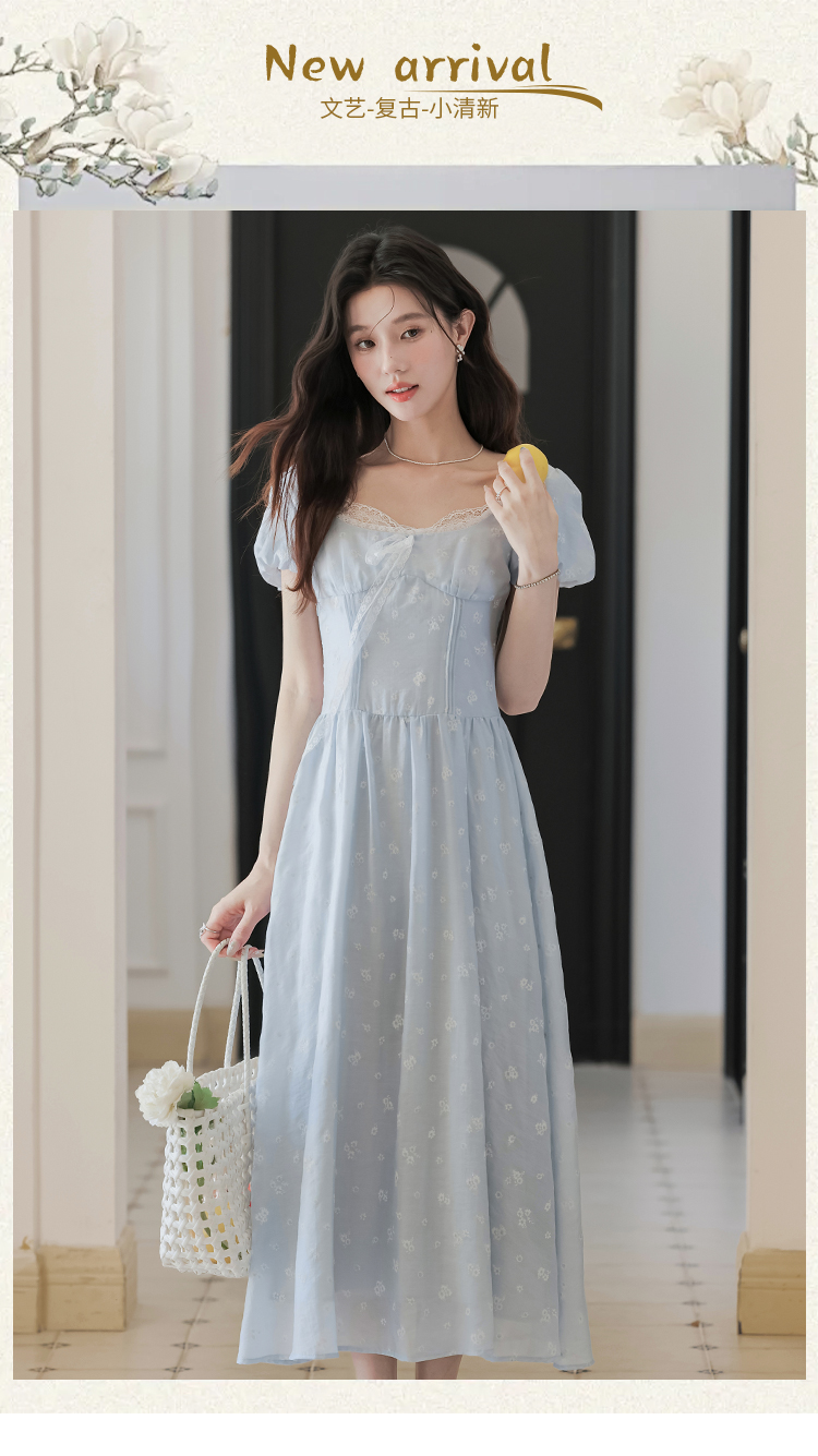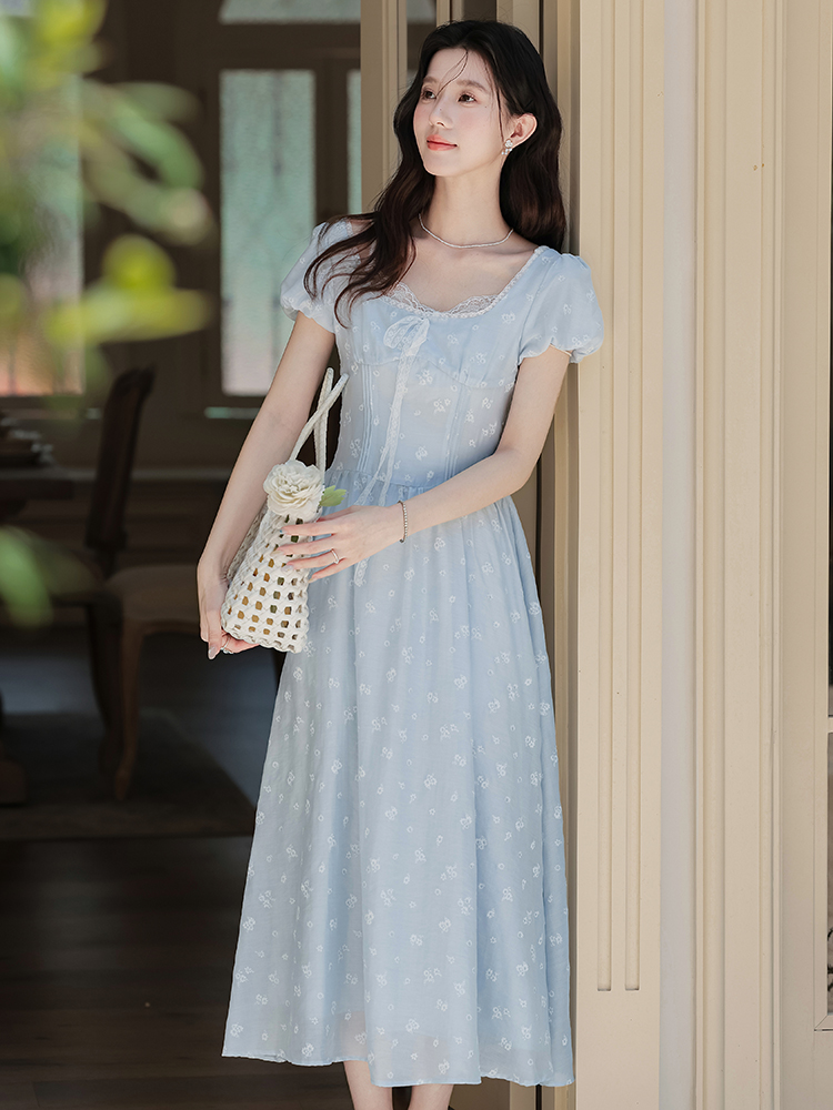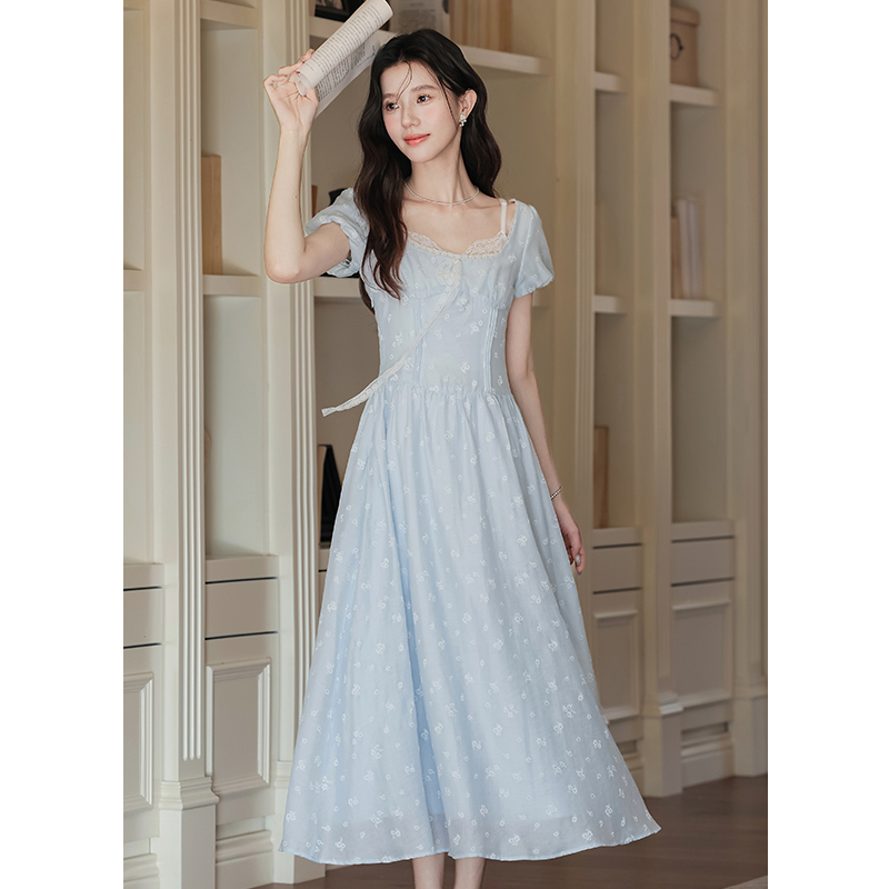 2026 여름 새로운 블루 바닥 작은 꽃무늬 광장 칼라 여성 드레스 고급 센스 허리 수축 한 마디 반팔 롱 스커트