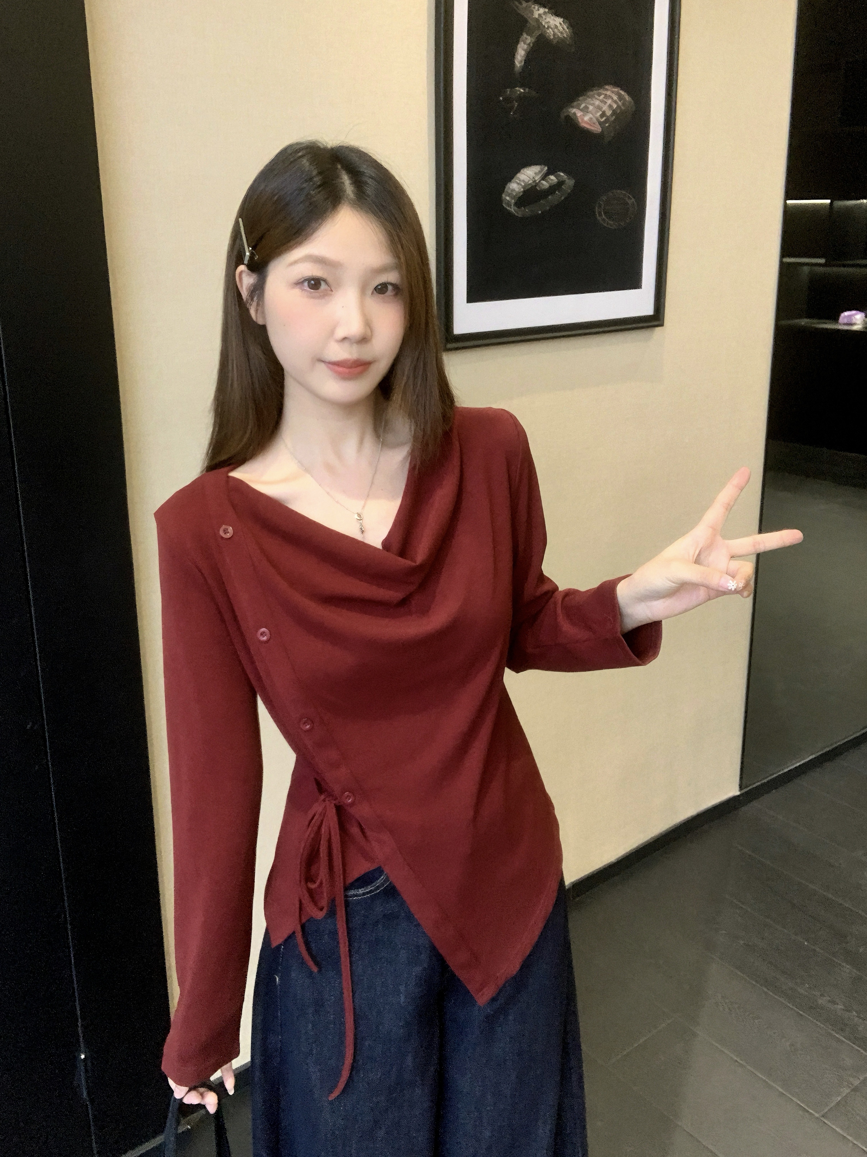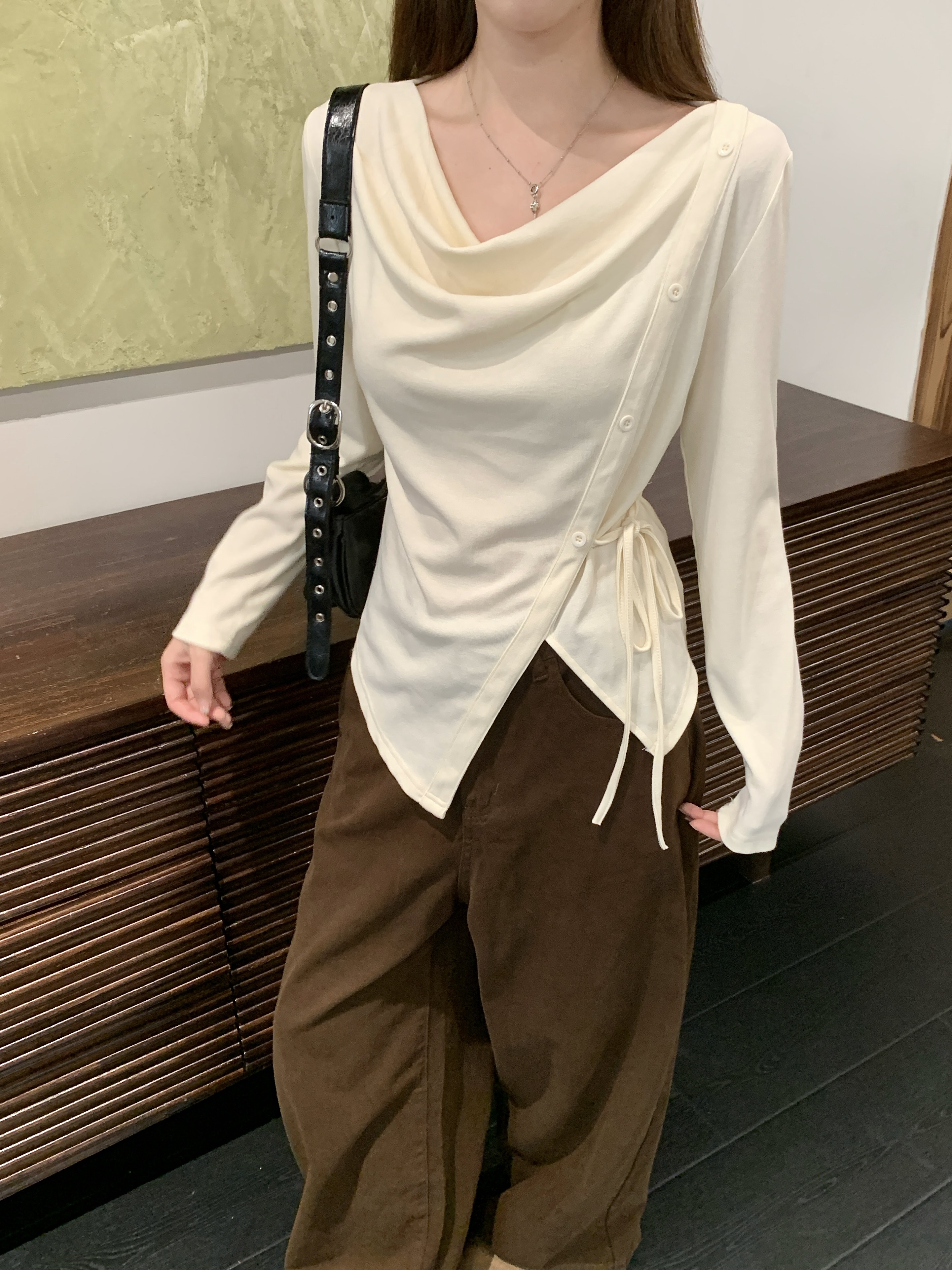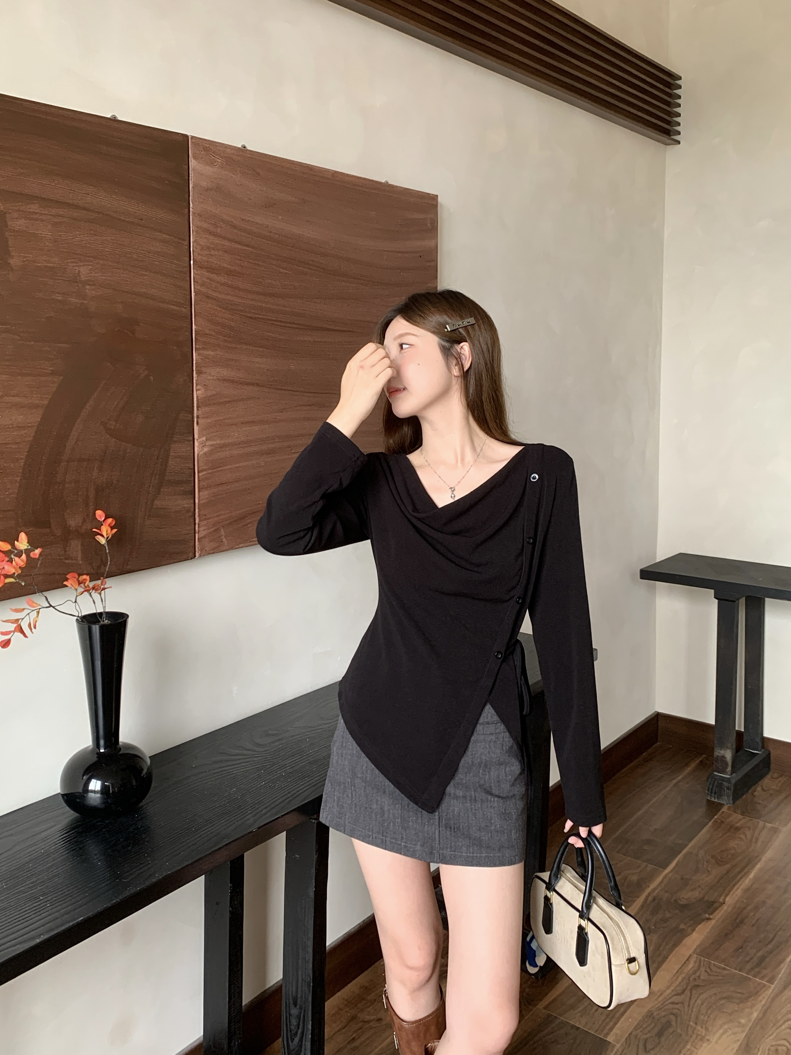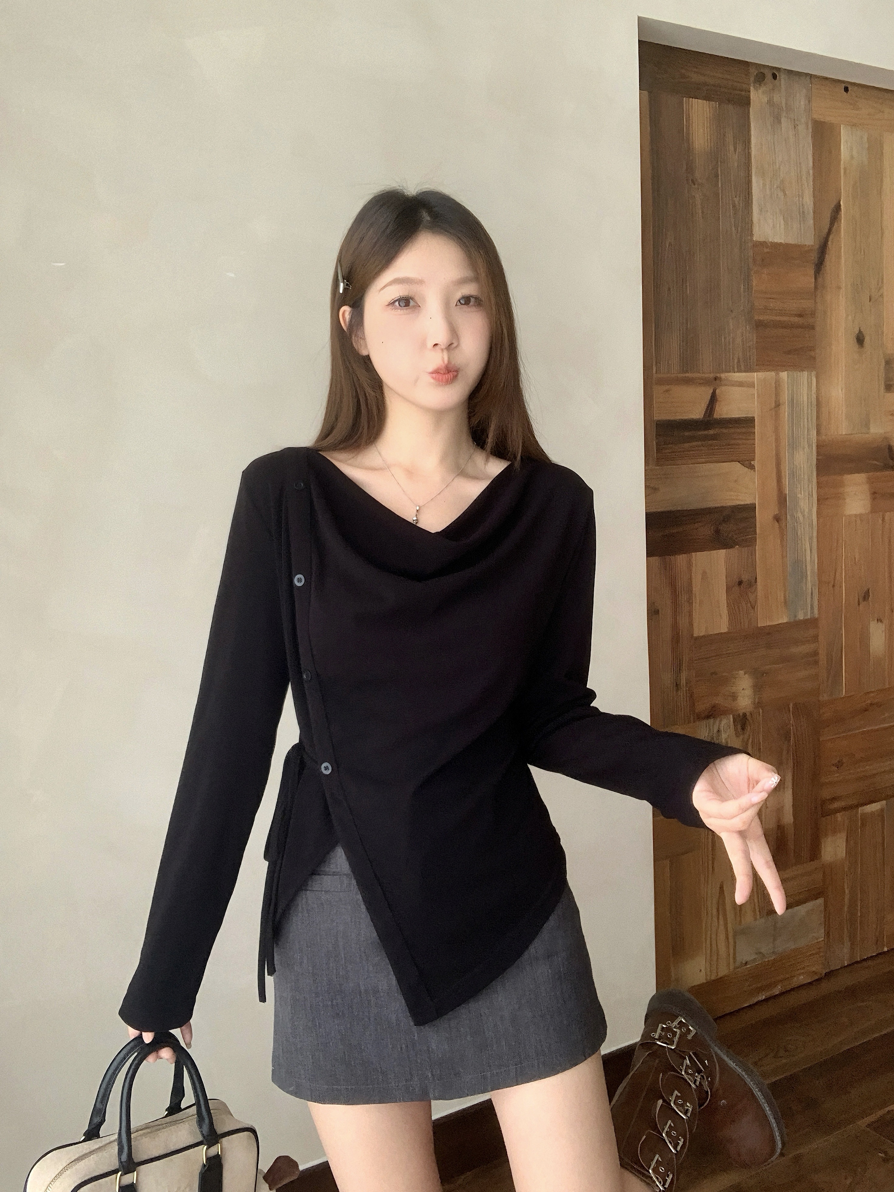 실사 2026 봄 드레스 새로운 지방 mm 빅 사이즈 여성 불규칙 흔들다 칼라 긴팔 티셔츠 프랑스식 품격 스트랩 맨위