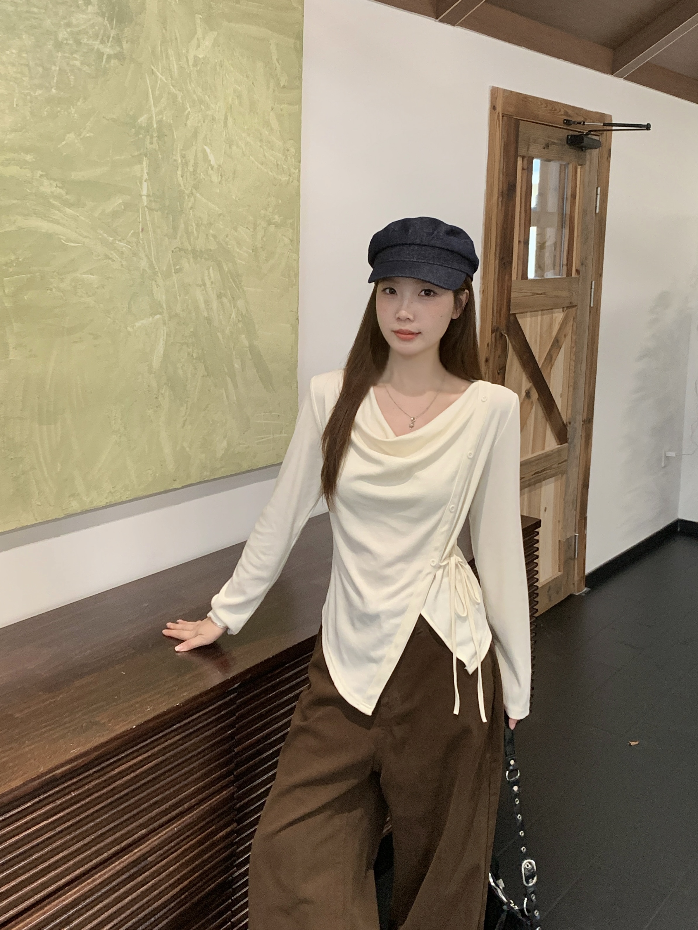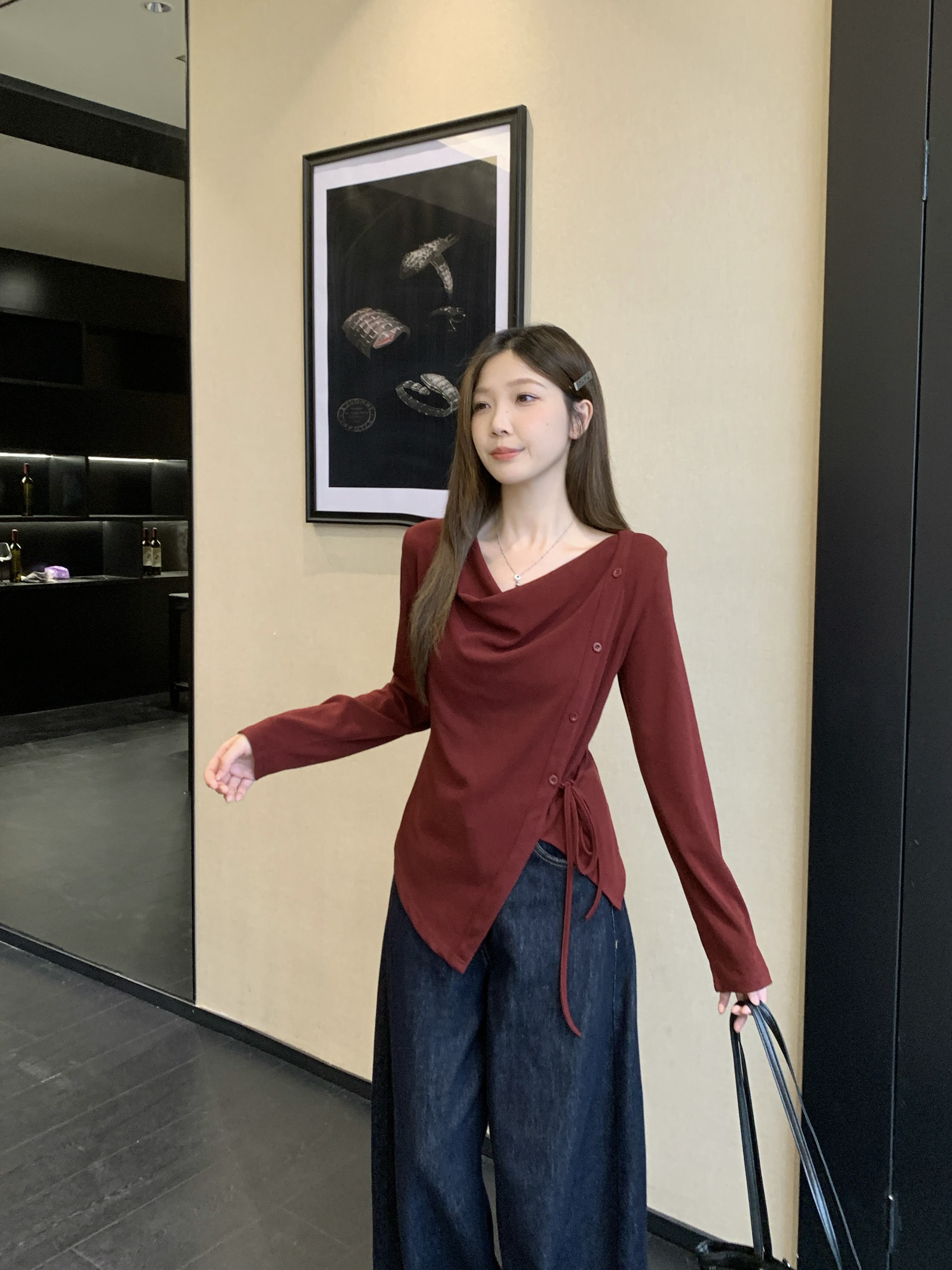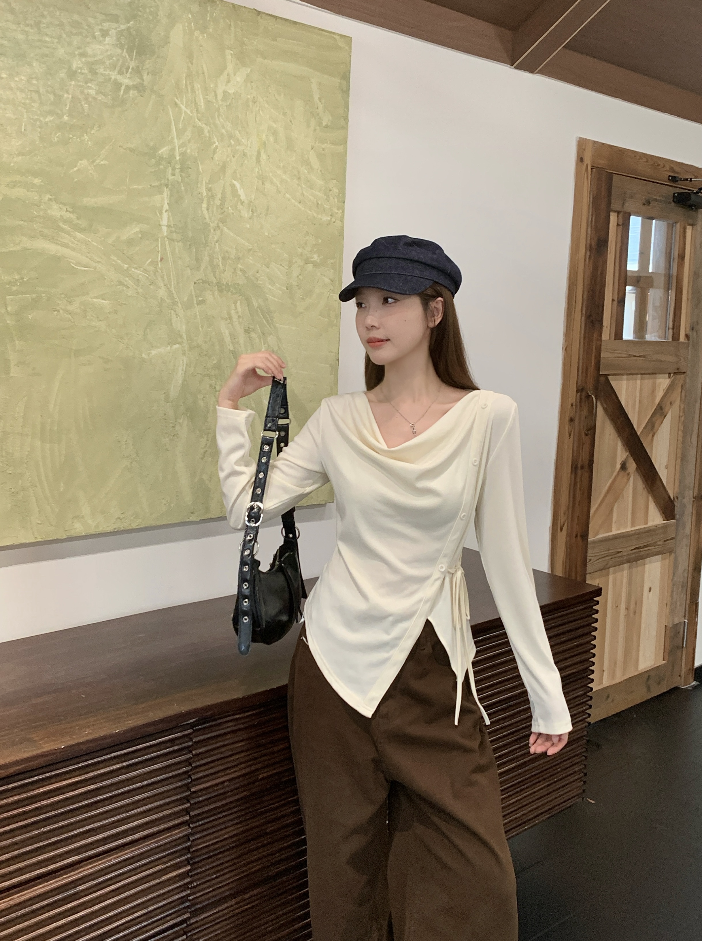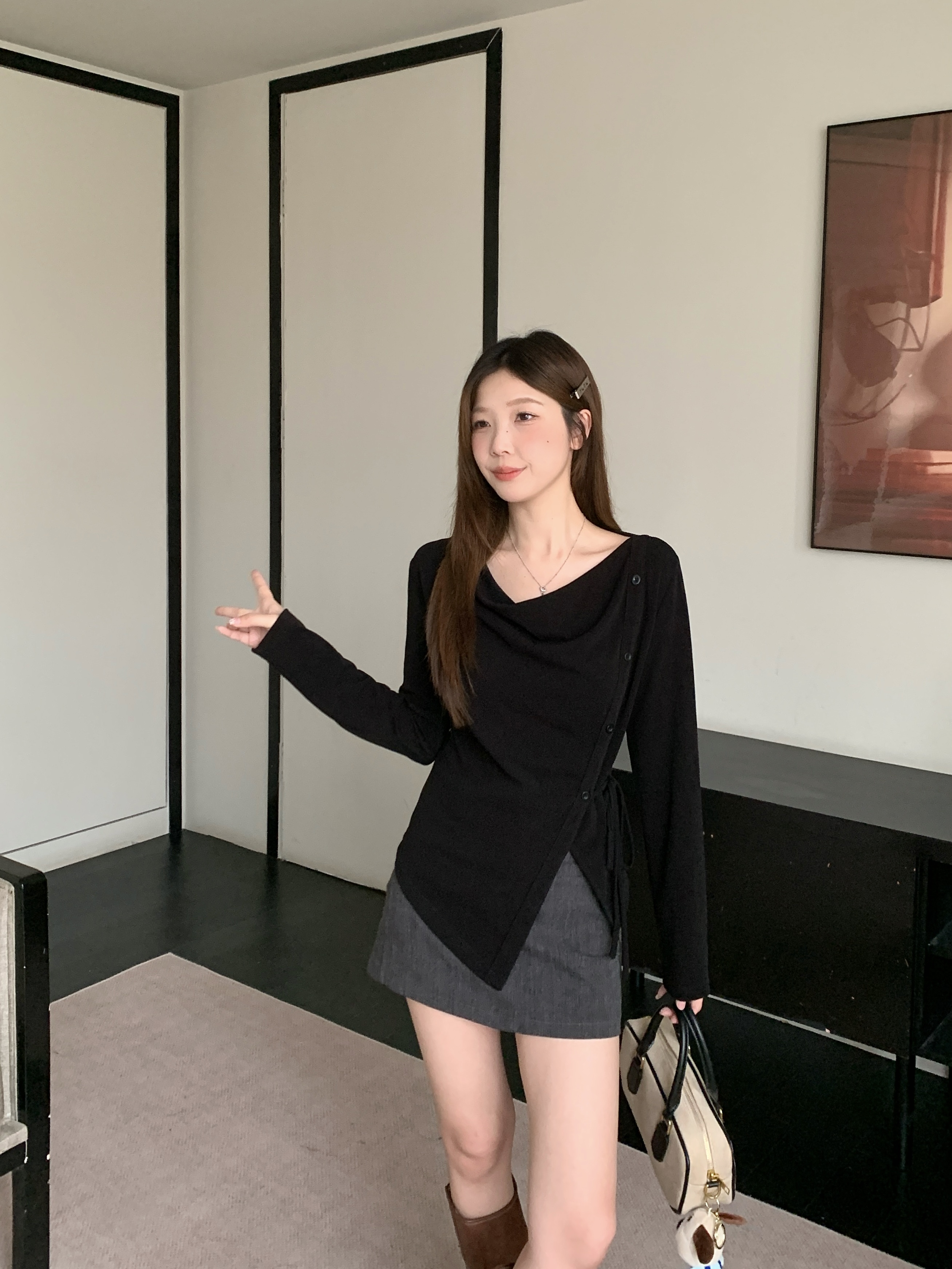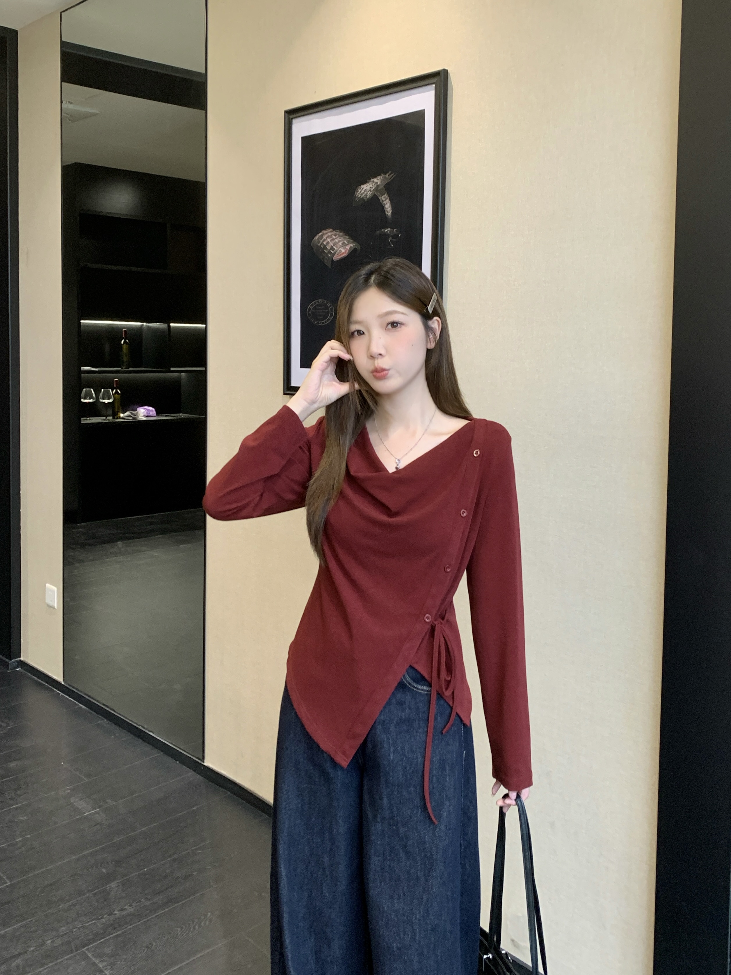 실사 2026 봄 드레스 새로운 지방 mm 빅 사이즈 여성 불규칙 흔들다 칼라 긴팔 티셔츠 프랑스식 품격 스트랩 맨위