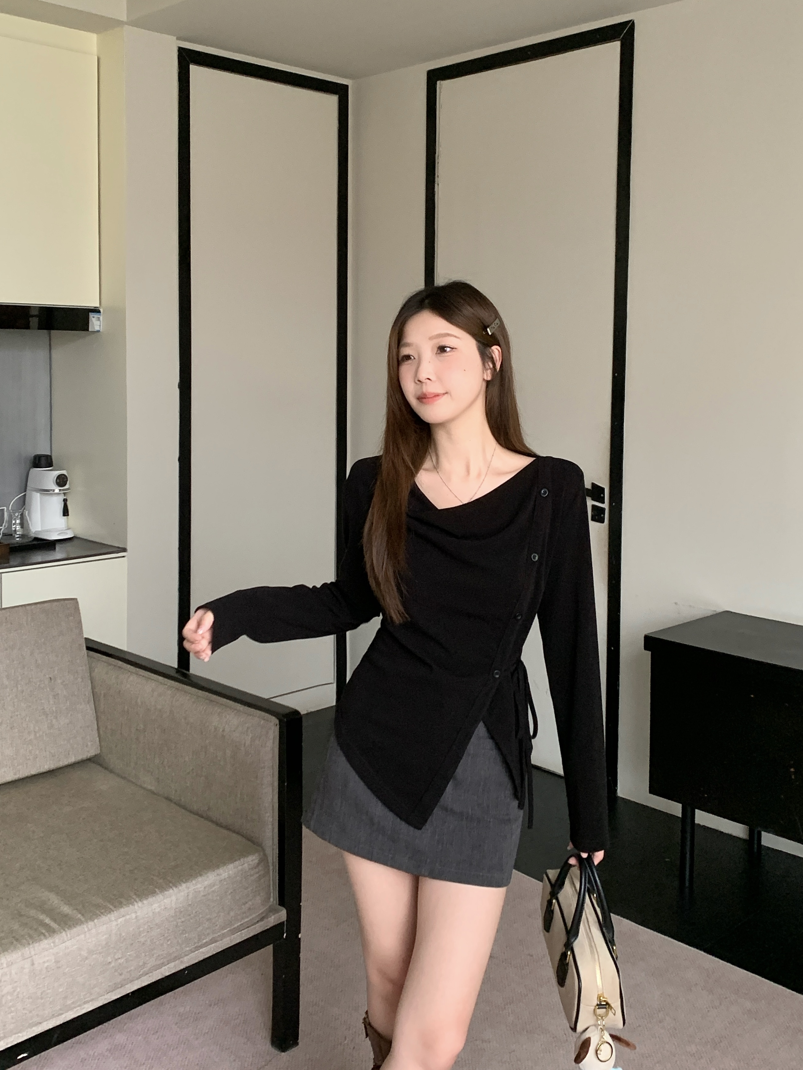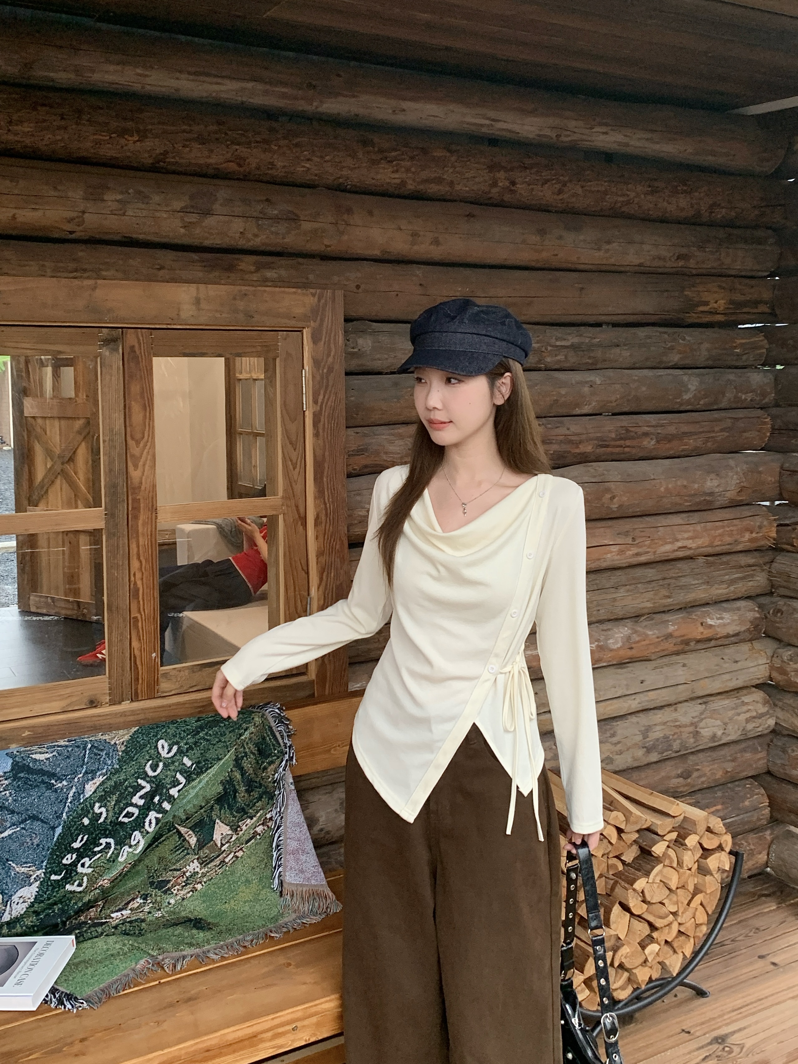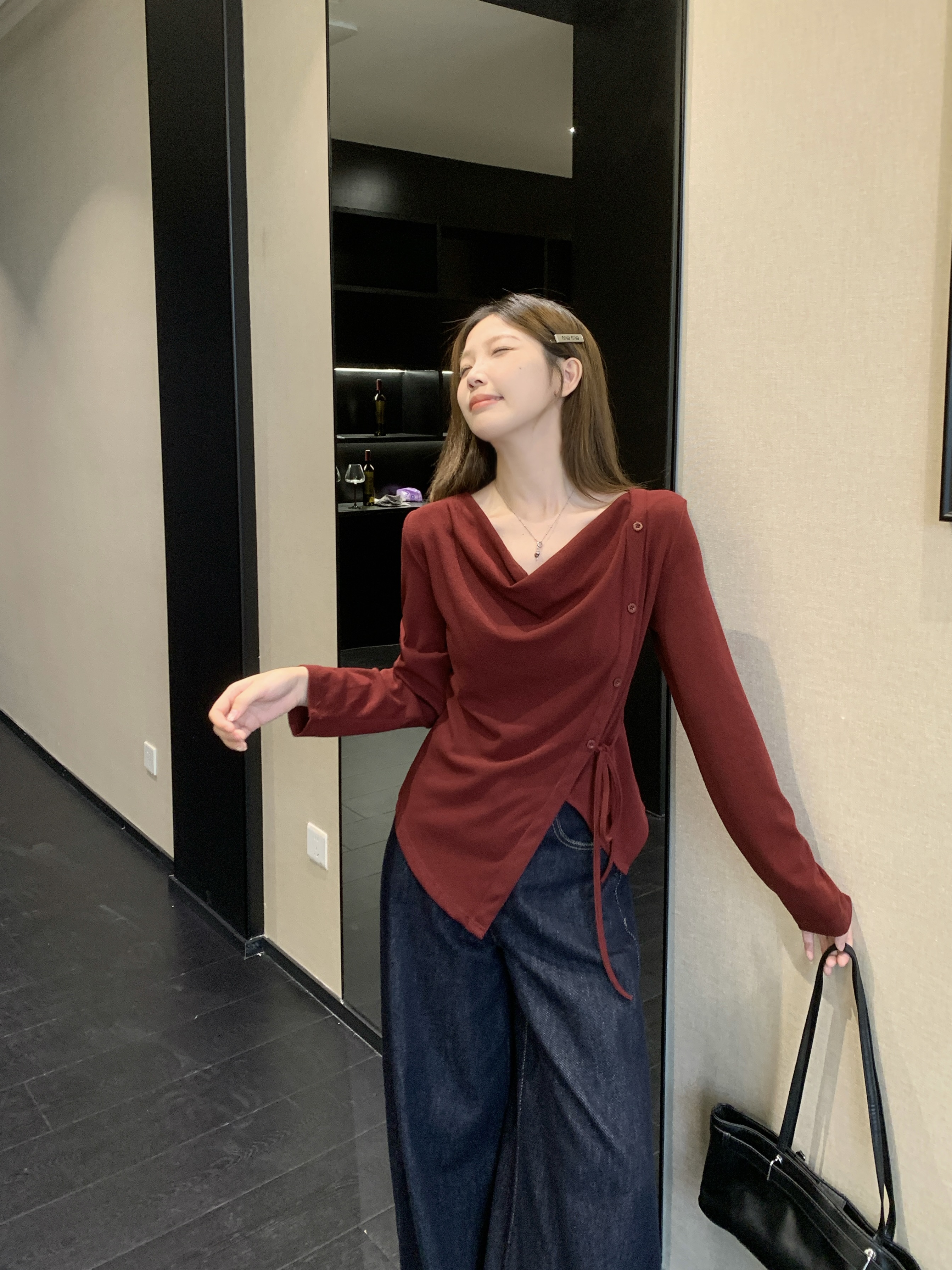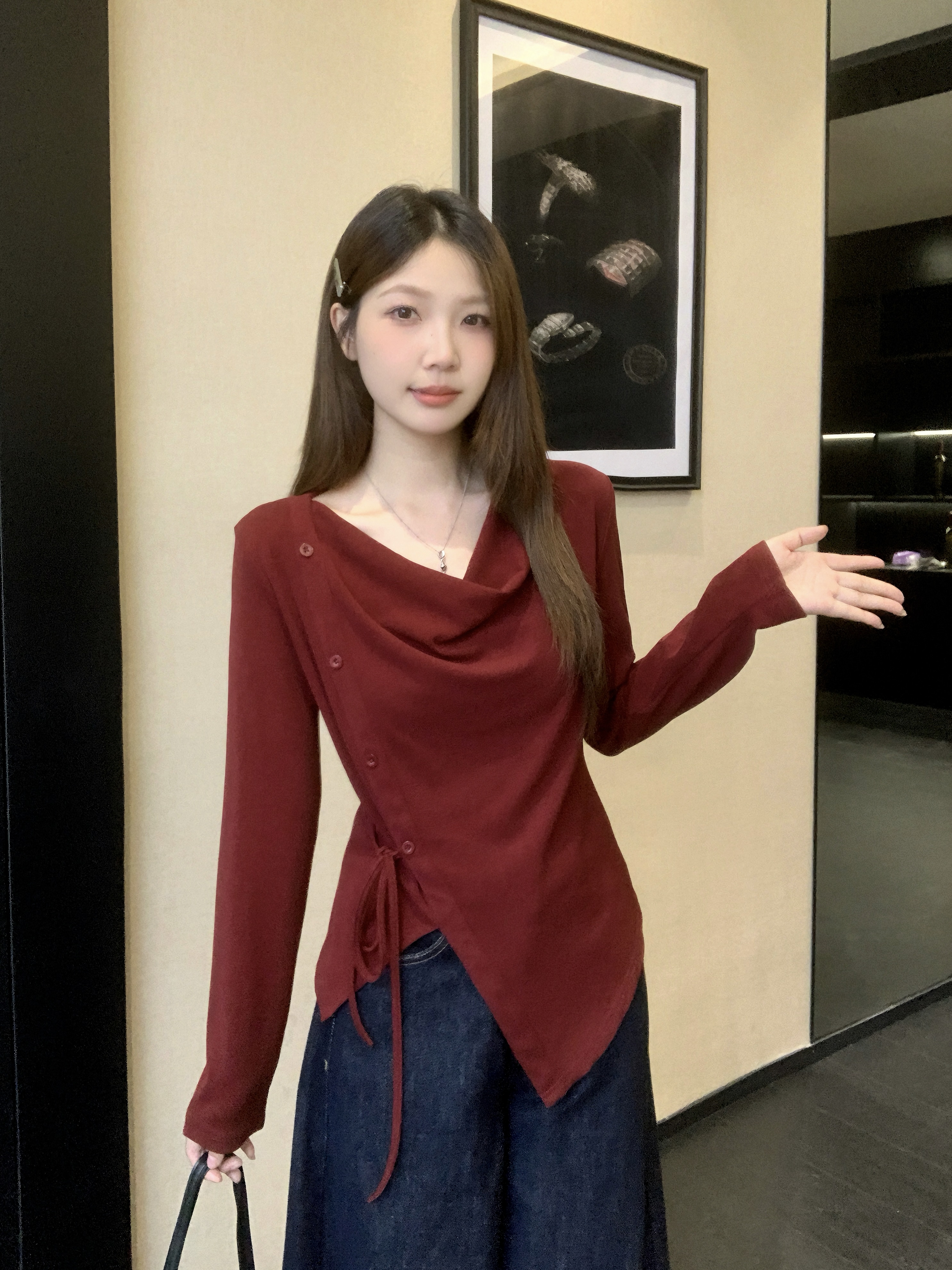 실사 2026 봄 드레스 새로운 지방 mm 빅 사이즈 여성 불규칙 흔들다 칼라 긴팔 티셔츠 프랑스식 품격 스트랩 맨위