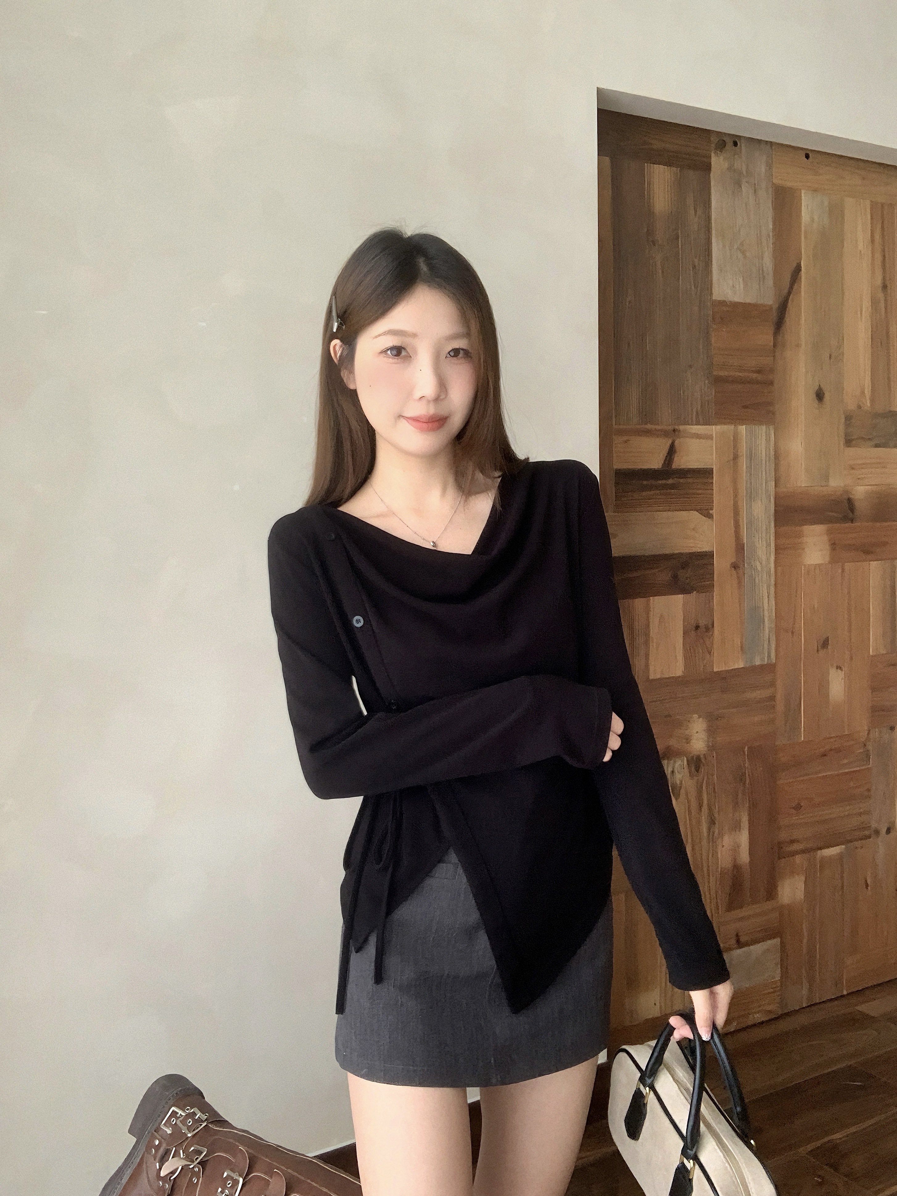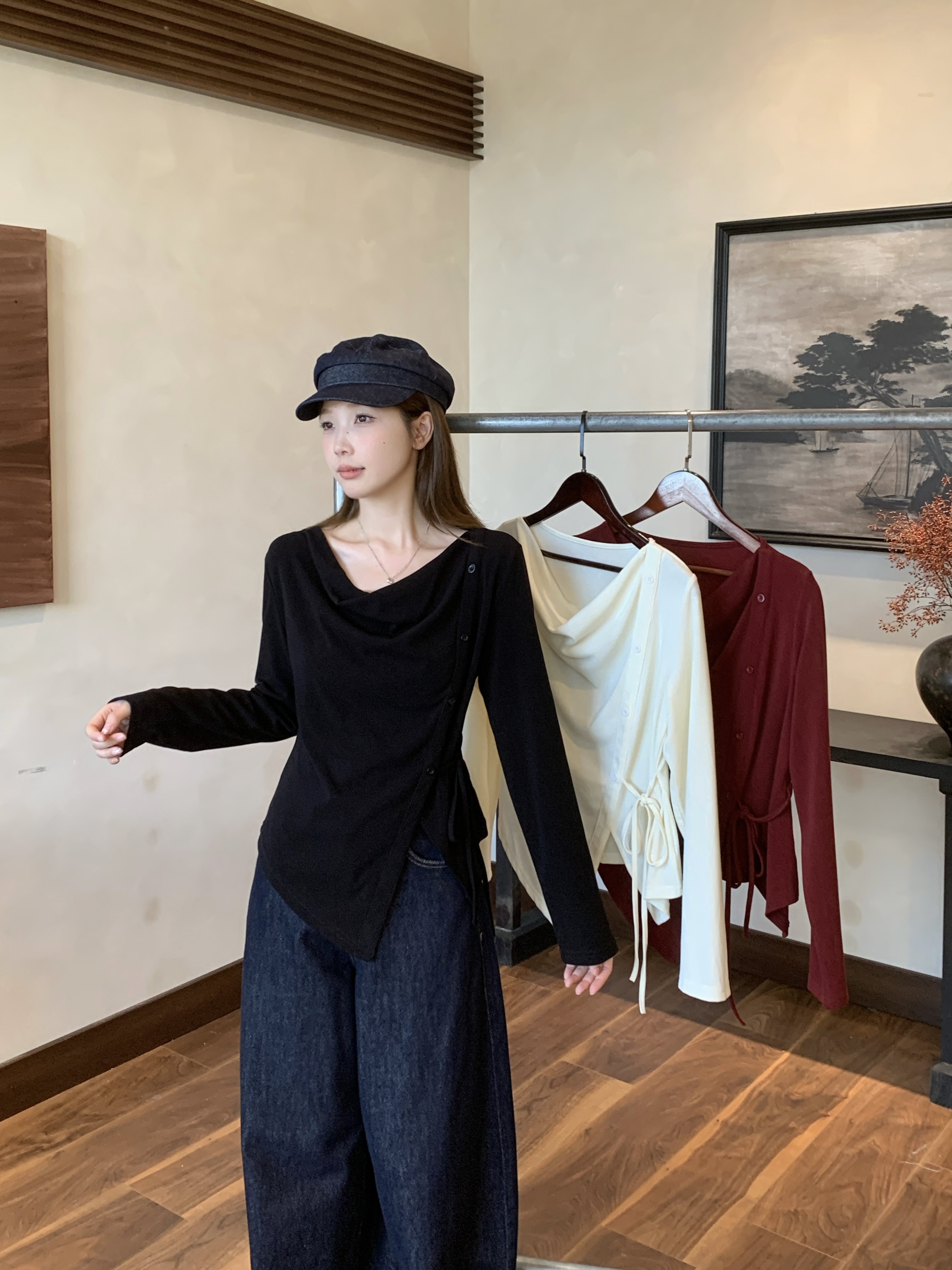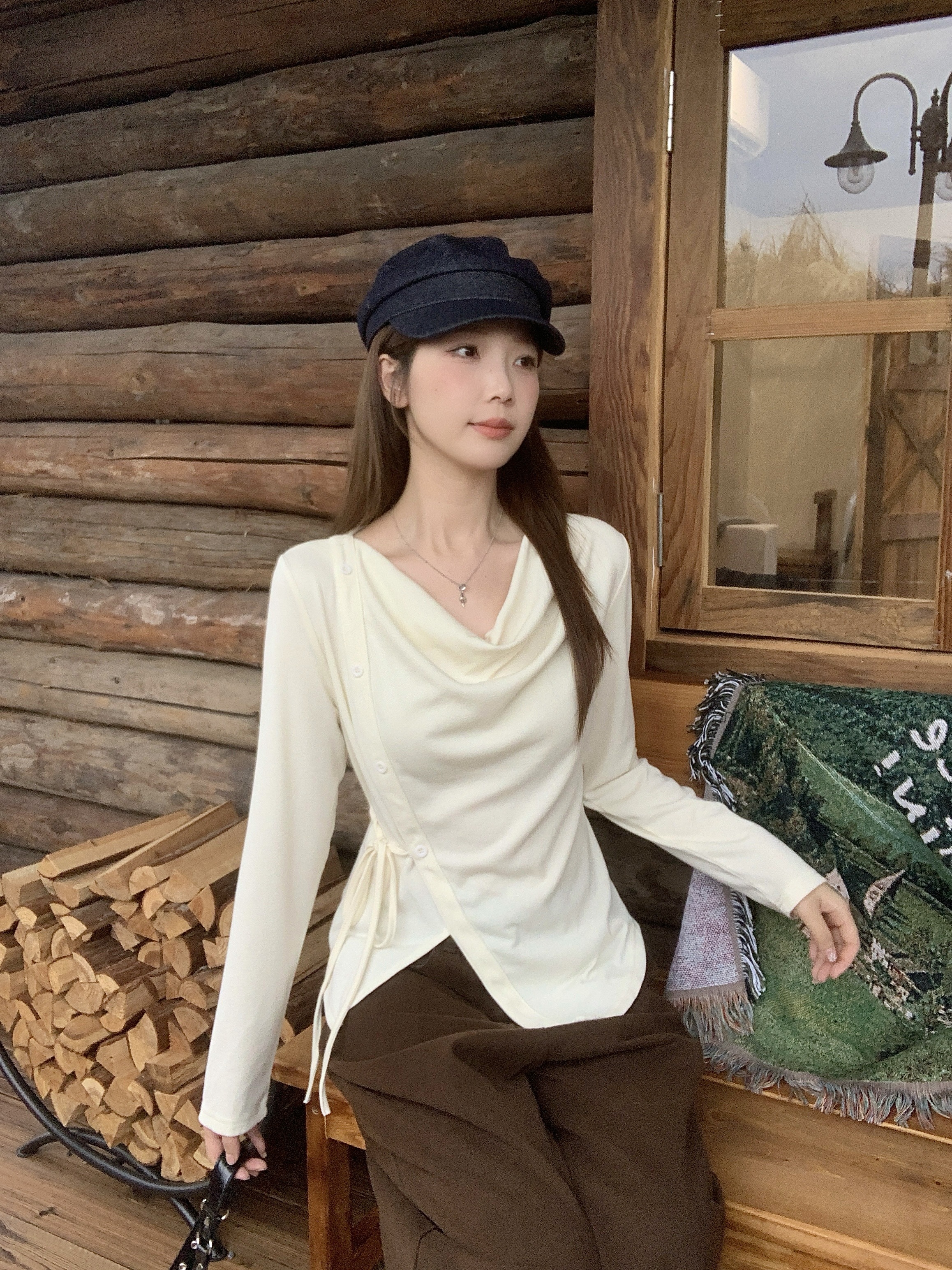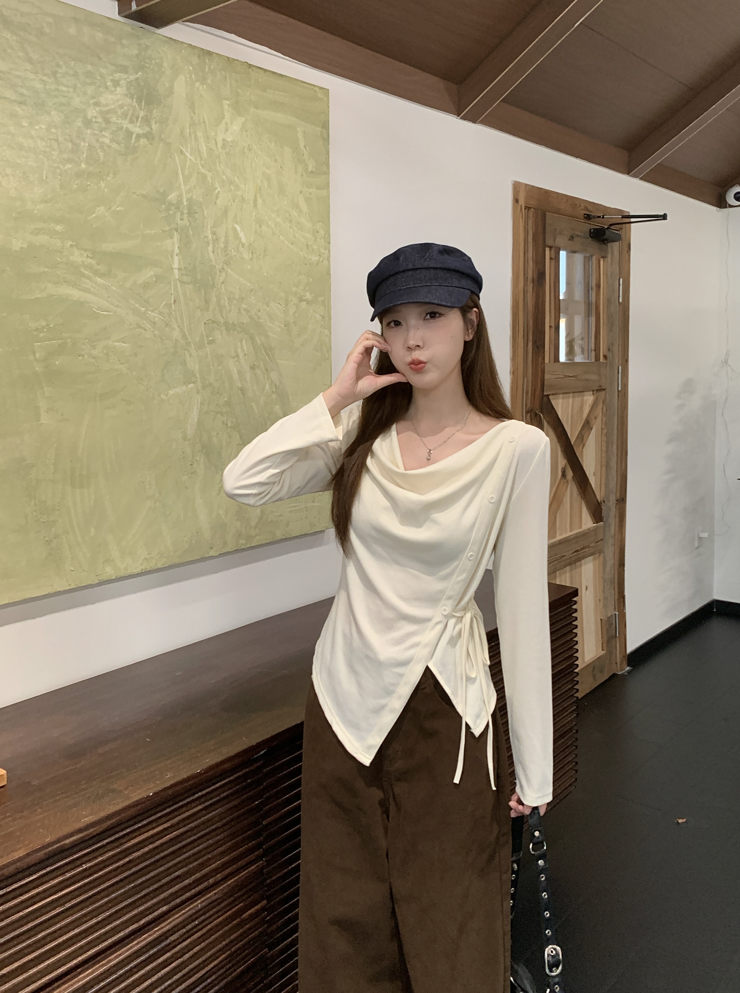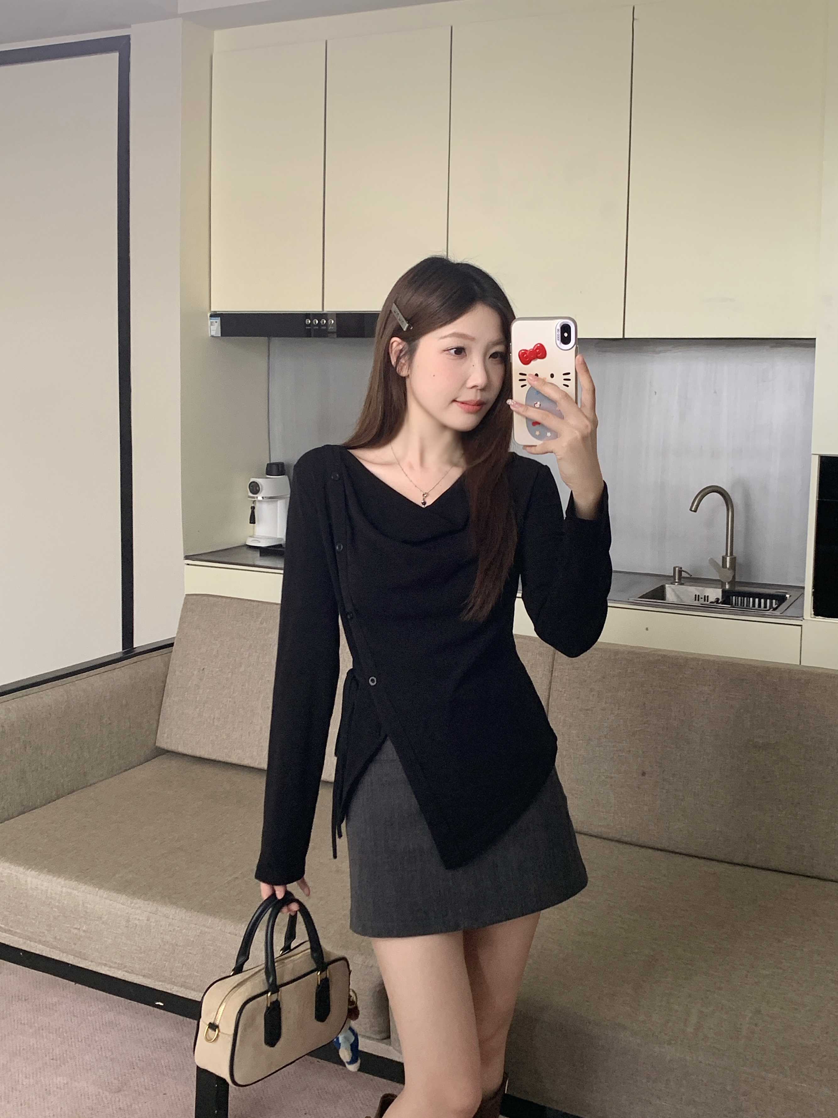 실사 2026 봄 드레스 새로운 지방 mm 빅 사이즈 여성 불규칙 흔들다 칼라 긴팔 티셔츠 프랑스식 품격 스트랩 맨위