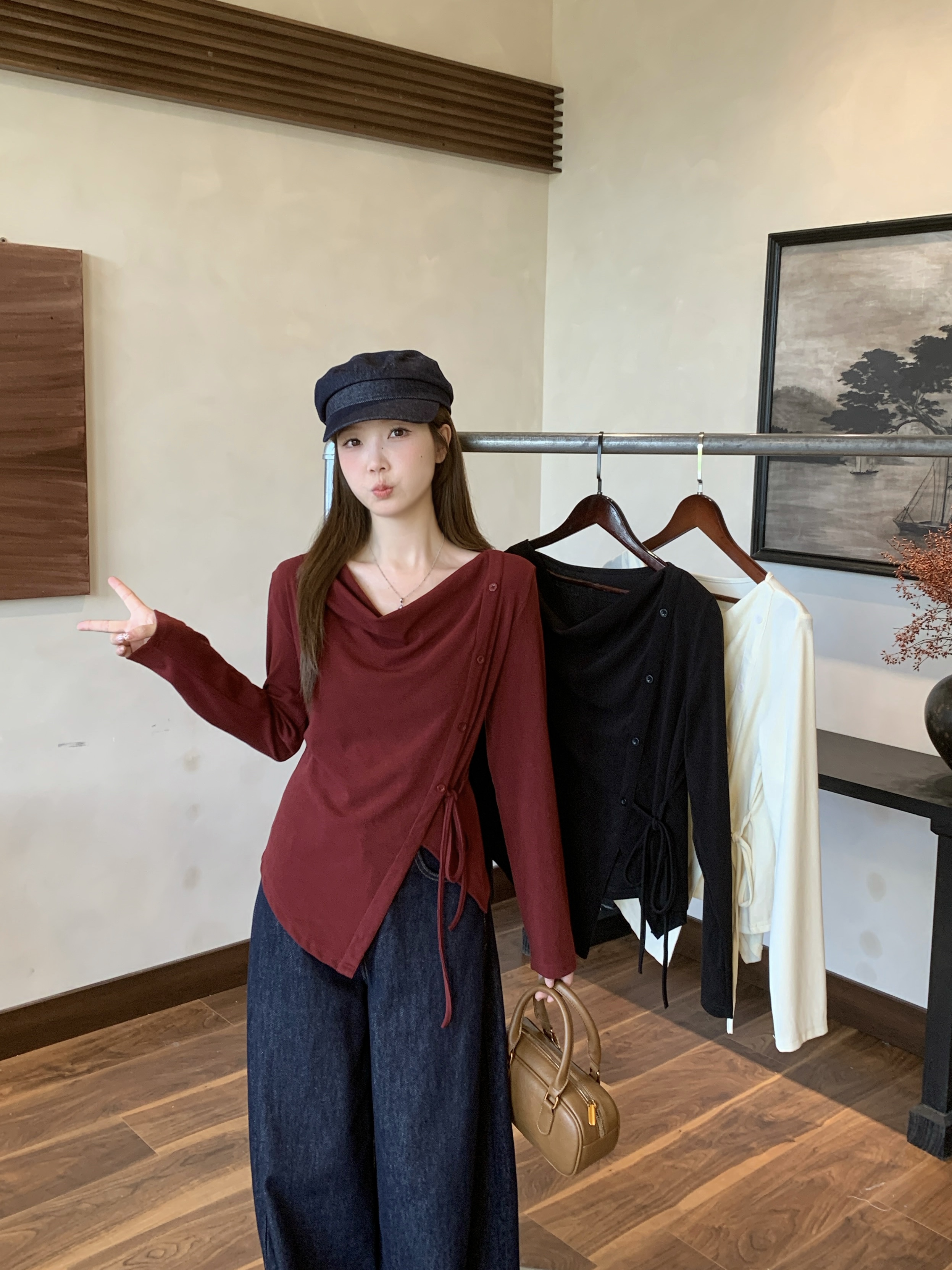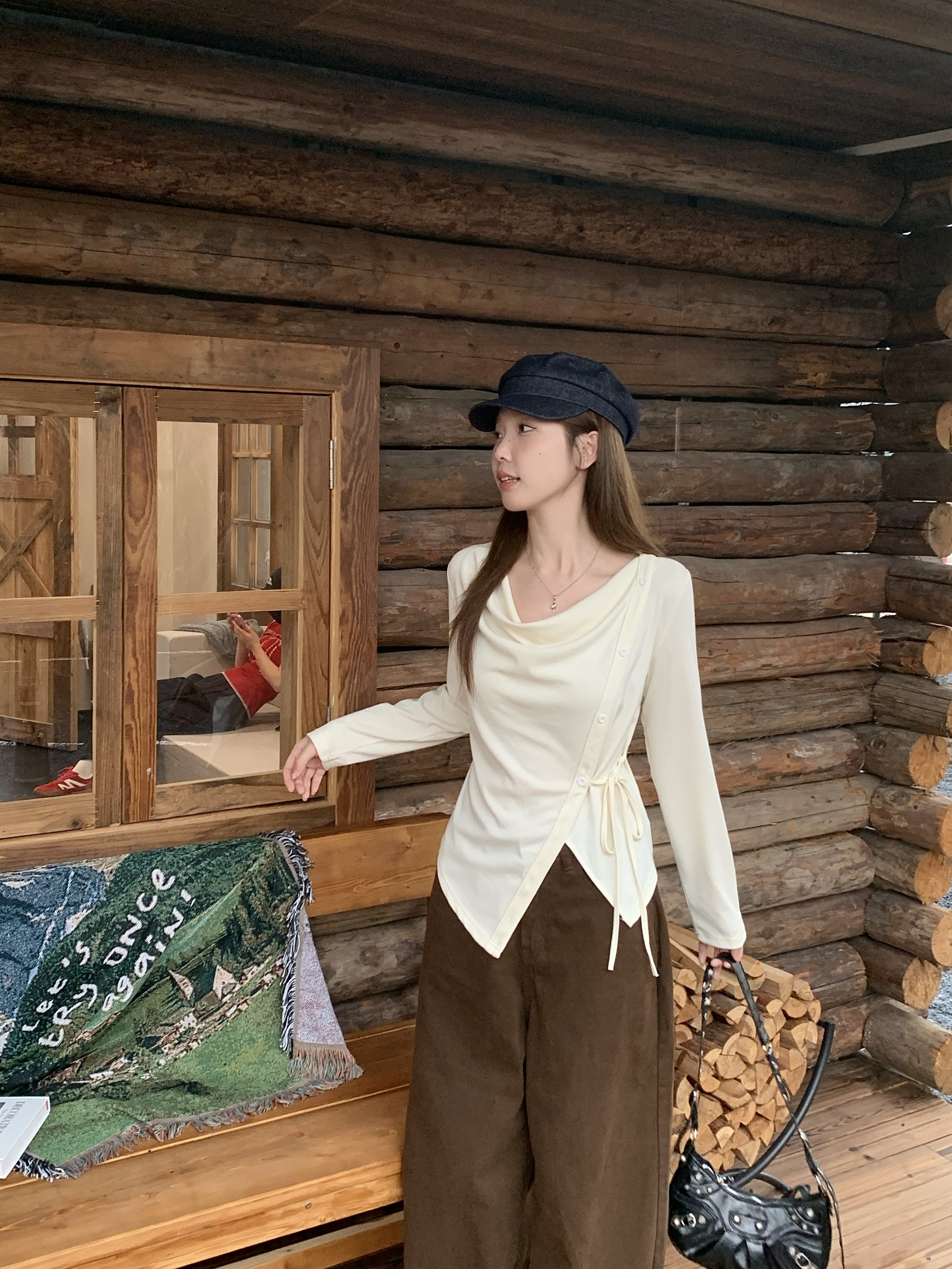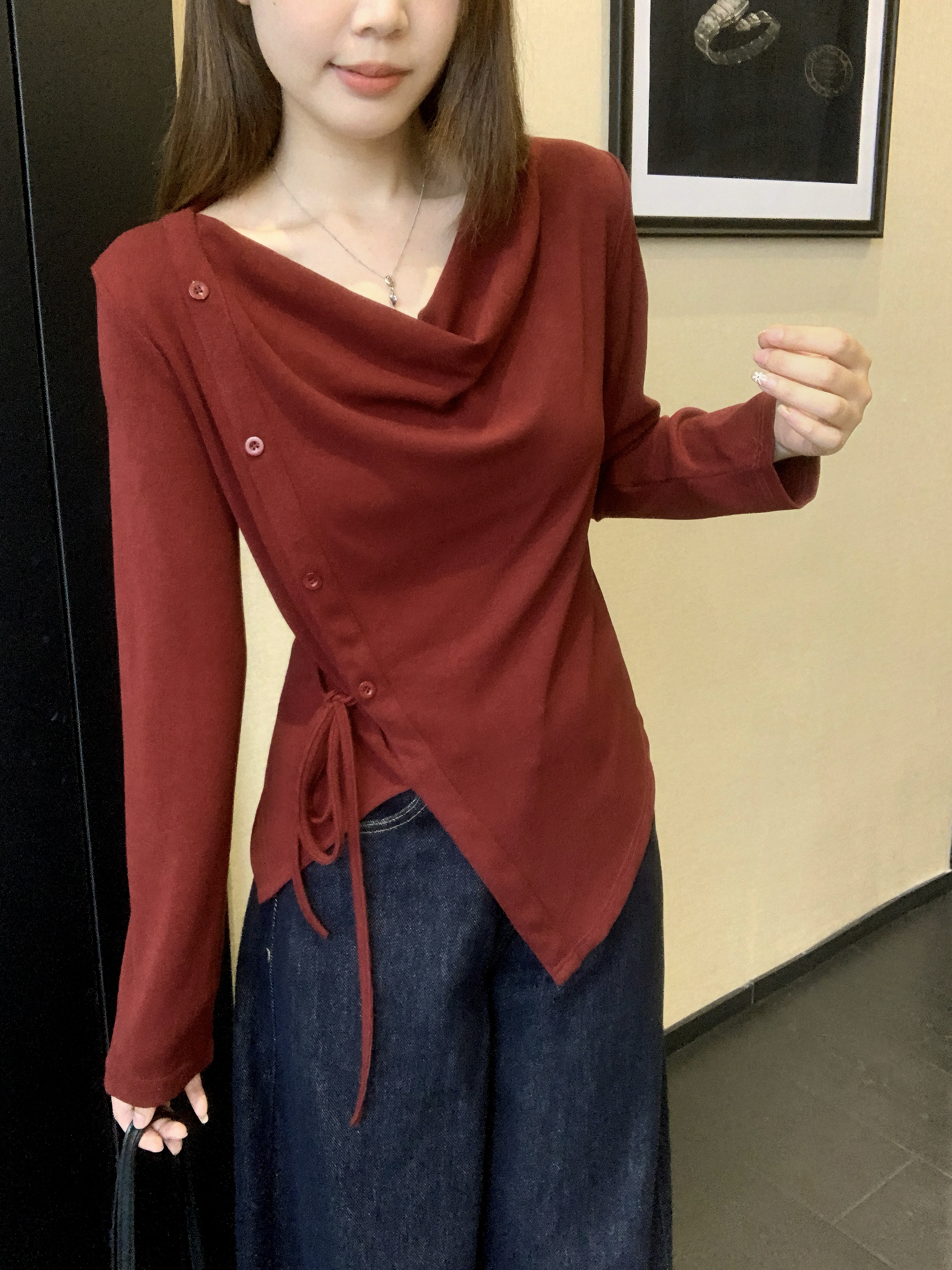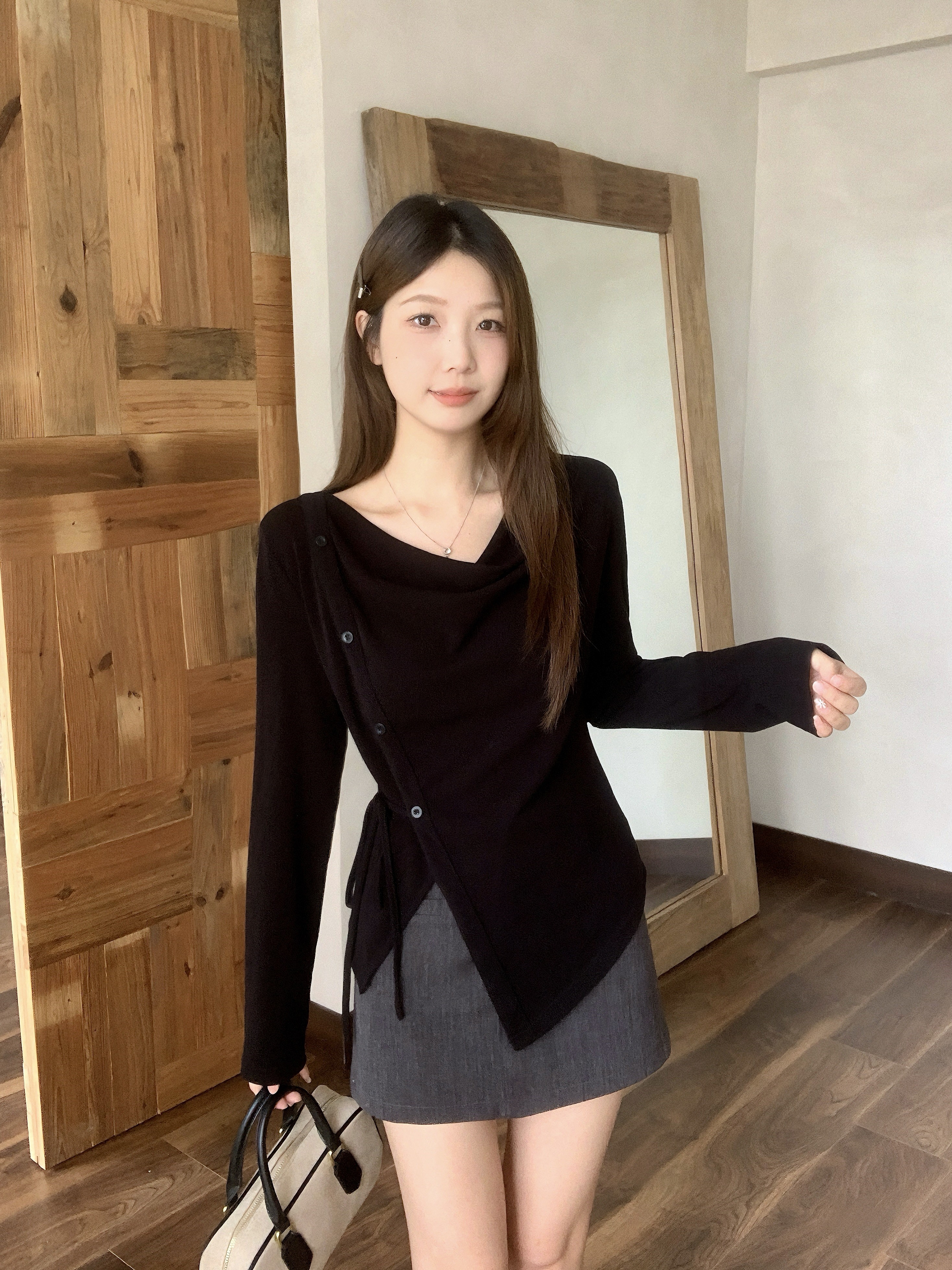 실사 2026 봄 드레스 새로운 지방 mm 빅 사이즈 여성 불규칙 흔들다 칼라 긴팔 티셔츠 프랑스식 품격 스트랩 맨위