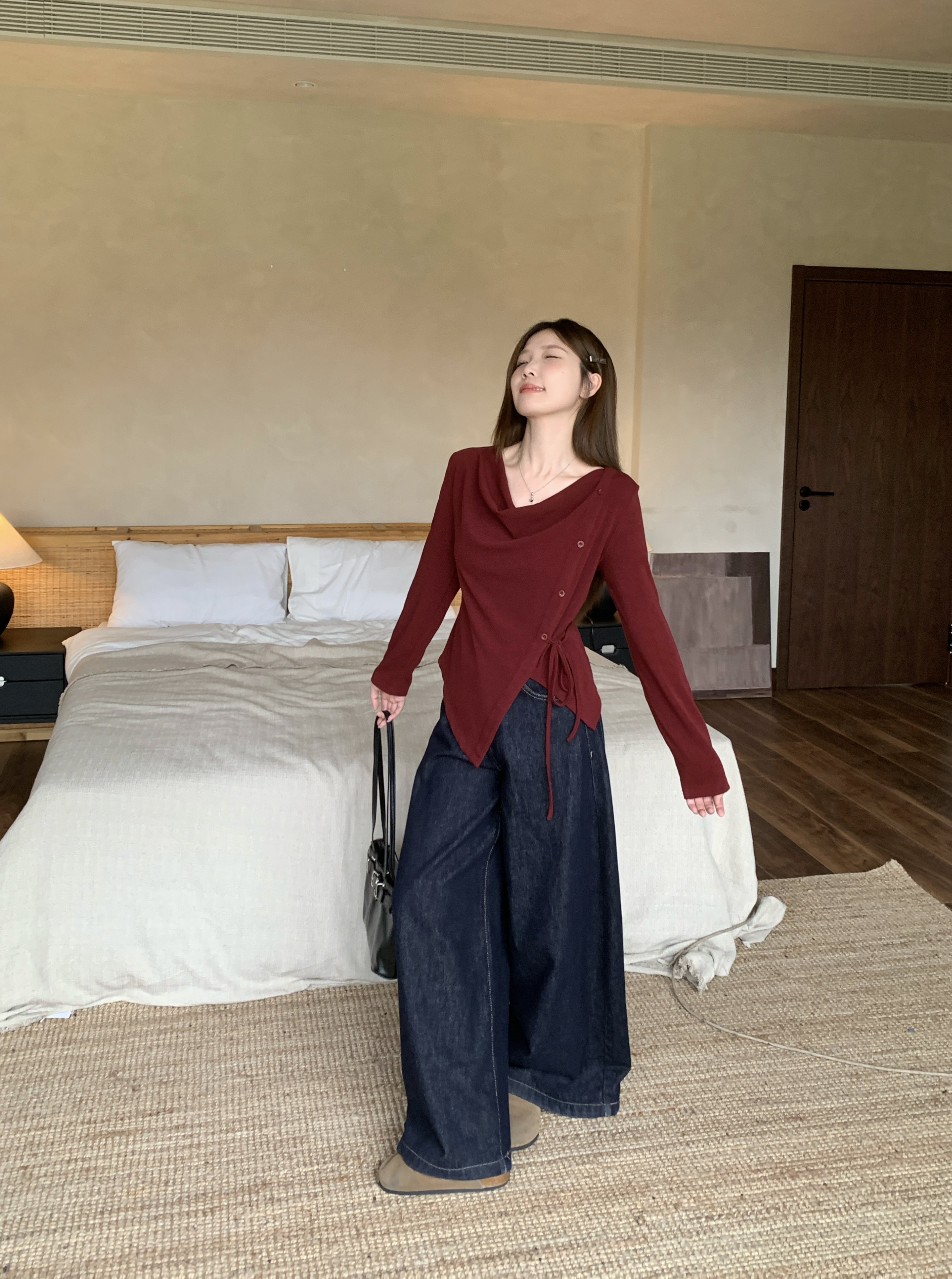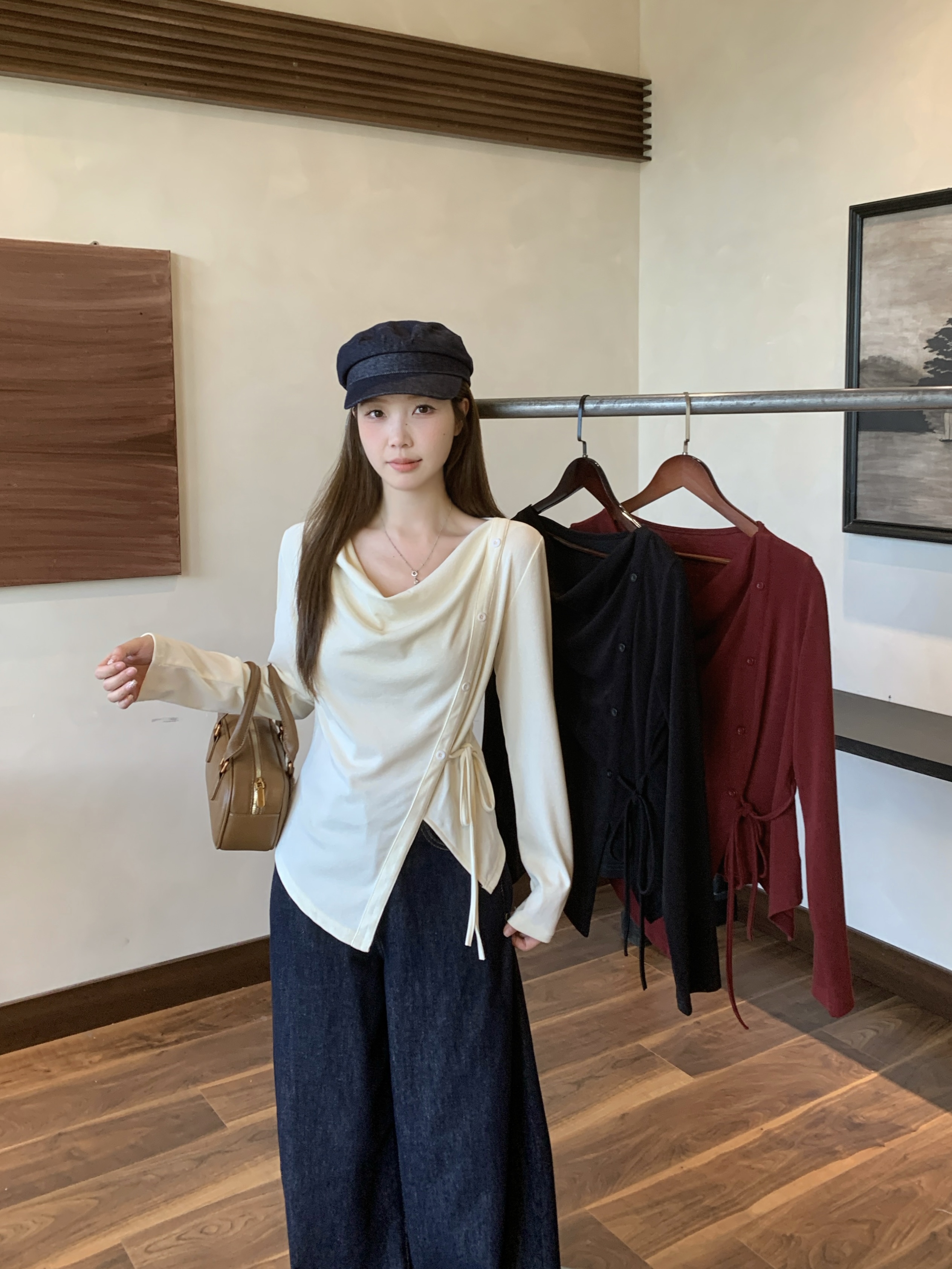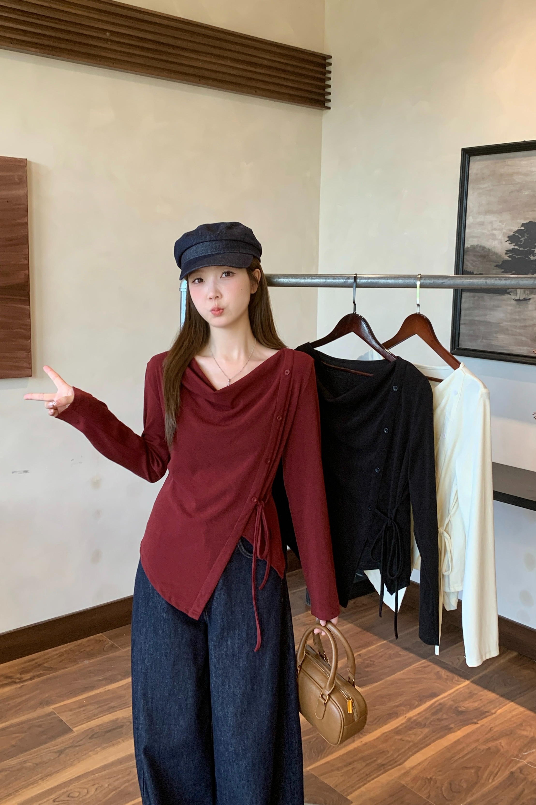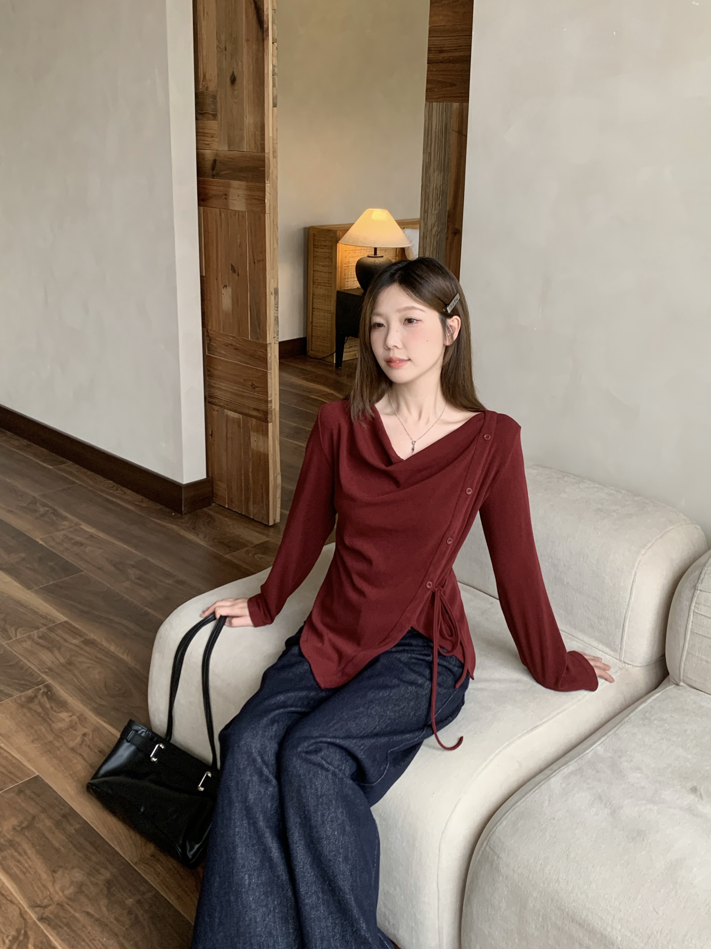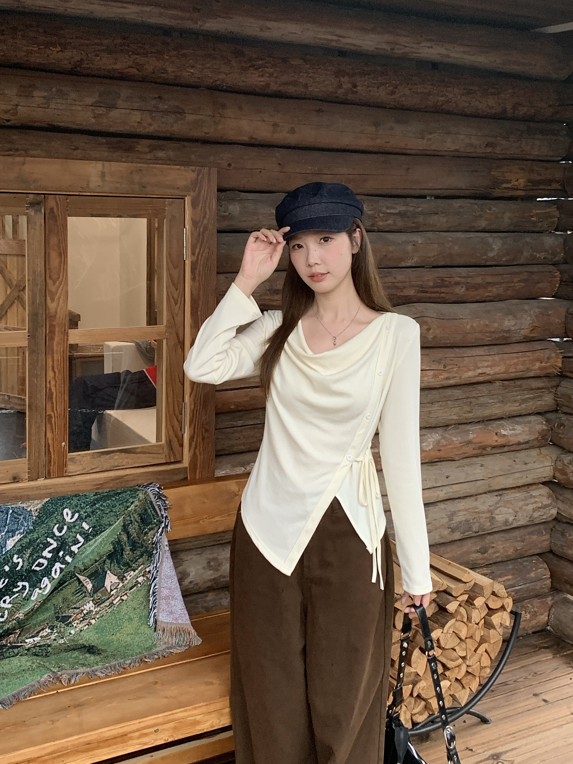실사 2026 봄 드레스 새로운 지방 mm 빅 사이즈 여성 불규칙 흔들다 칼라 긴팔 티셔츠 프랑스식 품격 스트랩 맨위