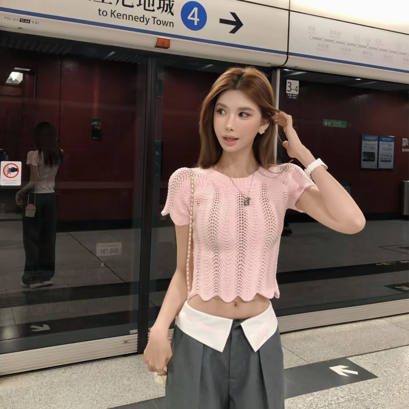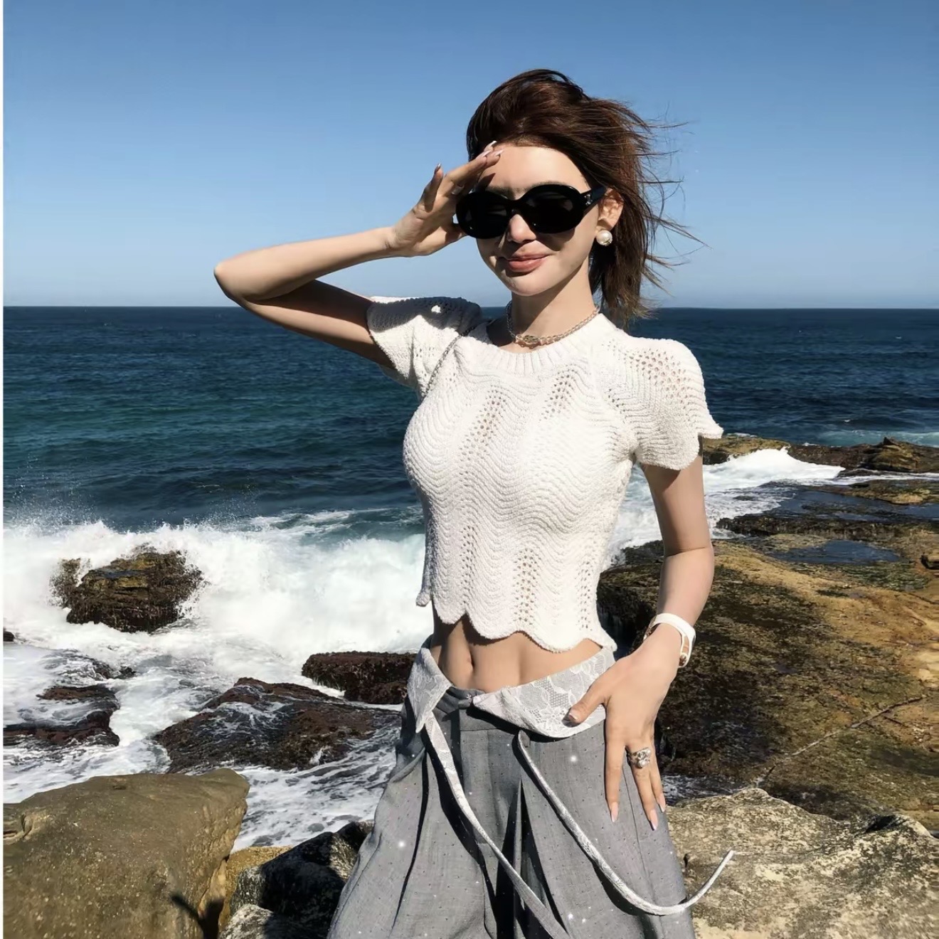 순수한 욕망 화이트 V넥 얇은 스타일 링 그리드 홀로우 아웃 니트 오픈 가디건 이른 봄 슬림해 보이는 쇼트 스타일 싱글 줄 버튼 몸매 가꾸기 맨위 여성