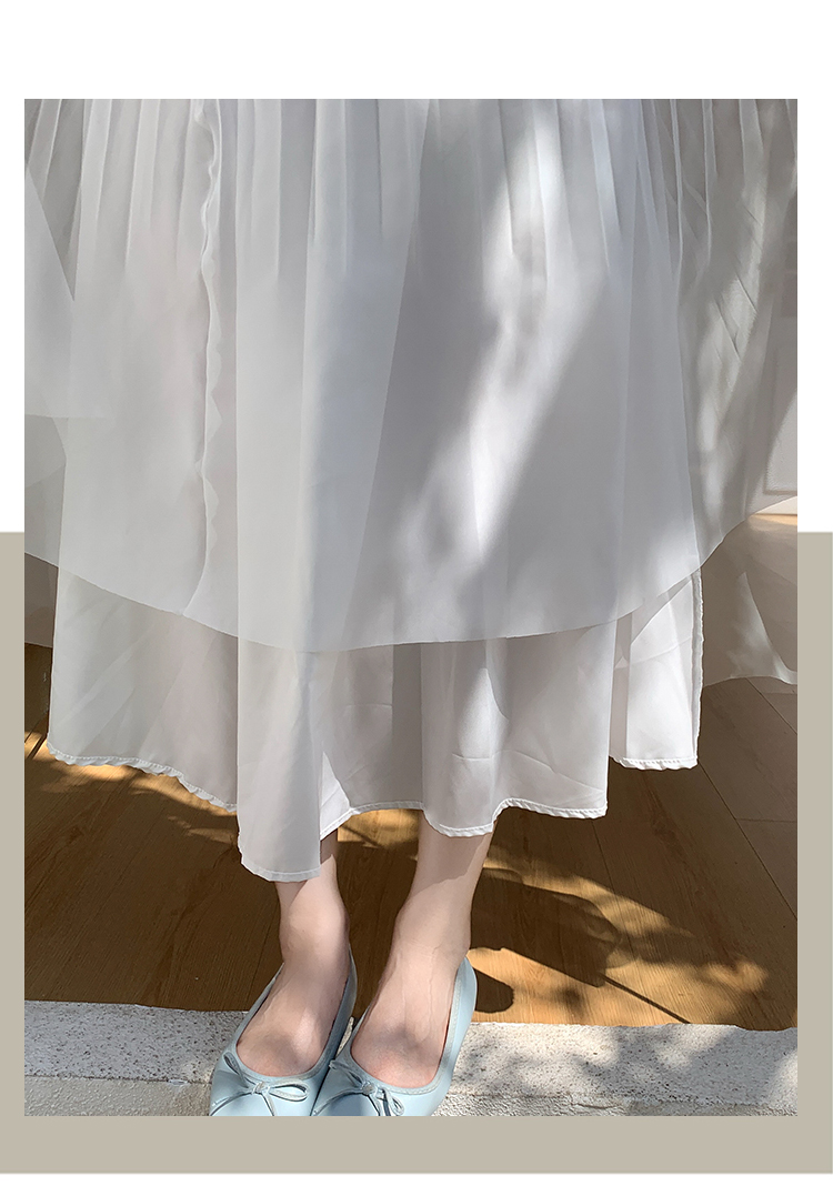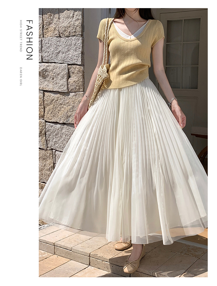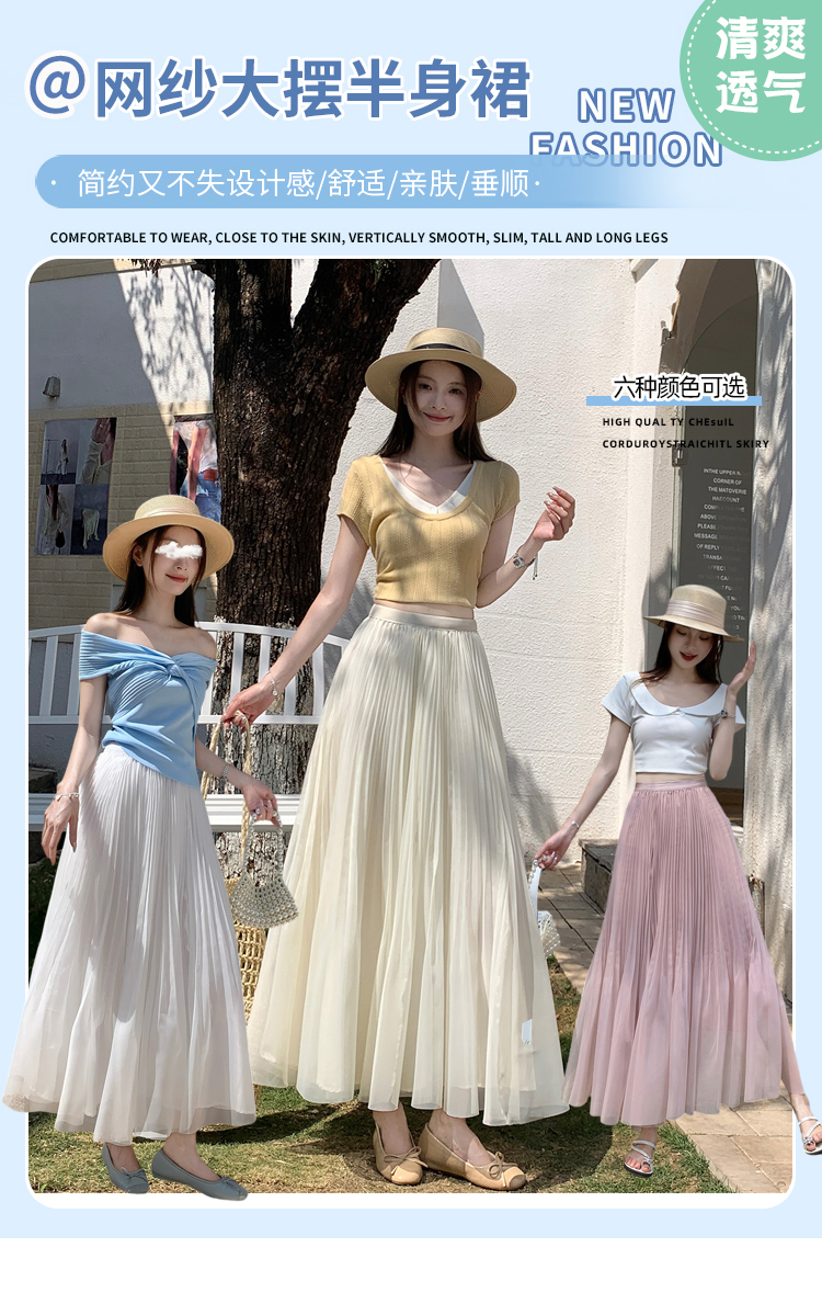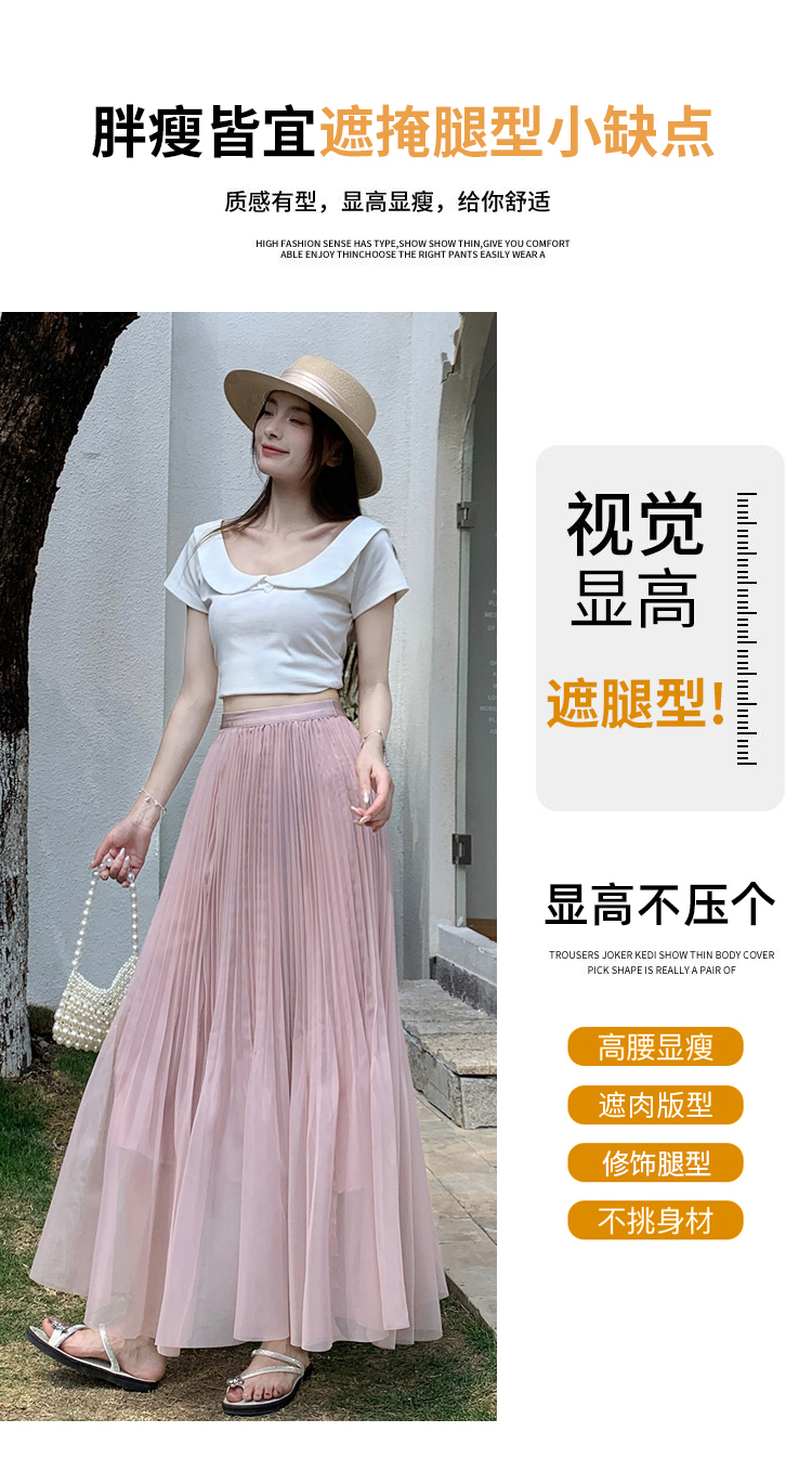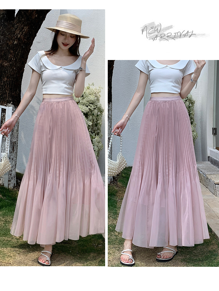 슈퍼 요정 망사 한 마디 플리츠 롱 스커트 여성 2026 봄 여름 새로운 휴가 바람 슬림해 보이는 표지 십자가 단색 반신 스커트