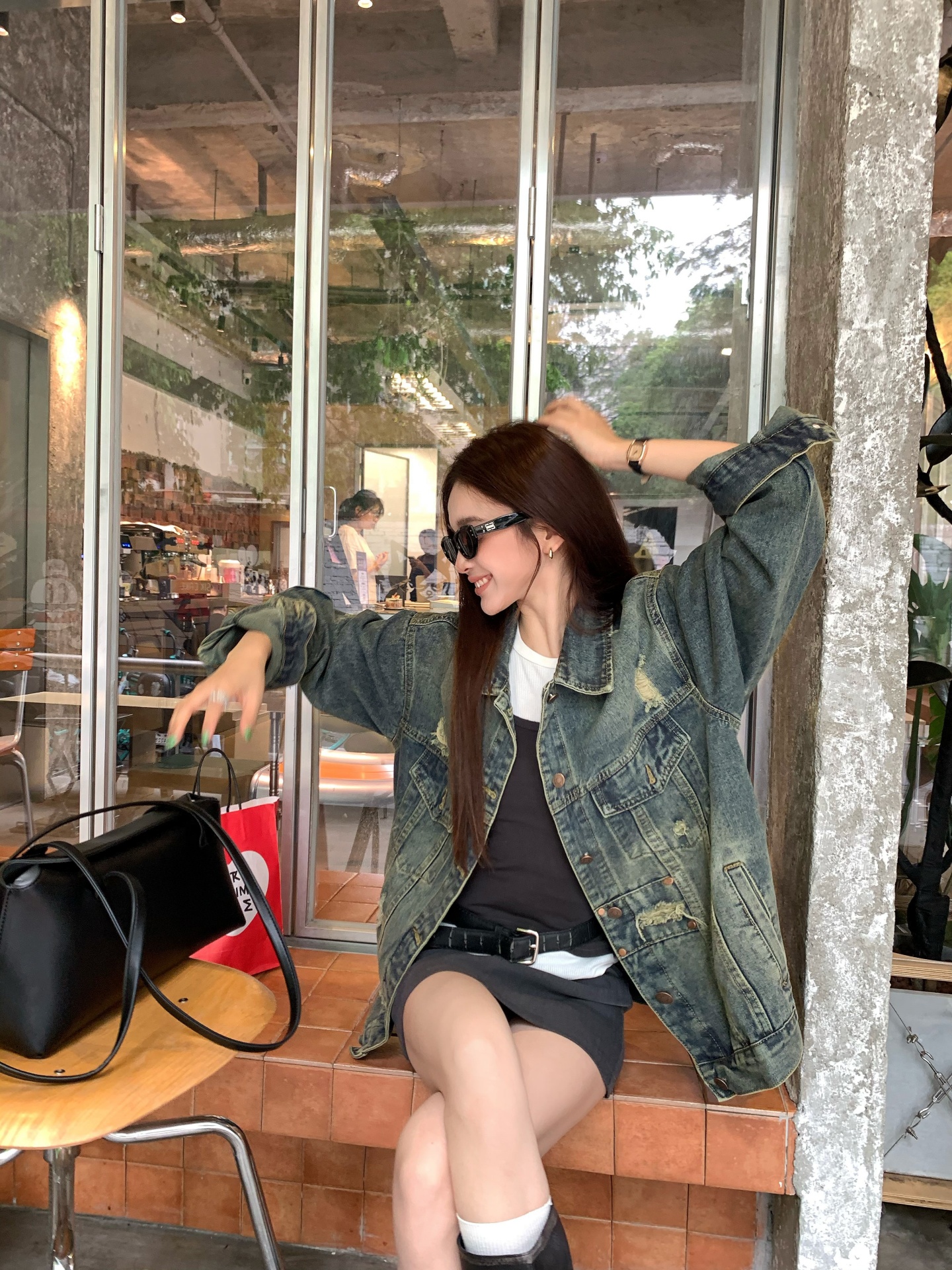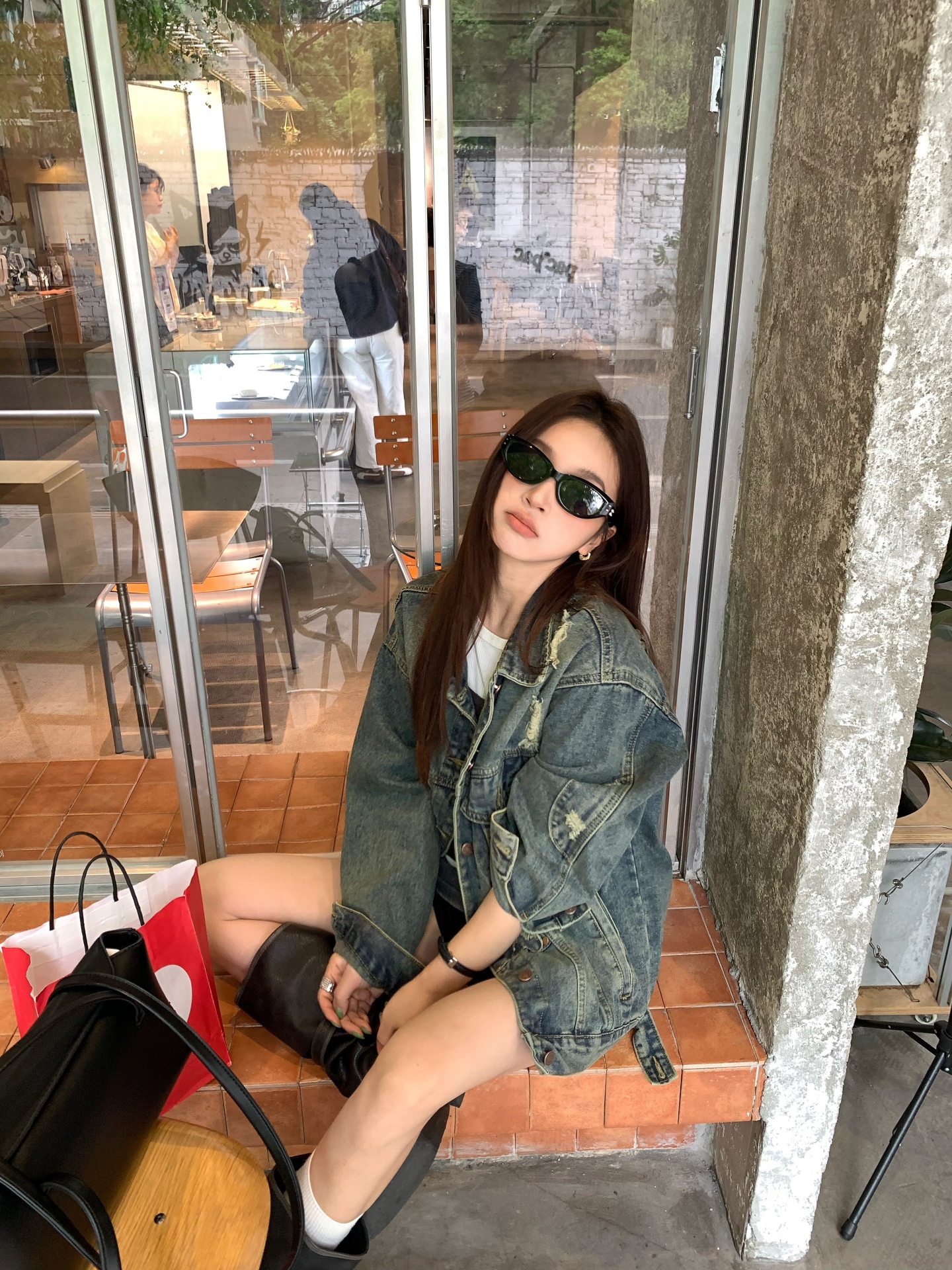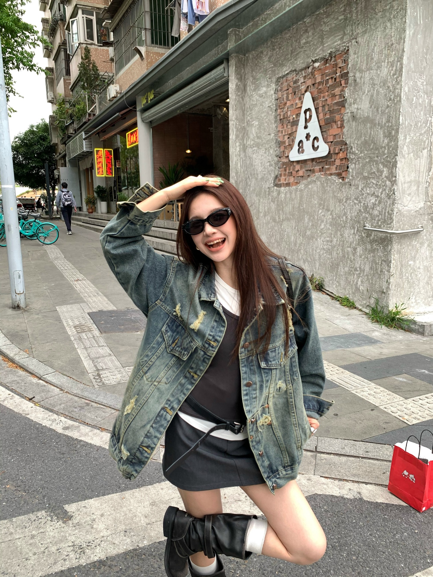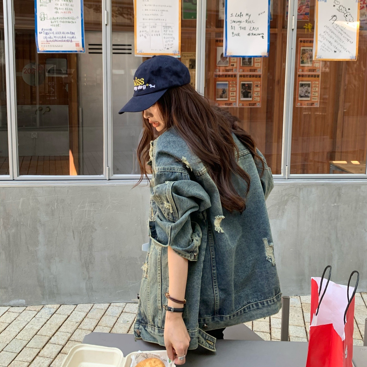 아메리칸 레트로 해체 질감 데님 재킷 루즈핏 프로필 모양 몸매 가꾸기 슬림해 보이는 워크웨어 재킷 여성