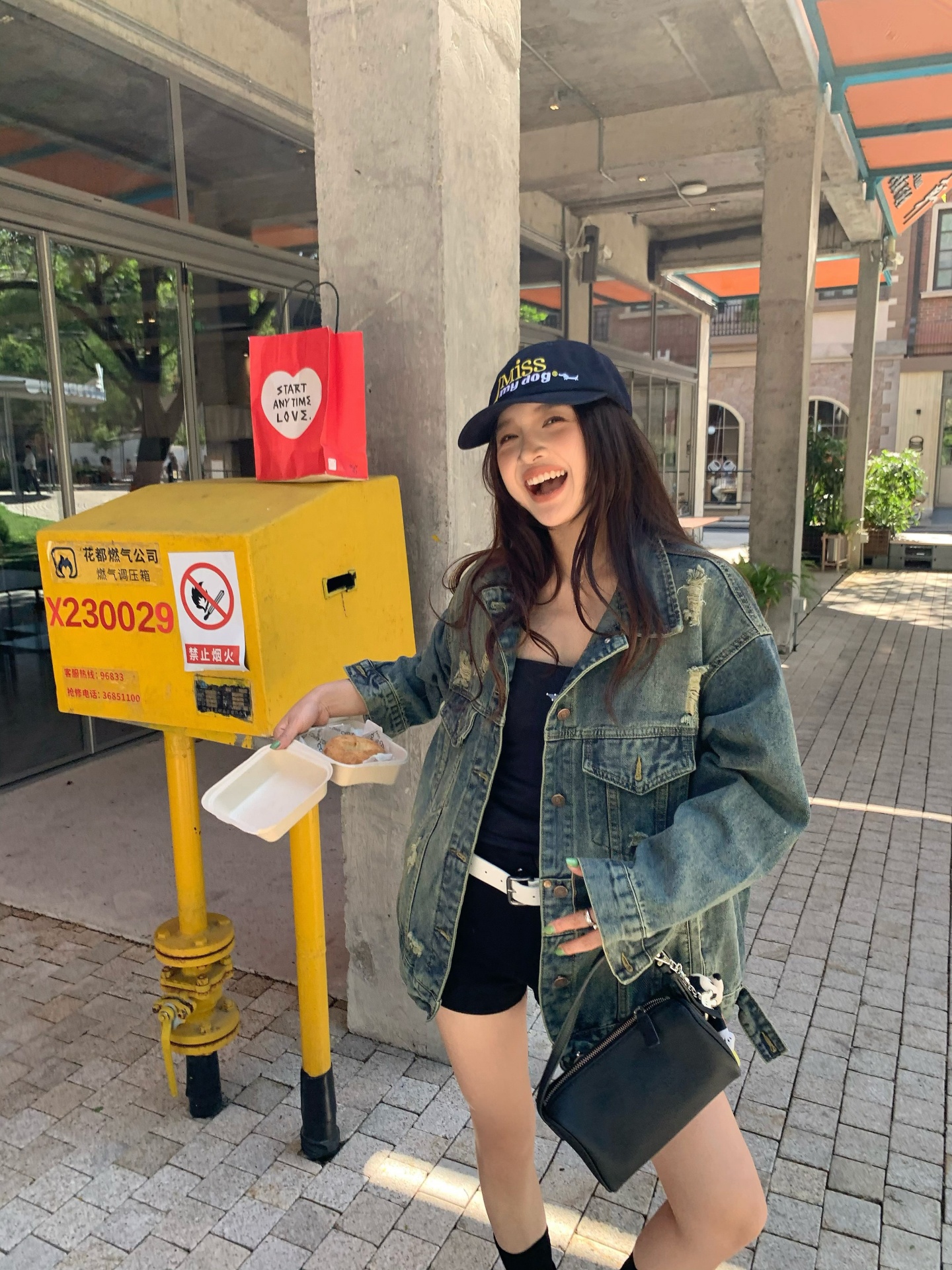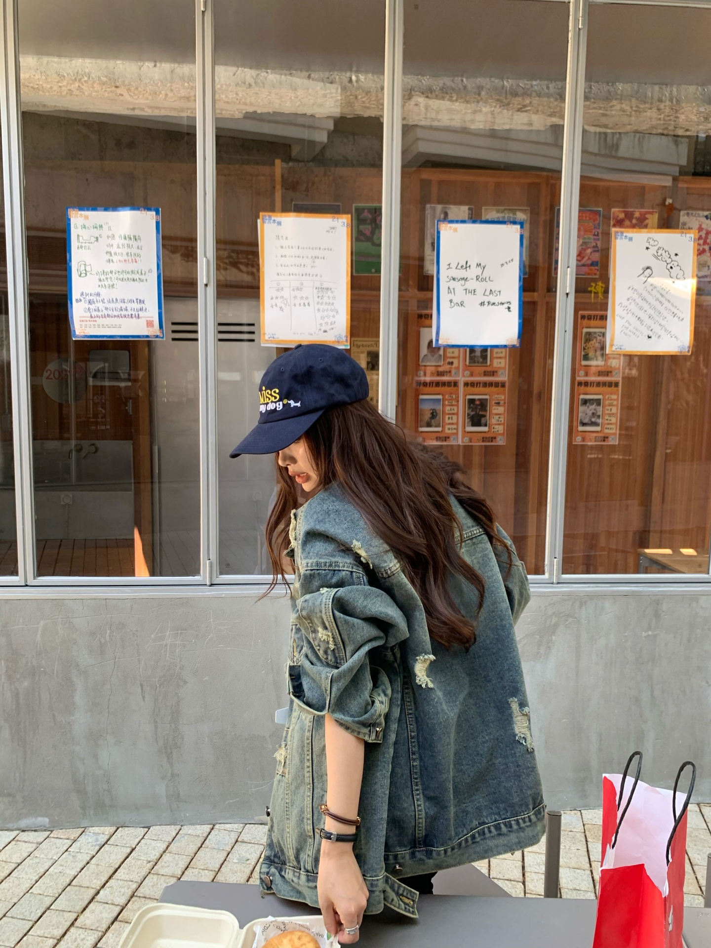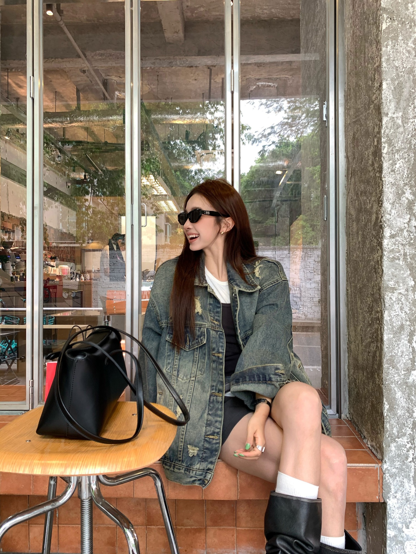 아메리칸 레트로 해체 질감 데님 재킷 루즈핏 프로필 모양 몸매 가꾸기 슬림해 보이는 워크웨어 재킷 여성