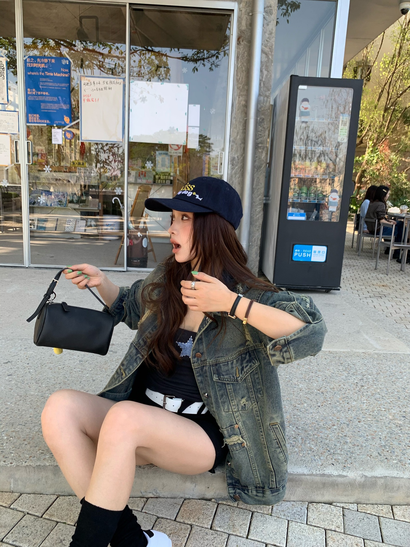 실사 레트로 한국 스타일 루즈핏 어깨 반팔 데님 반소매 재킷