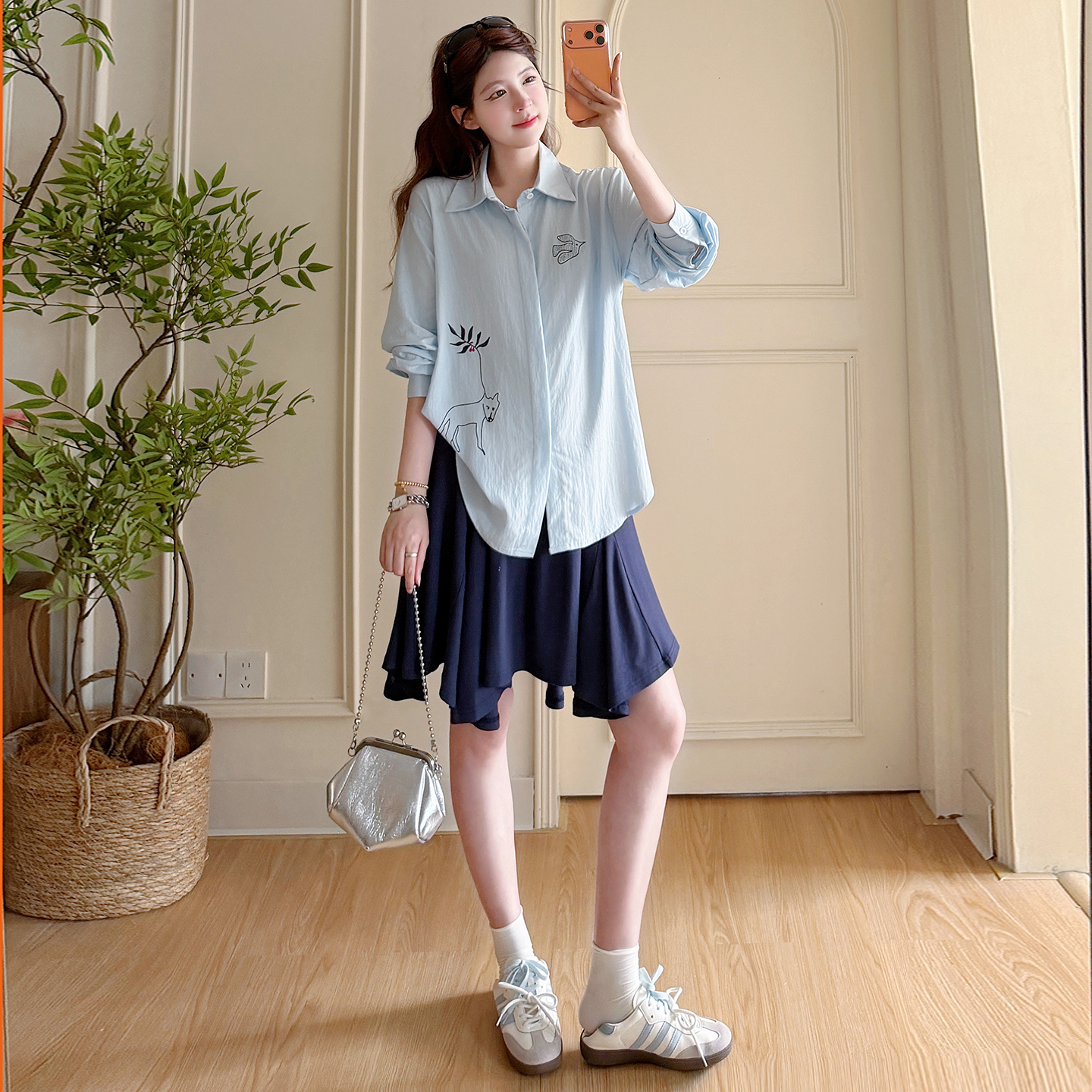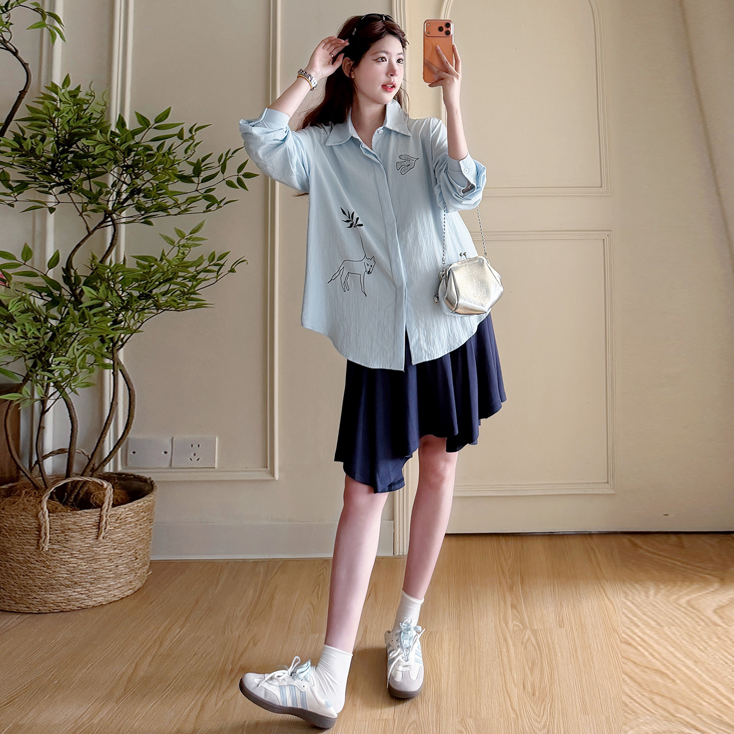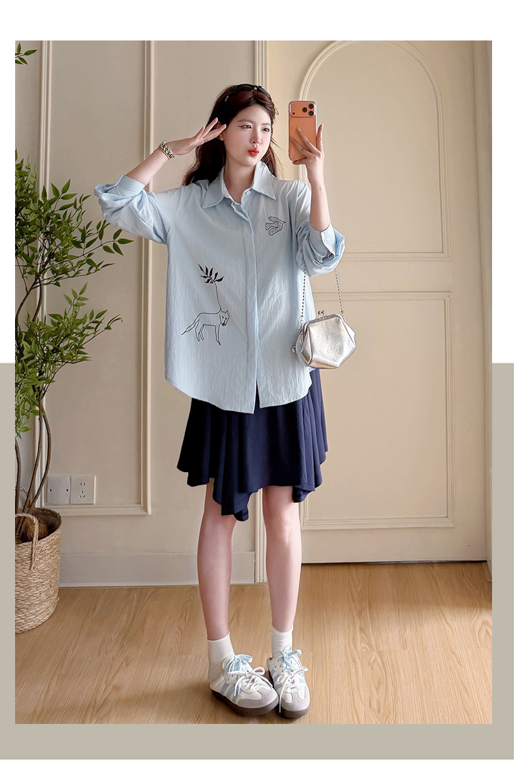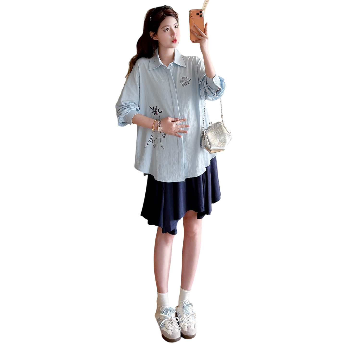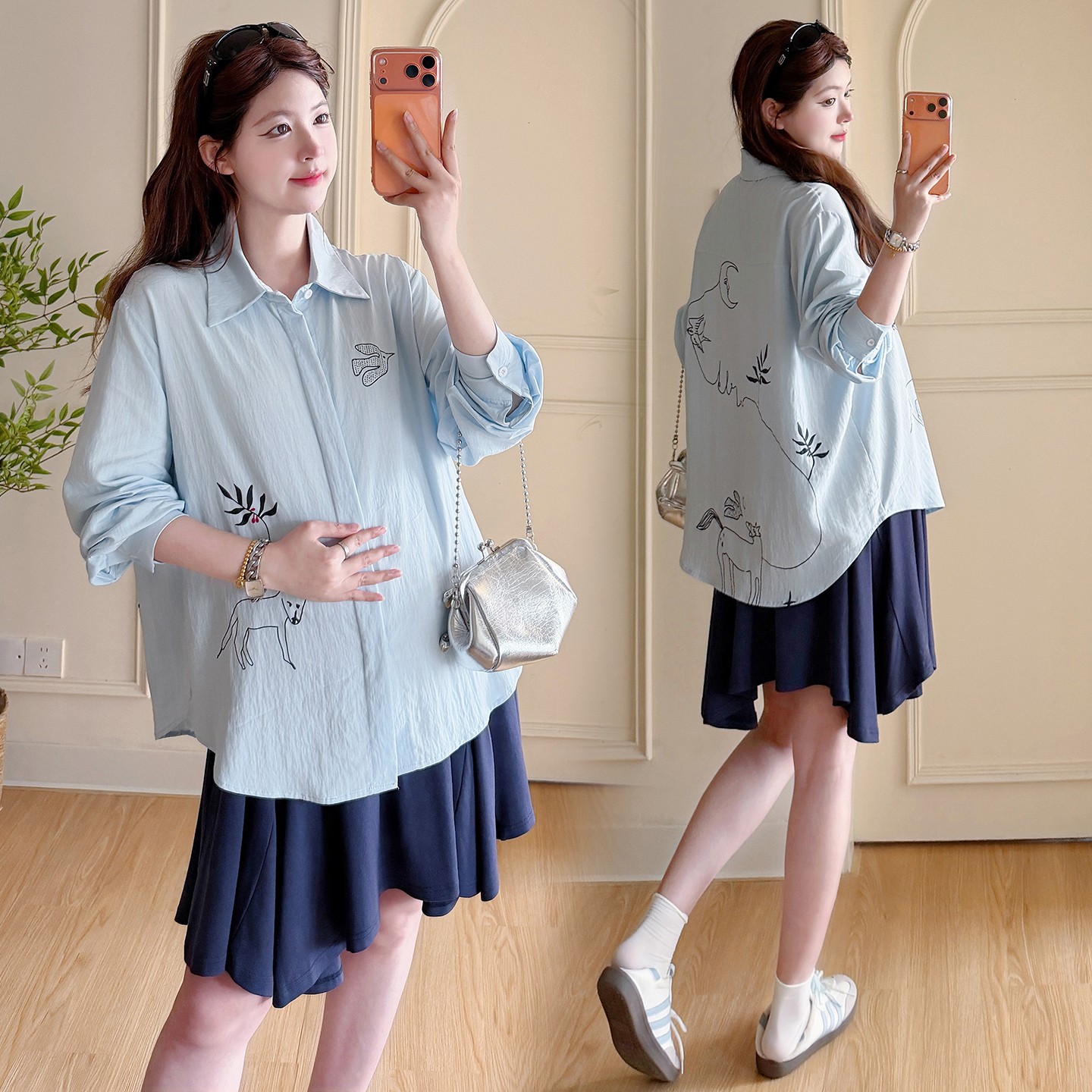 봄 아모이 긴팔 출산 착용 맨위 2026 한국 스타일 루즈핏 빅 사이즈 투피스 세트 임산부 반신 치마 세트