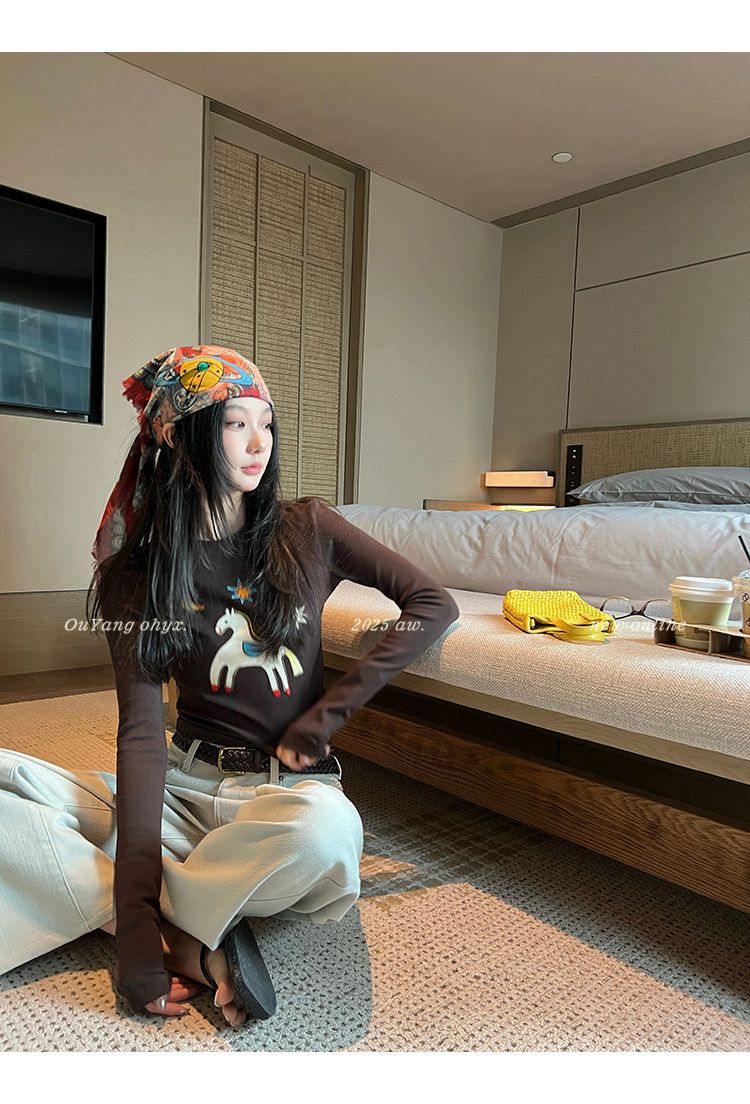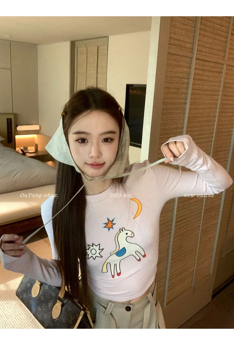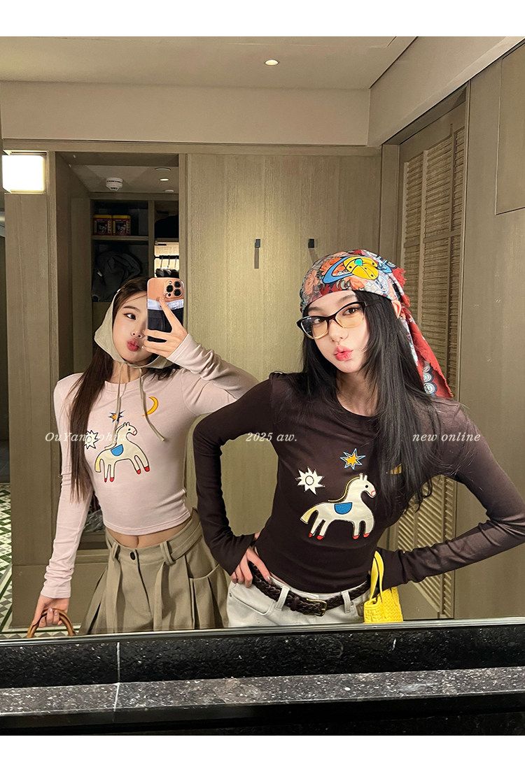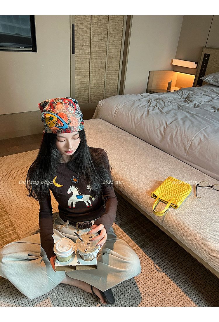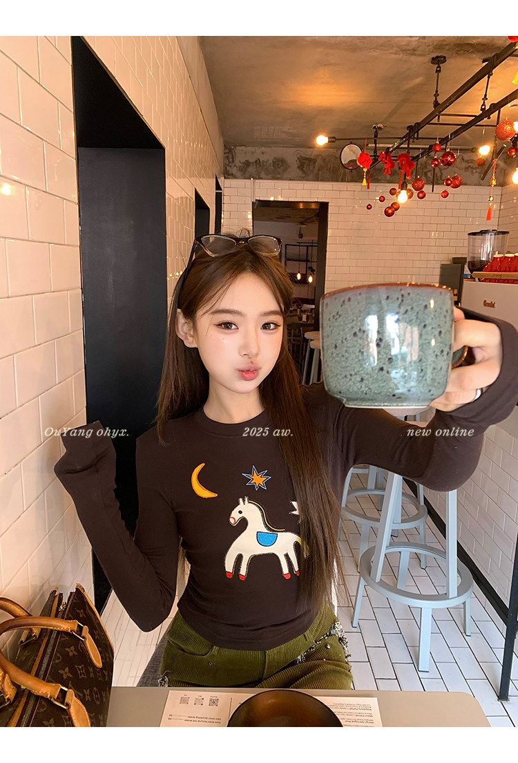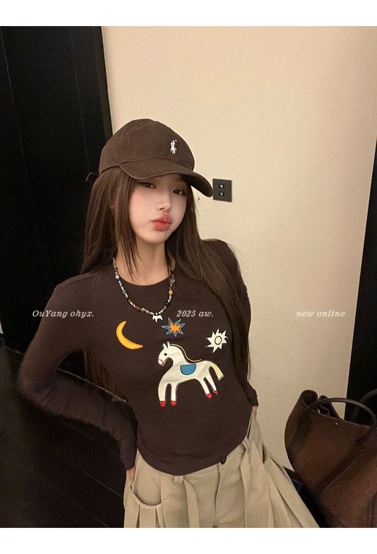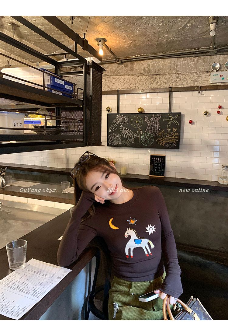 봄 여름 새로운 사람들 면 한 부서 자수 긴팔 기본 셔츠 티셔츠 여성 새로운 몸매 가꾸기 슬림해 보이는 고급 센스 맨위