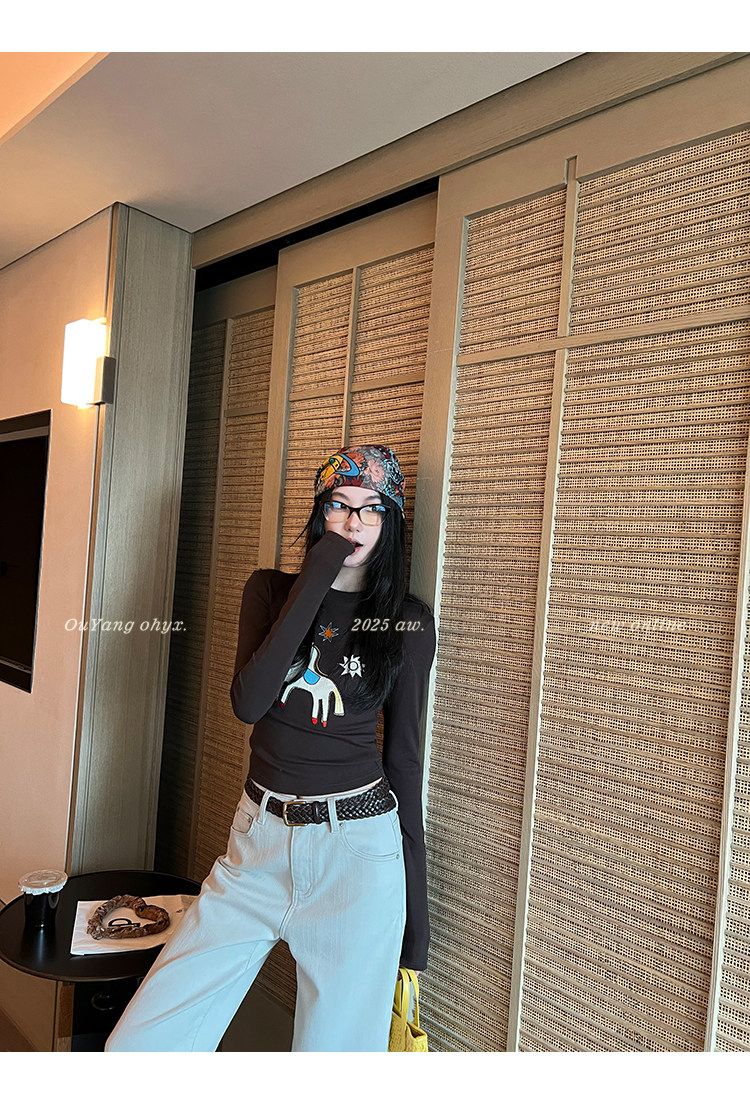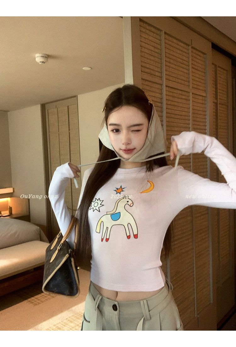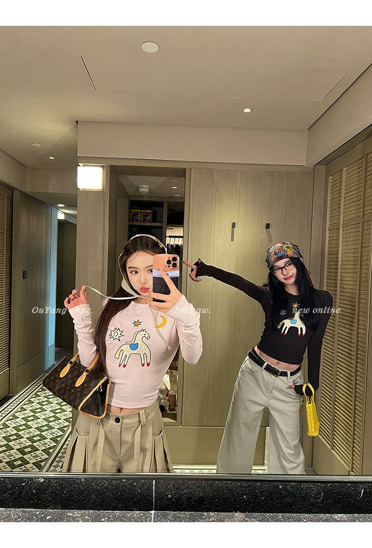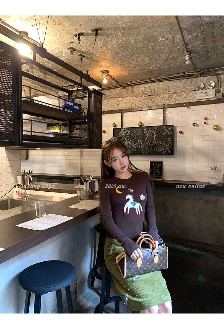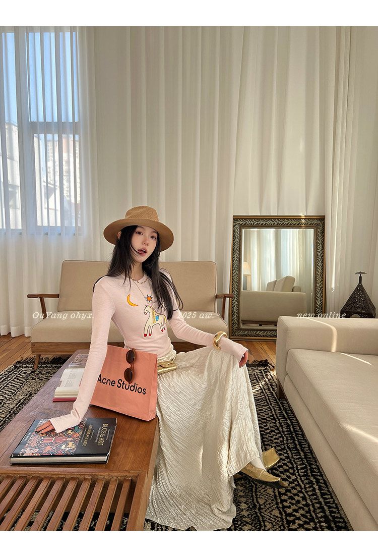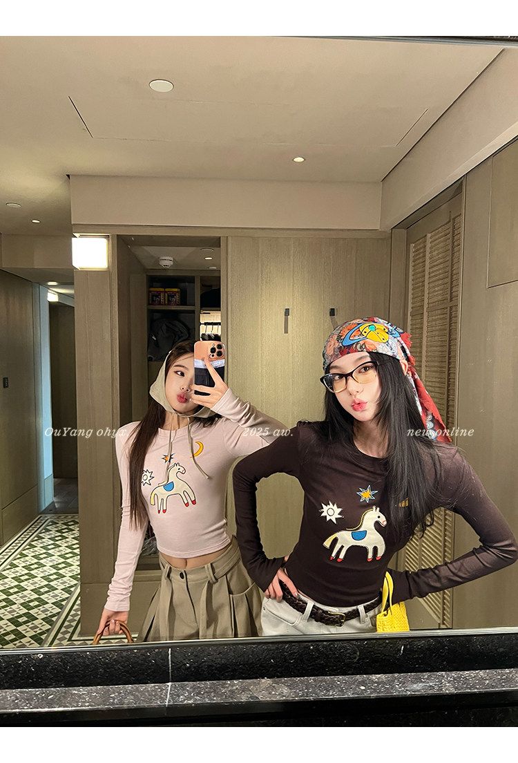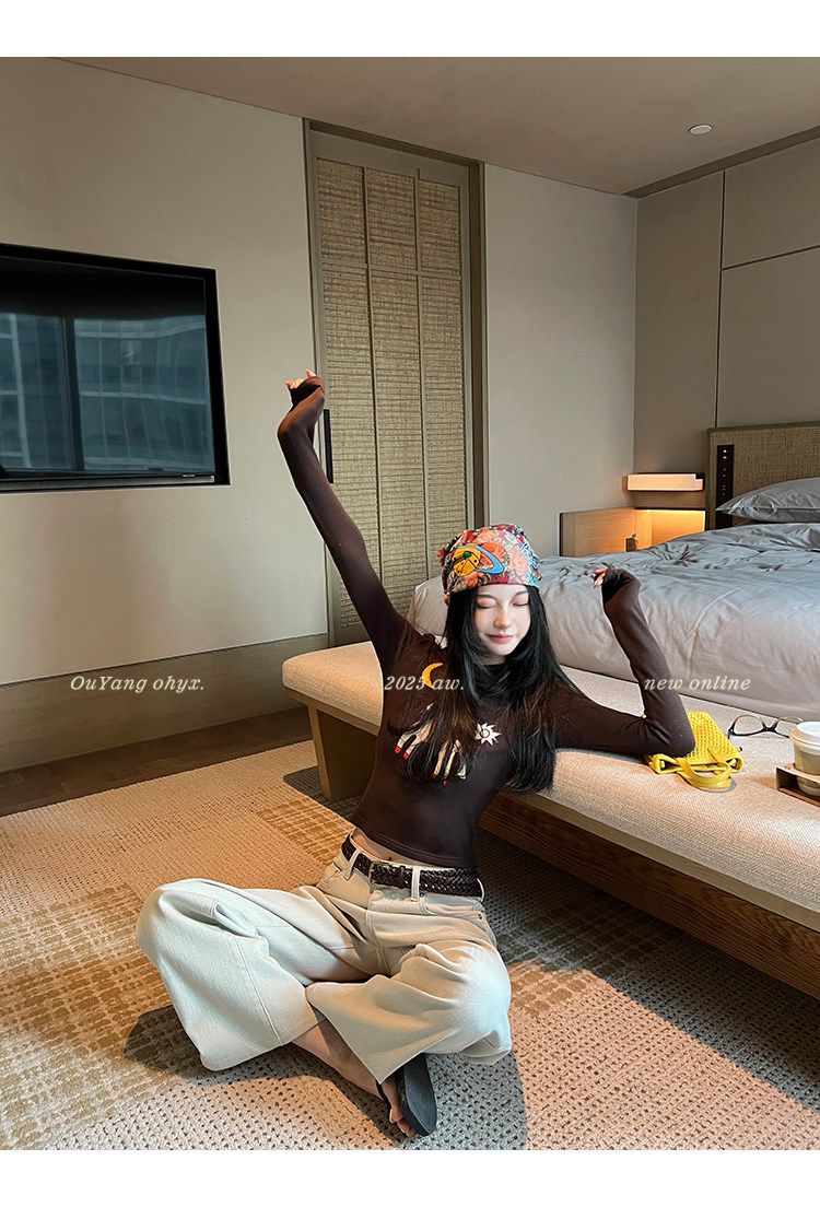 봄 여름 새로운 사람들 면 한 부서 자수 긴팔 기본 셔츠 티셔츠 여성 새로운 몸매 가꾸기 슬림해 보이는 고급 센스 맨위