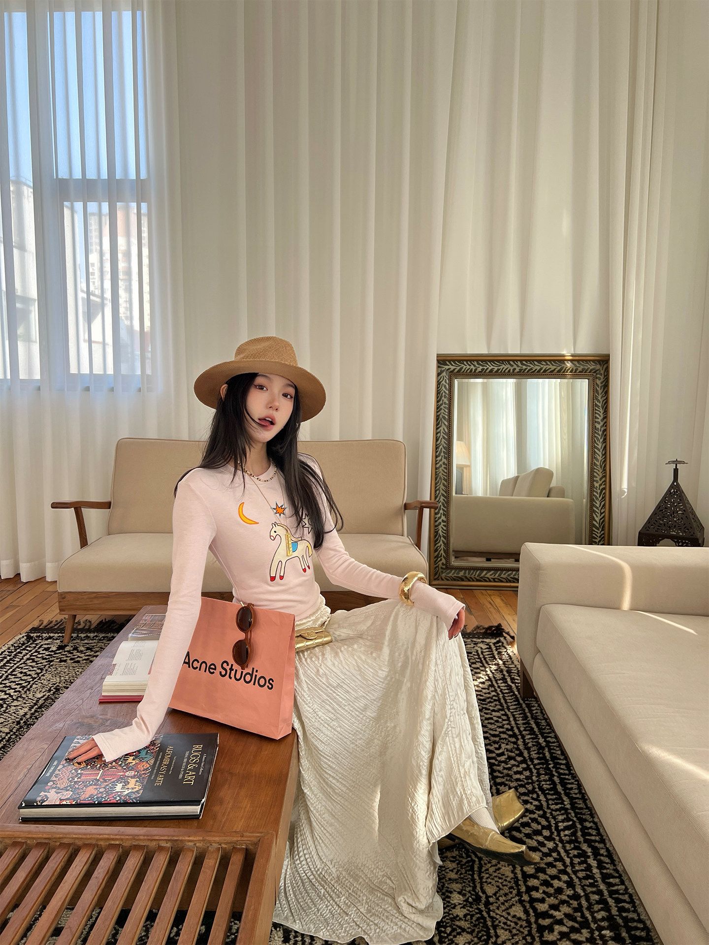 봄 여름 새로운 사람들 면 작은 대중 세련된 비대칭 펌프 Pleat 몸매 가꾸기 디자인 센스 비스듬한 어깨 긴팔 티셔츠