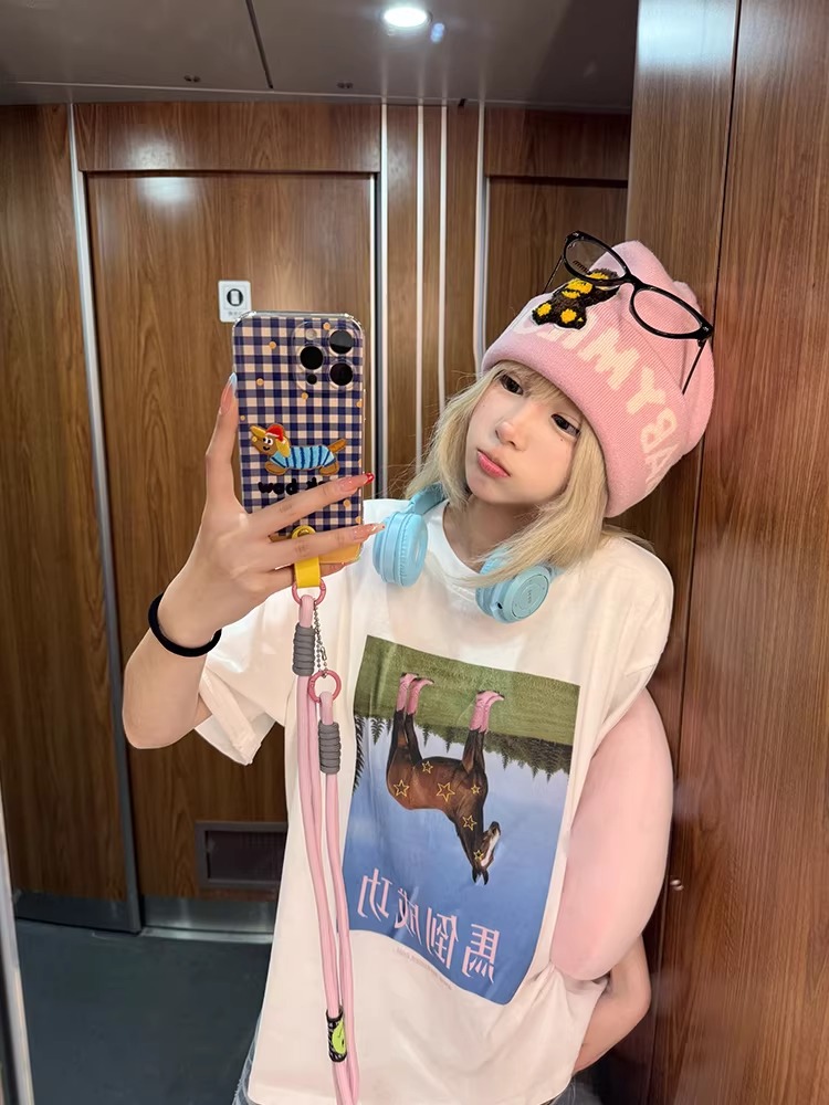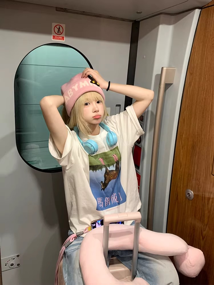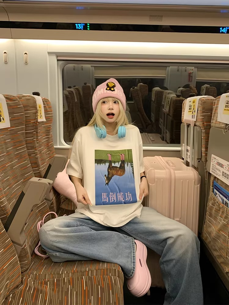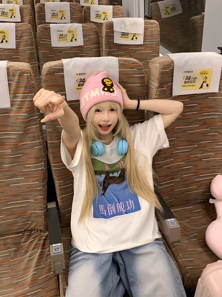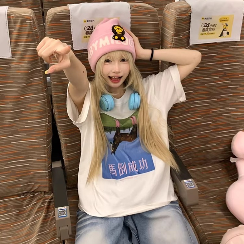실사 한 부서 화이트 만화 조개 프린트 디자인 센스 긍정적 인 어깨 반팔 티셔츠 여성 여름 루즈핏 느긋한 맨위