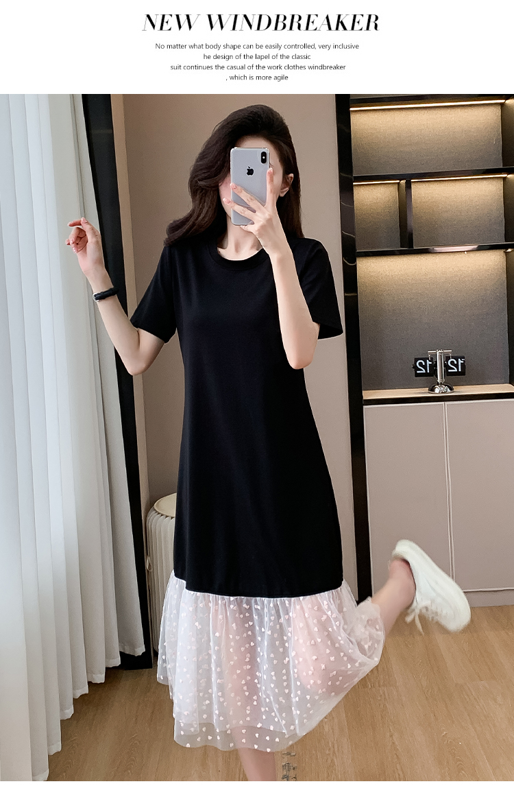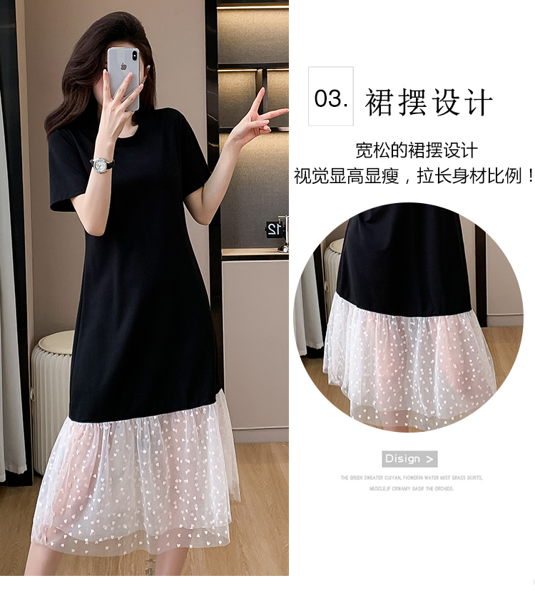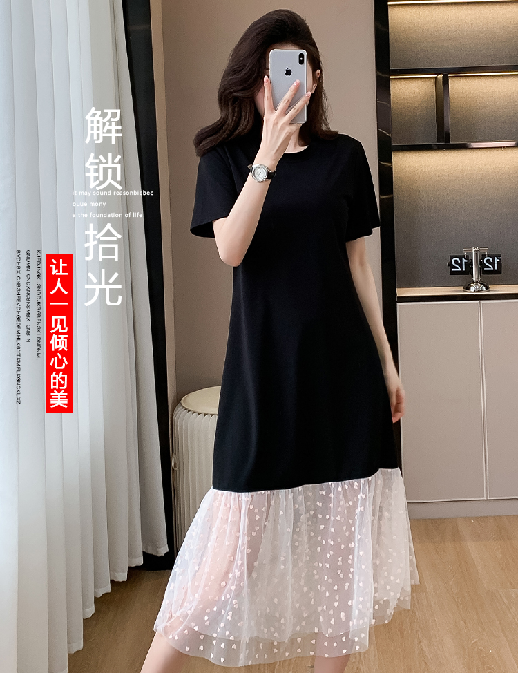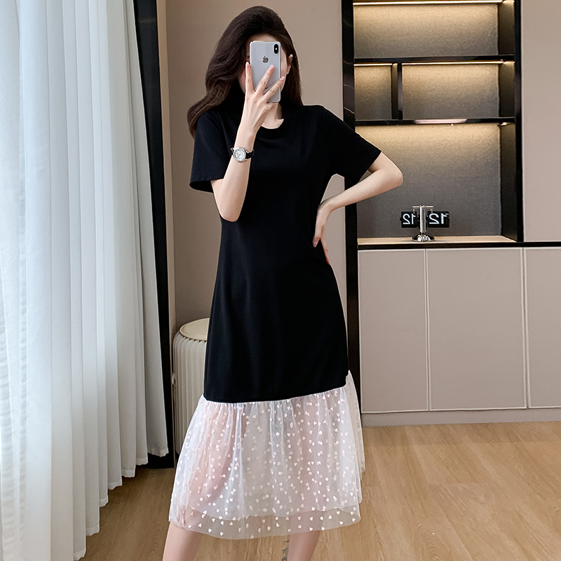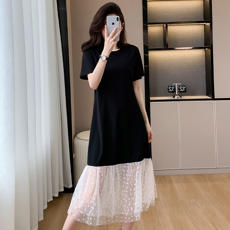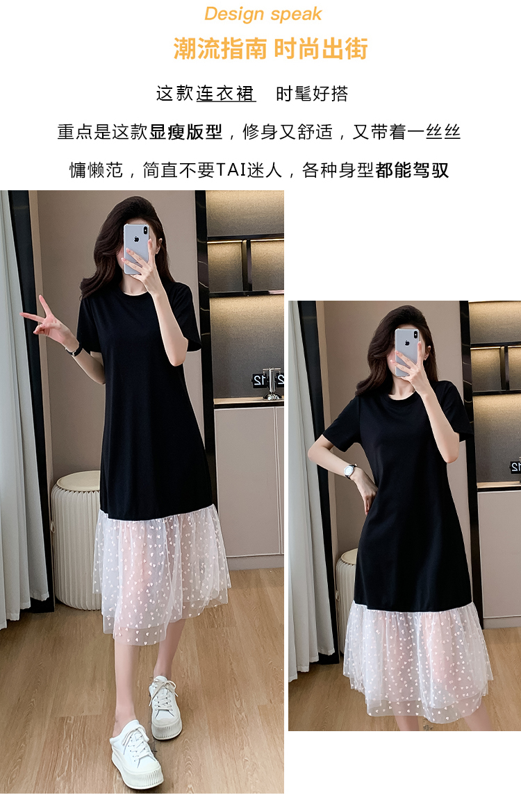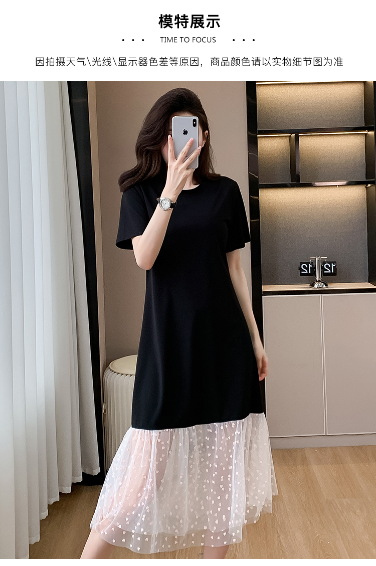 실사 작은 키 구름 실 패치워크 드레스 슬림해 보이는 표지 고기 레이스 커프스 중간 길이 빅 사이즈 티셔츠 치마 여성 여름