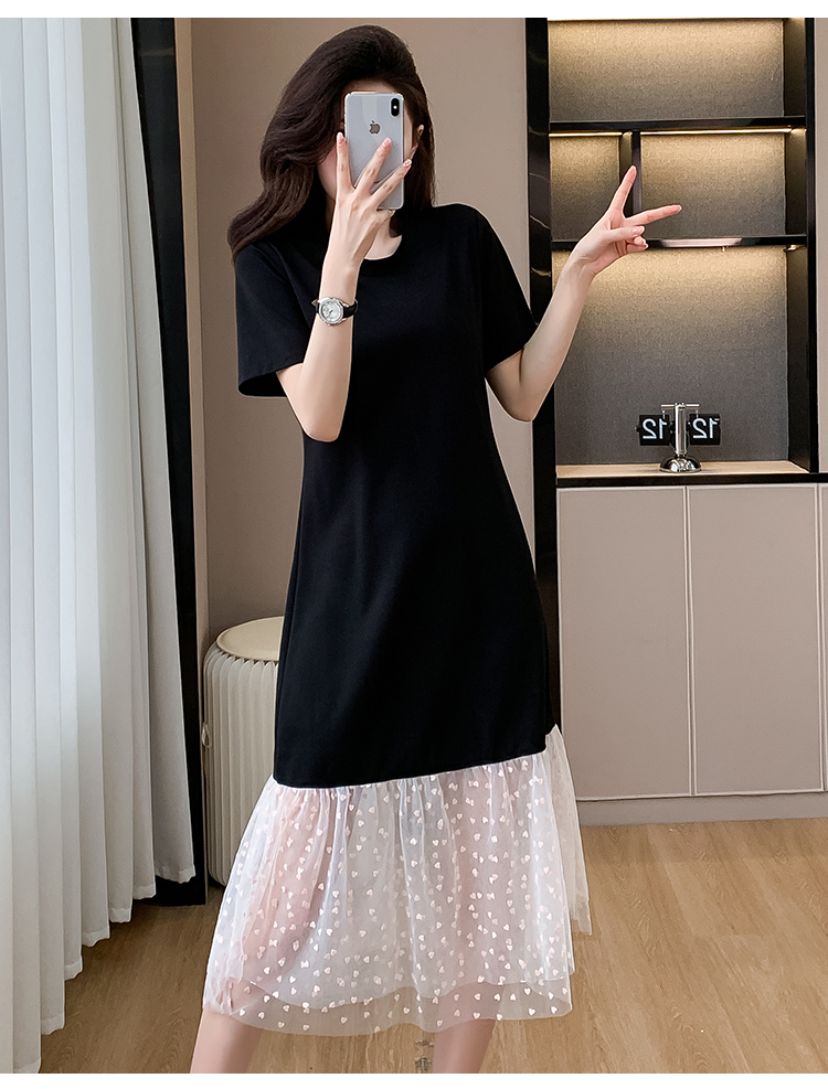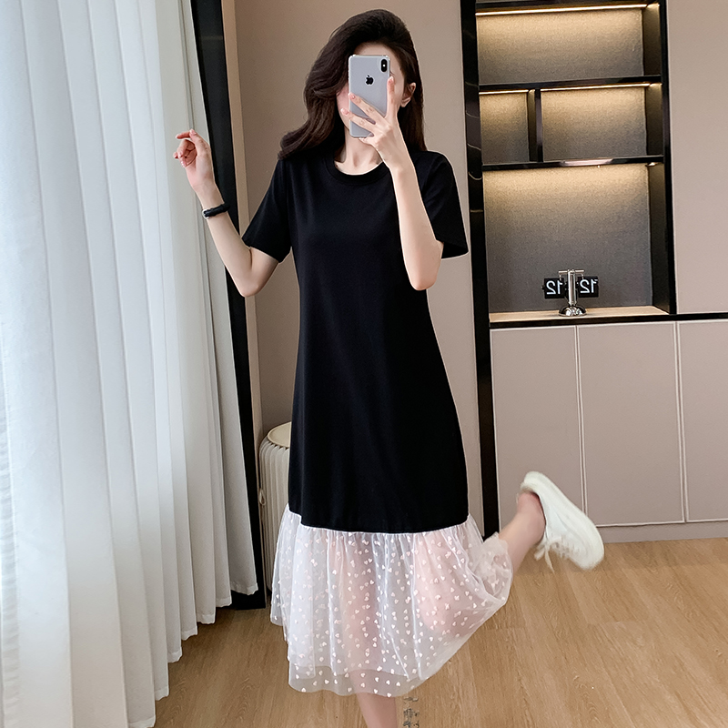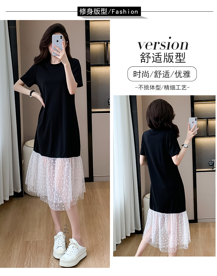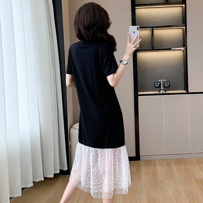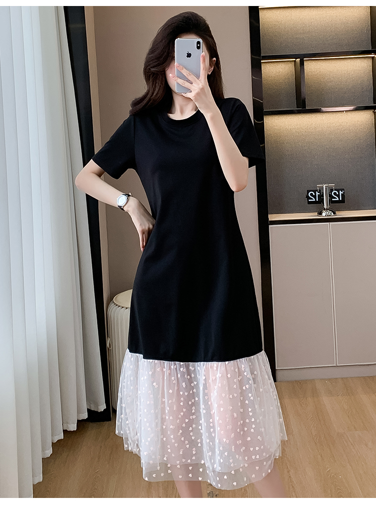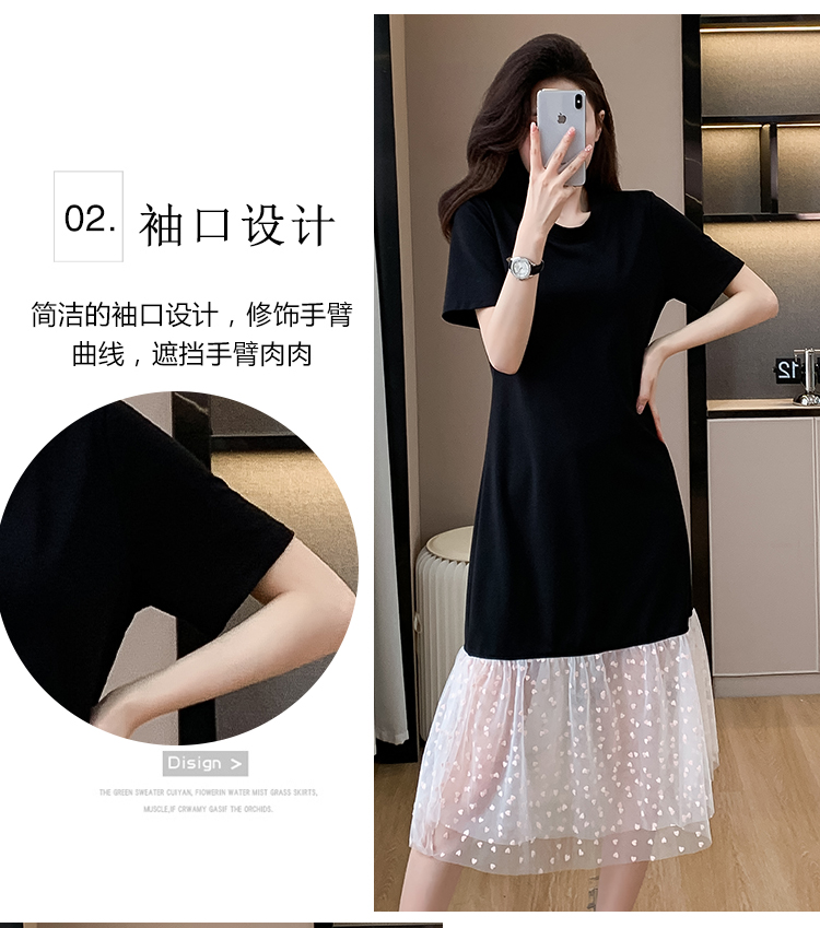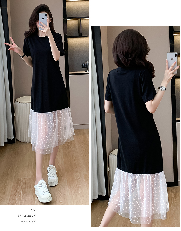 실사 작은 키 구름 실 패치워크 드레스 슬림해 보이는 표지 고기 레이스 커프스 중간 길이 빅 사이즈 티셔츠 치마 여성 여름