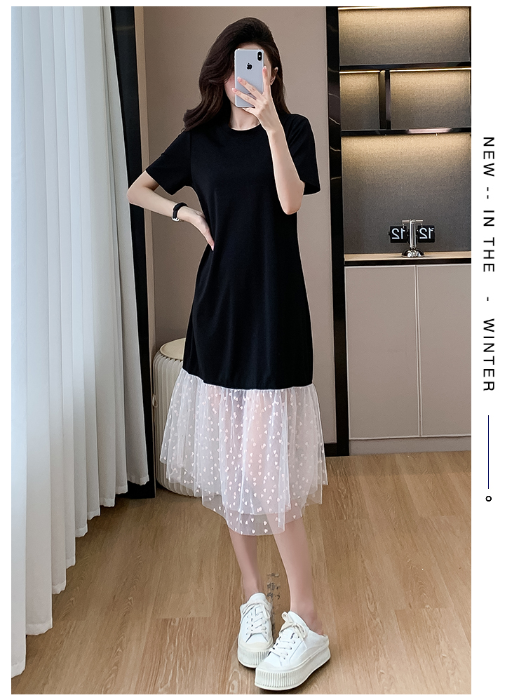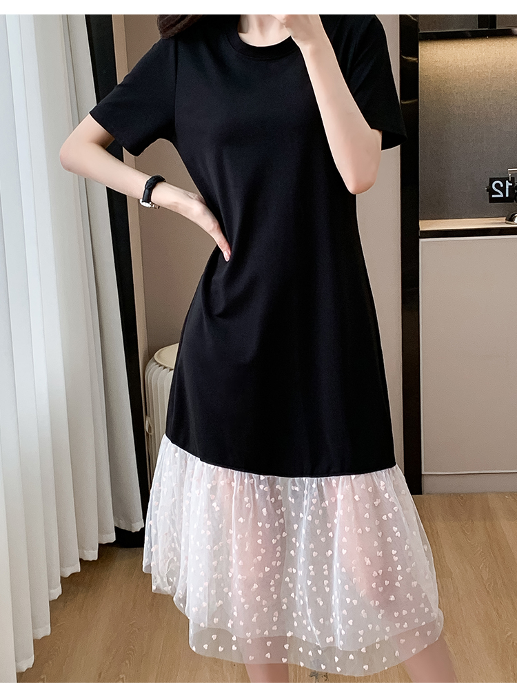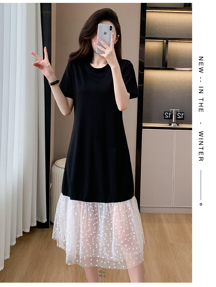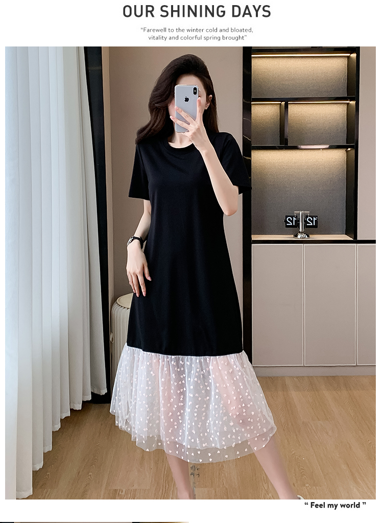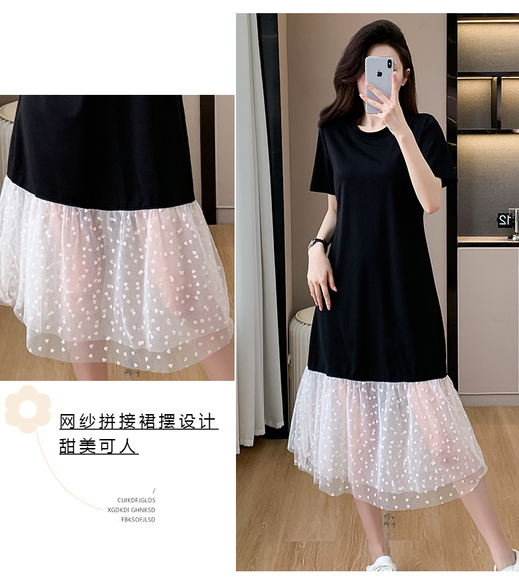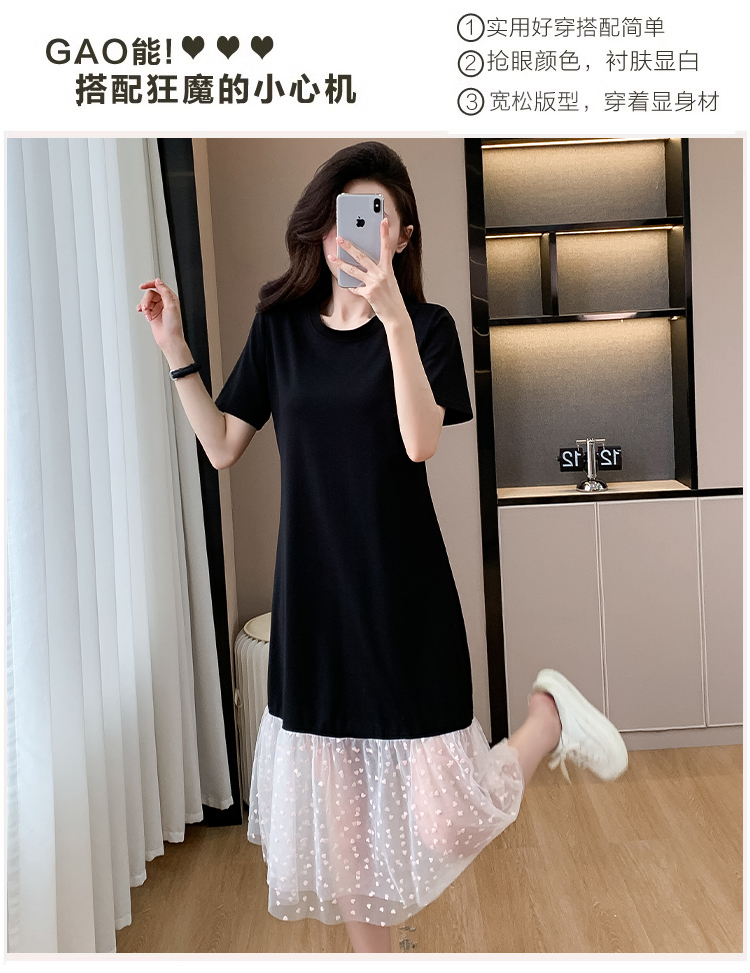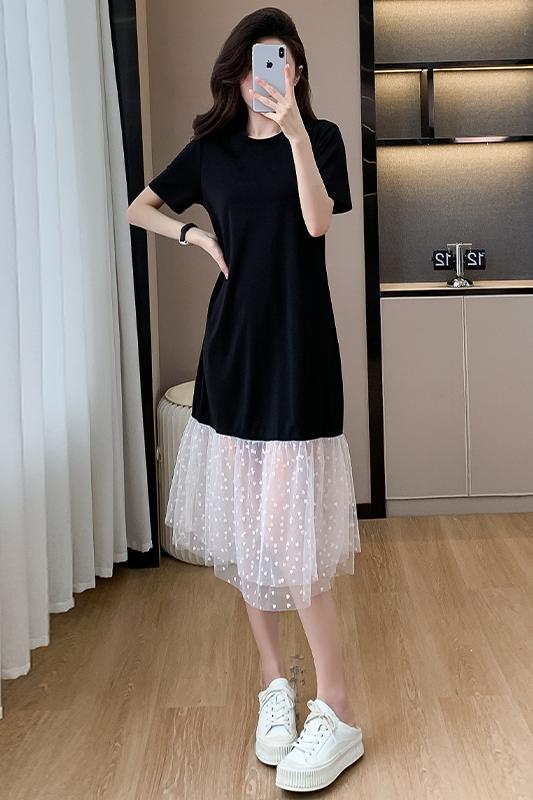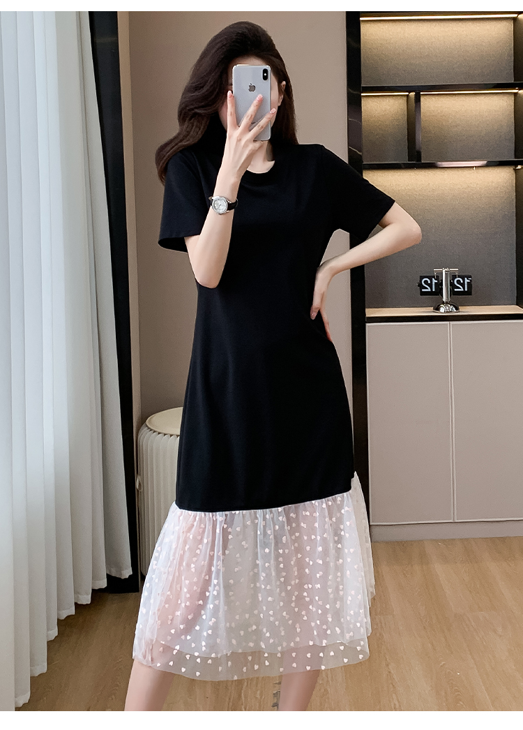 실사 작은 키 구름 실 패치워크 드레스 슬림해 보이는 표지 고기 레이스 커프스 중간 길이 빅 사이즈 티셔츠 치마 여성 여름