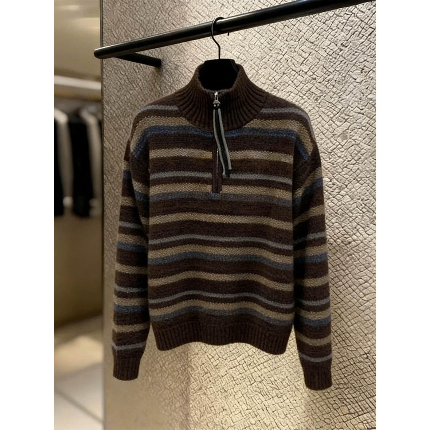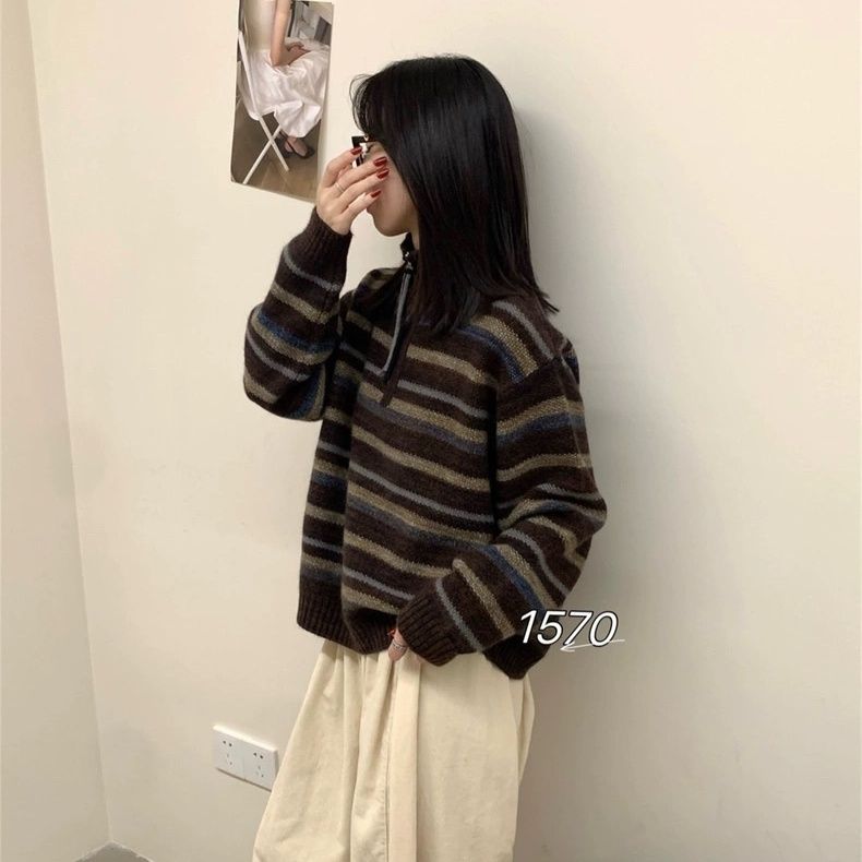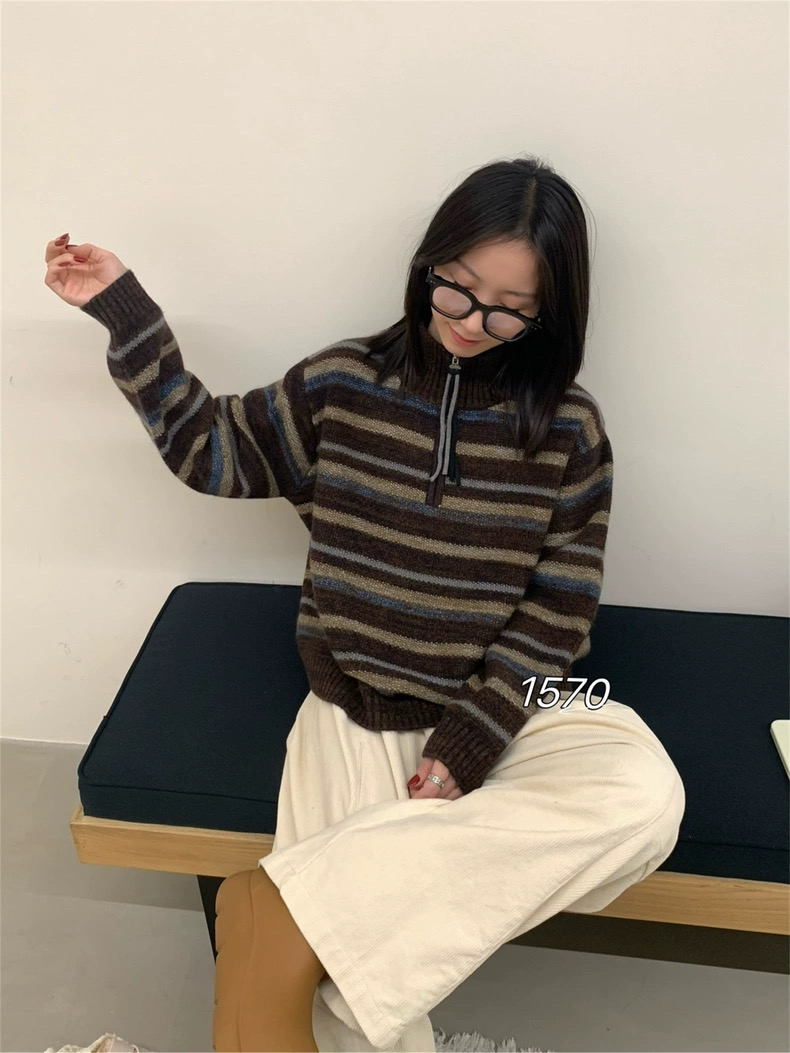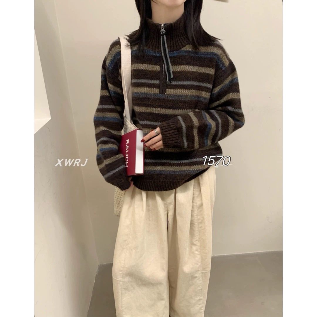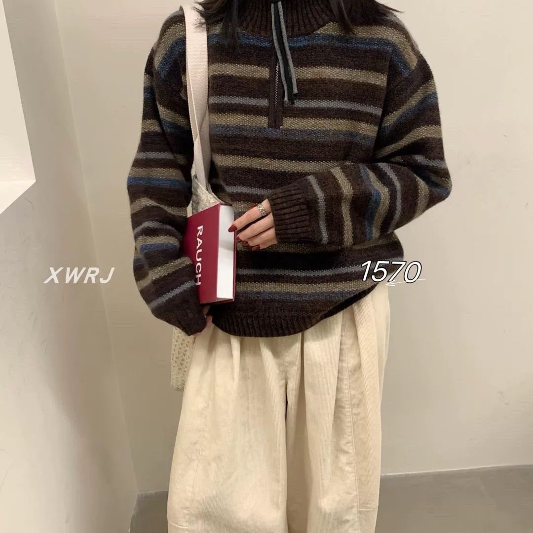 패션 패치워크 색상 플라워 라인 하프 지퍼 스웨터 여자 가을 겨울 새로운 한국 스타일 루즈핏 다용도 캐주얼 스트라이프 니트 맨위