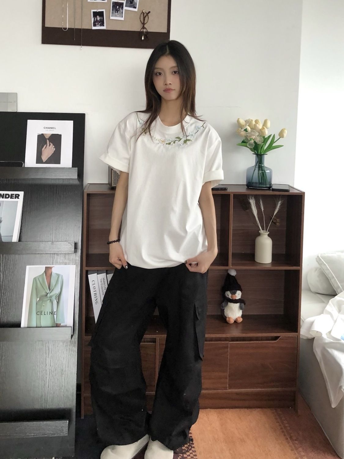 정가 자수 두 바늘 순면 220 그램 빗질하다 닫기 반팔 티셔츠 여성
