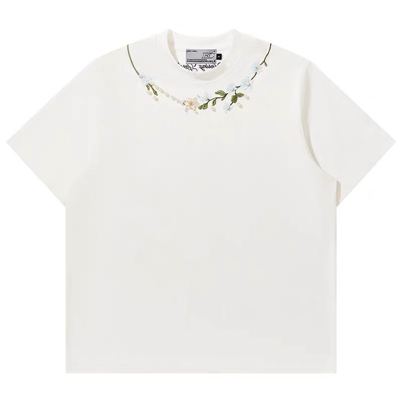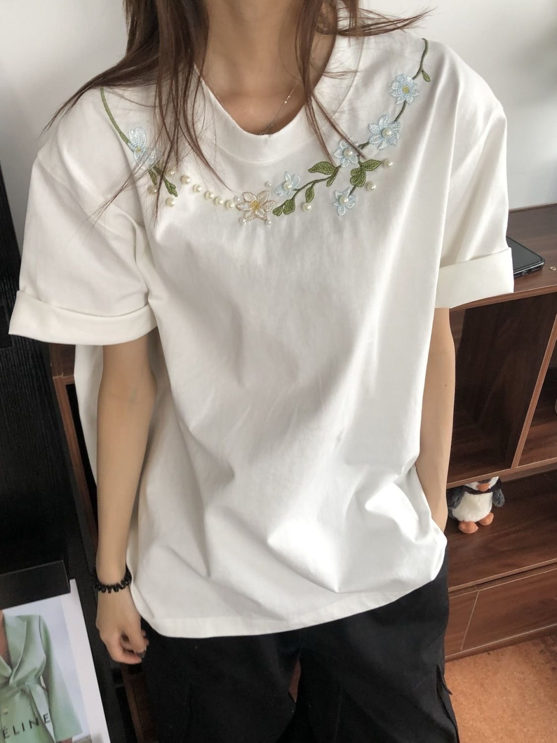 정가 구슬 조각 자수 순면 220 그램 빗질하다 닫기 반팔 티셔츠 여성