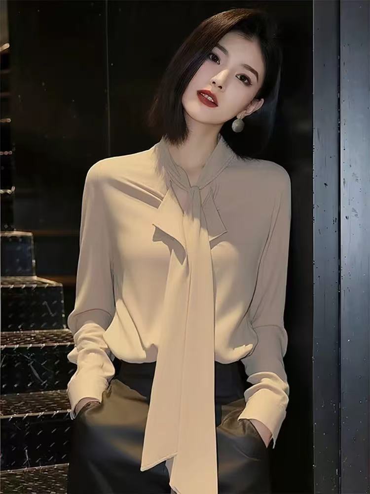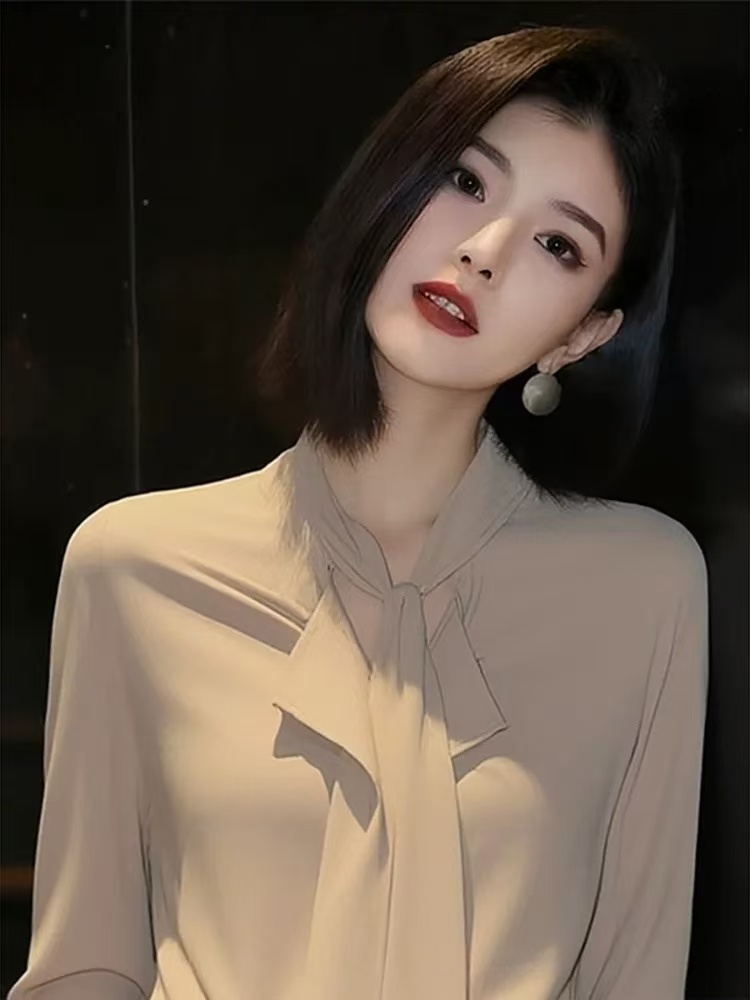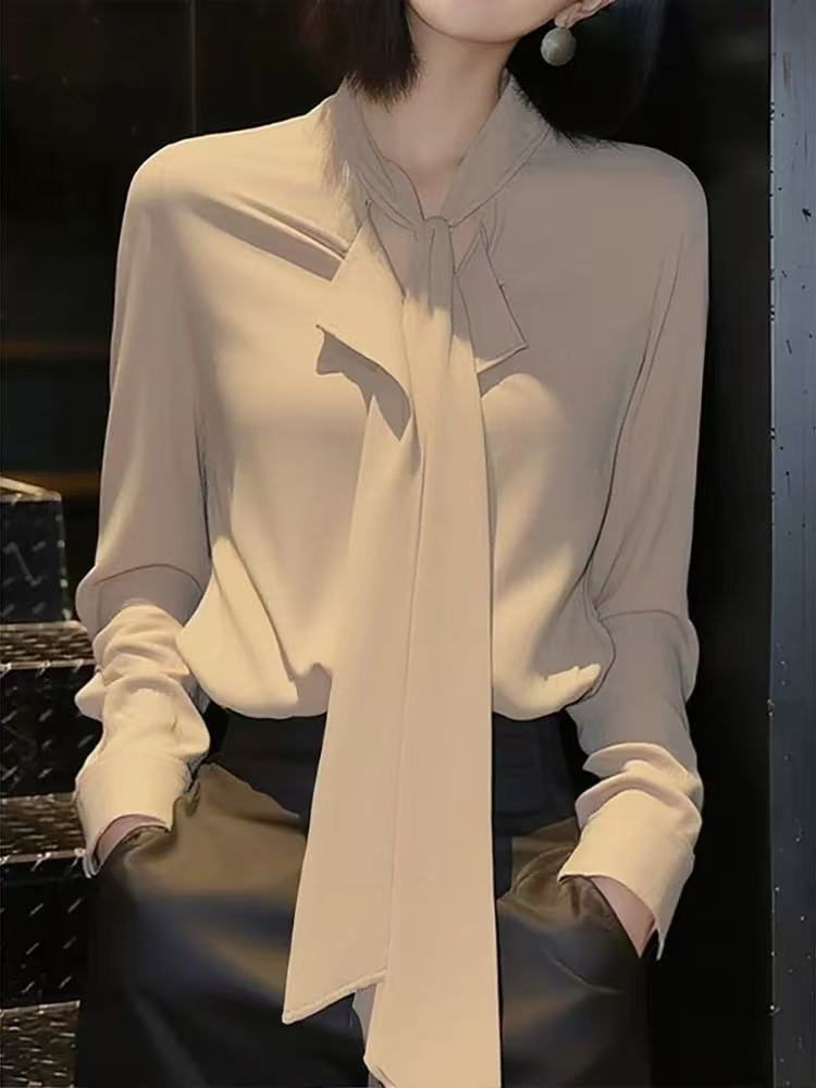 빛 럭셔리 우아함 바람 리본 여성 셔츠 봄 2026 새로운 품격 긴팔 카키 색 디자인 센스 출퇴근 맨위