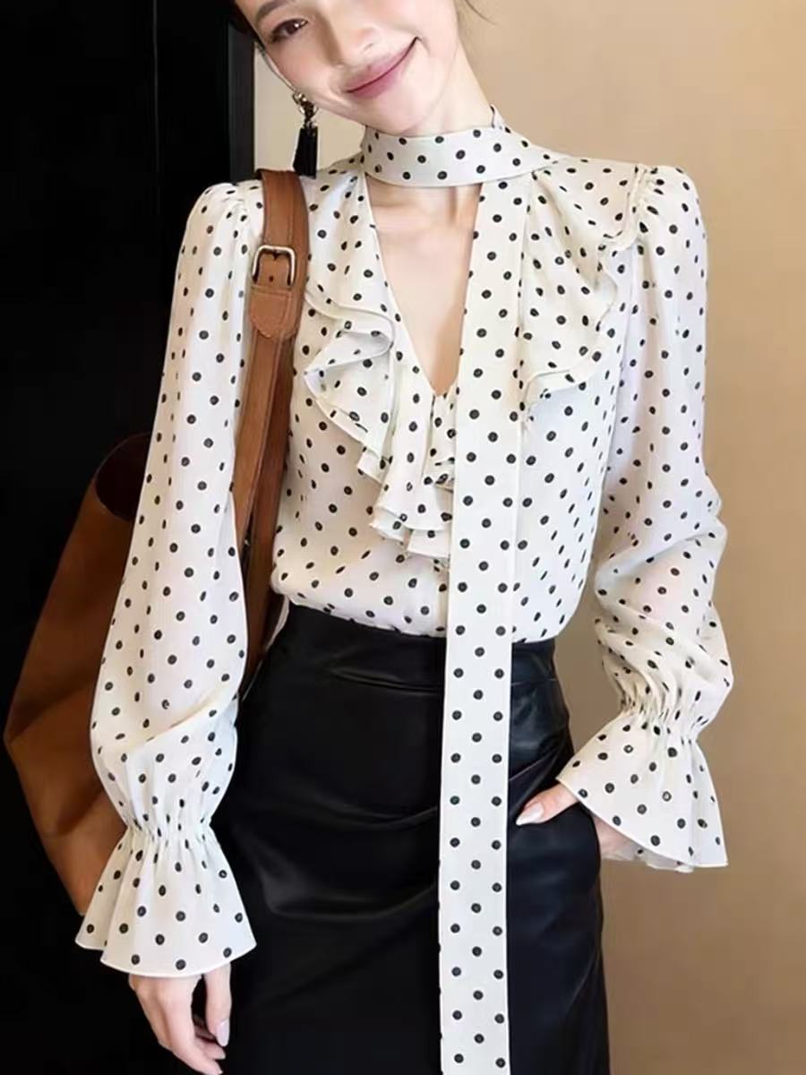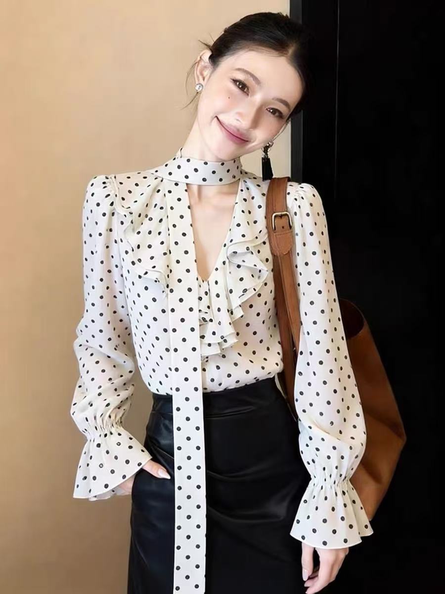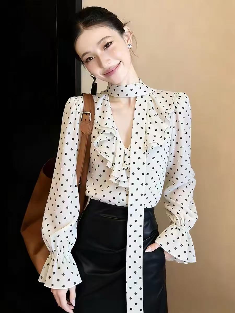 2026 새로운 고급 센스 슈퍼 잘 생긴 작은 대중 아니요 명중 섹션 맨위 연령 감소 외국 가스 도트 무늬 리본 여성 셔츠 봄