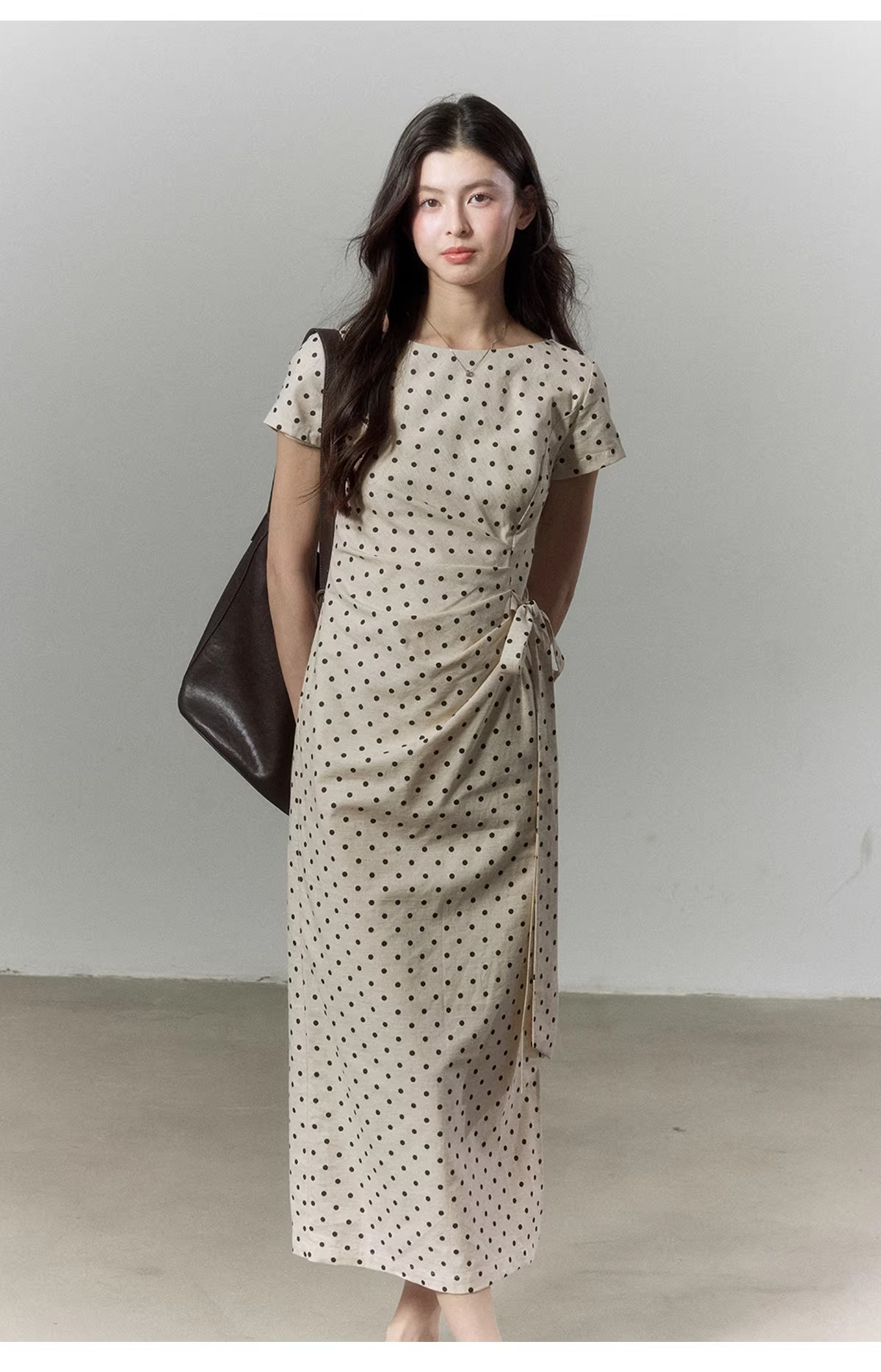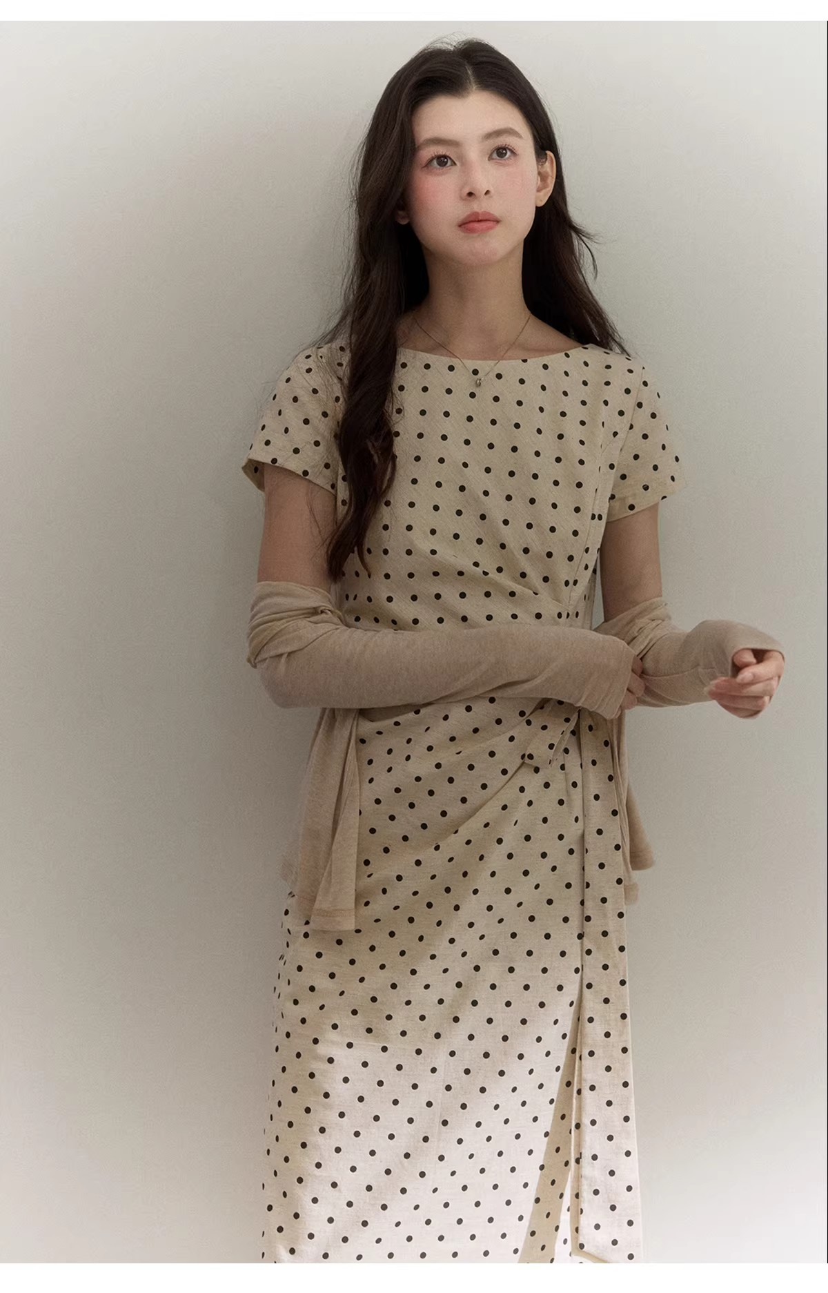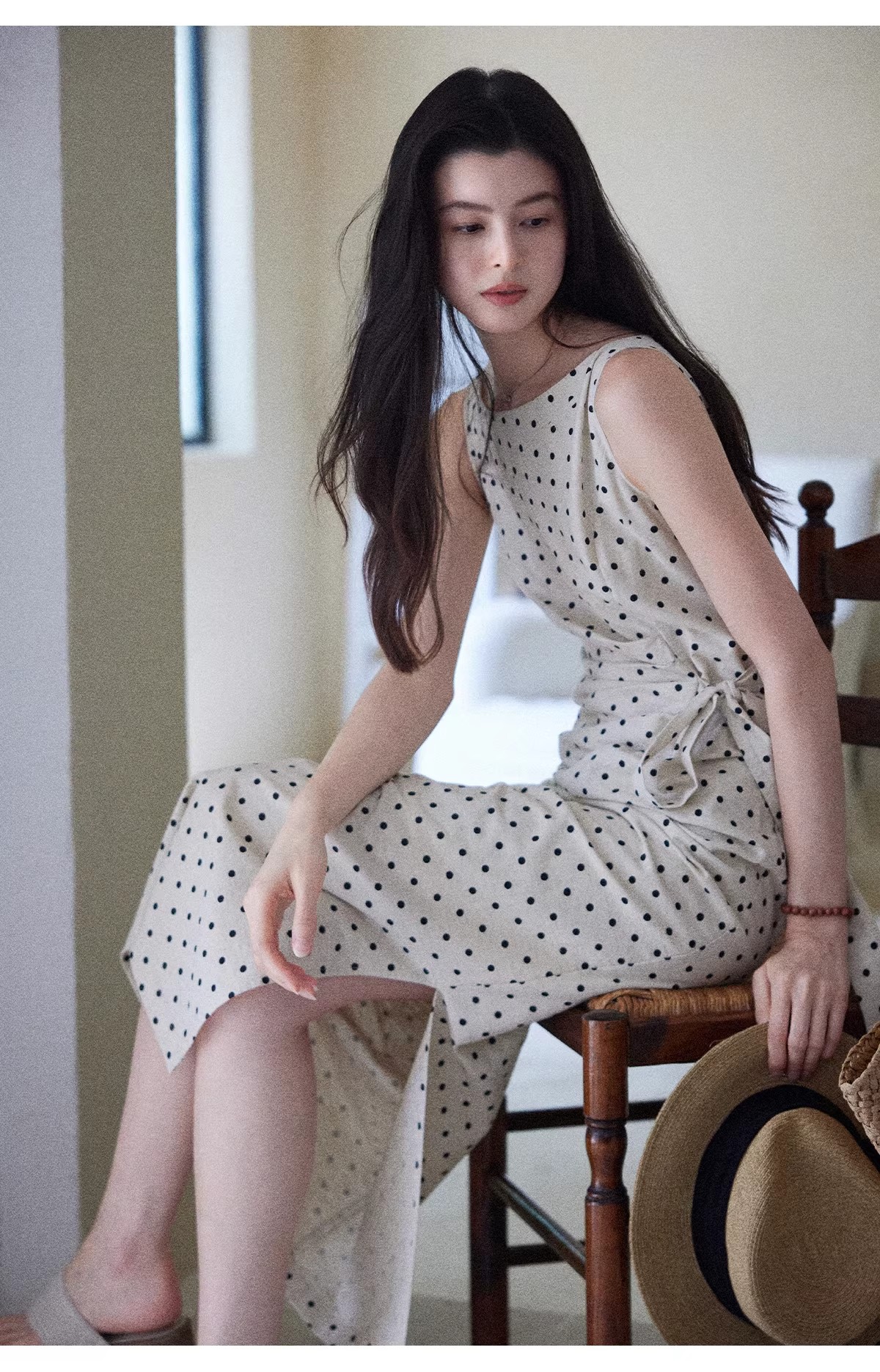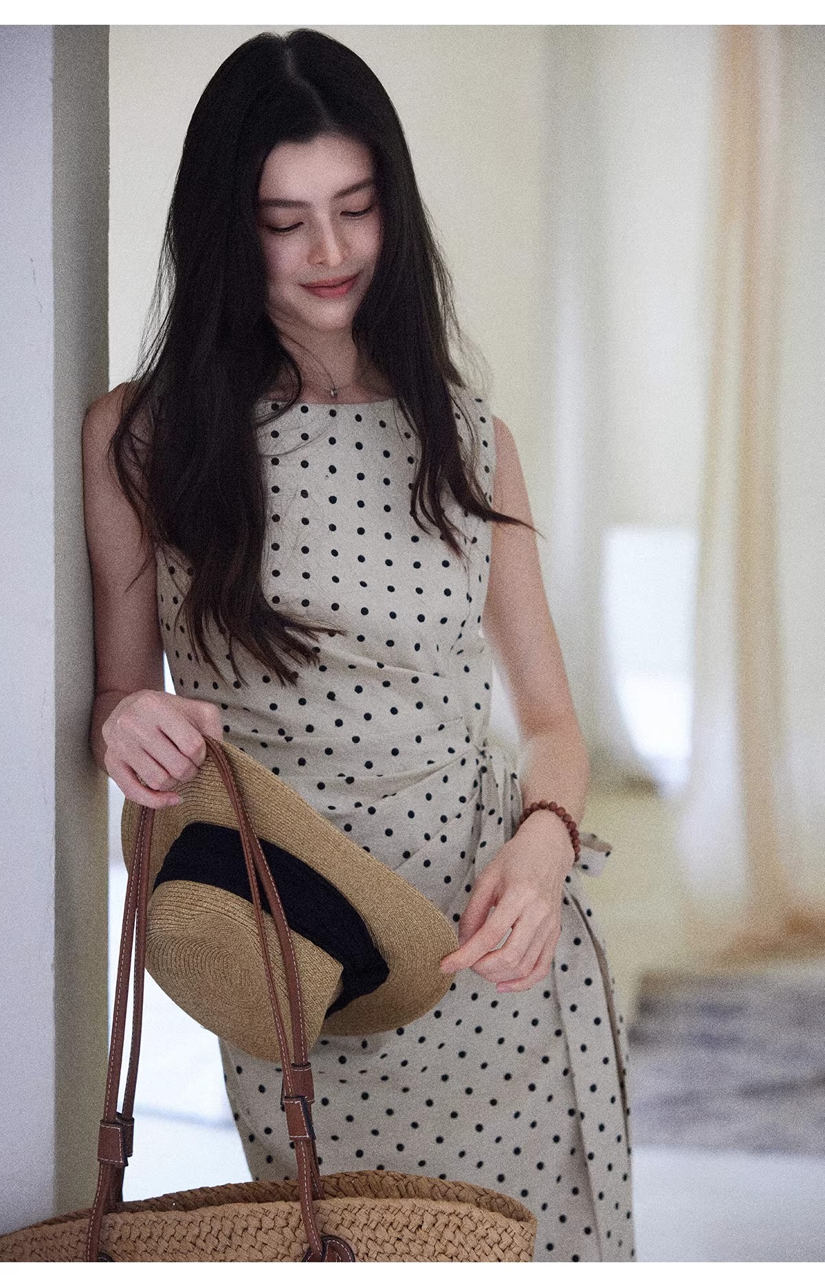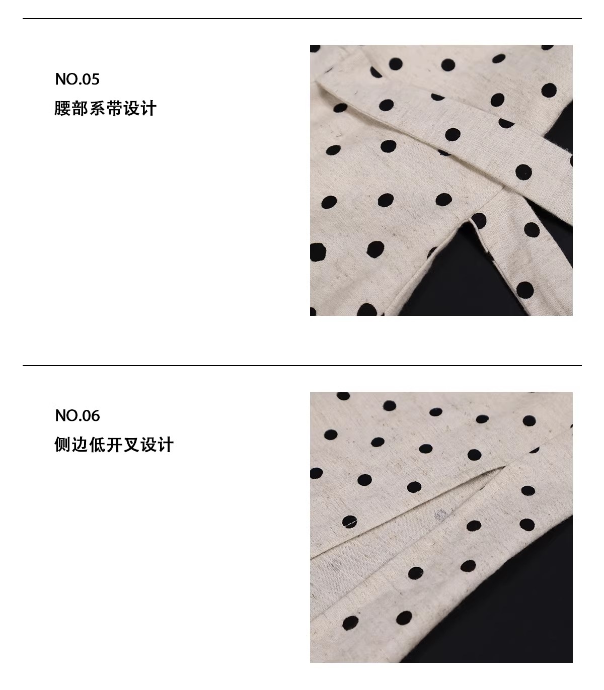 소나무 객실 달 고급 센스 품격 도트 무늬 여성 드레스 측면 허리 수축 리넨 면화 프랑스식 롱 스커트