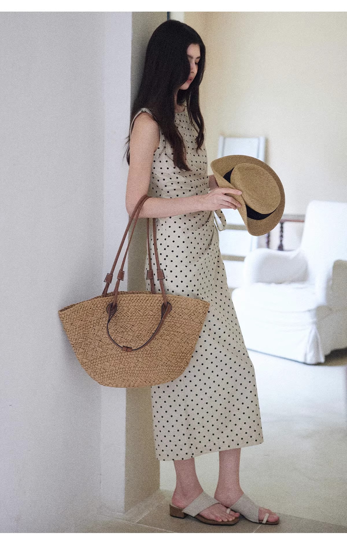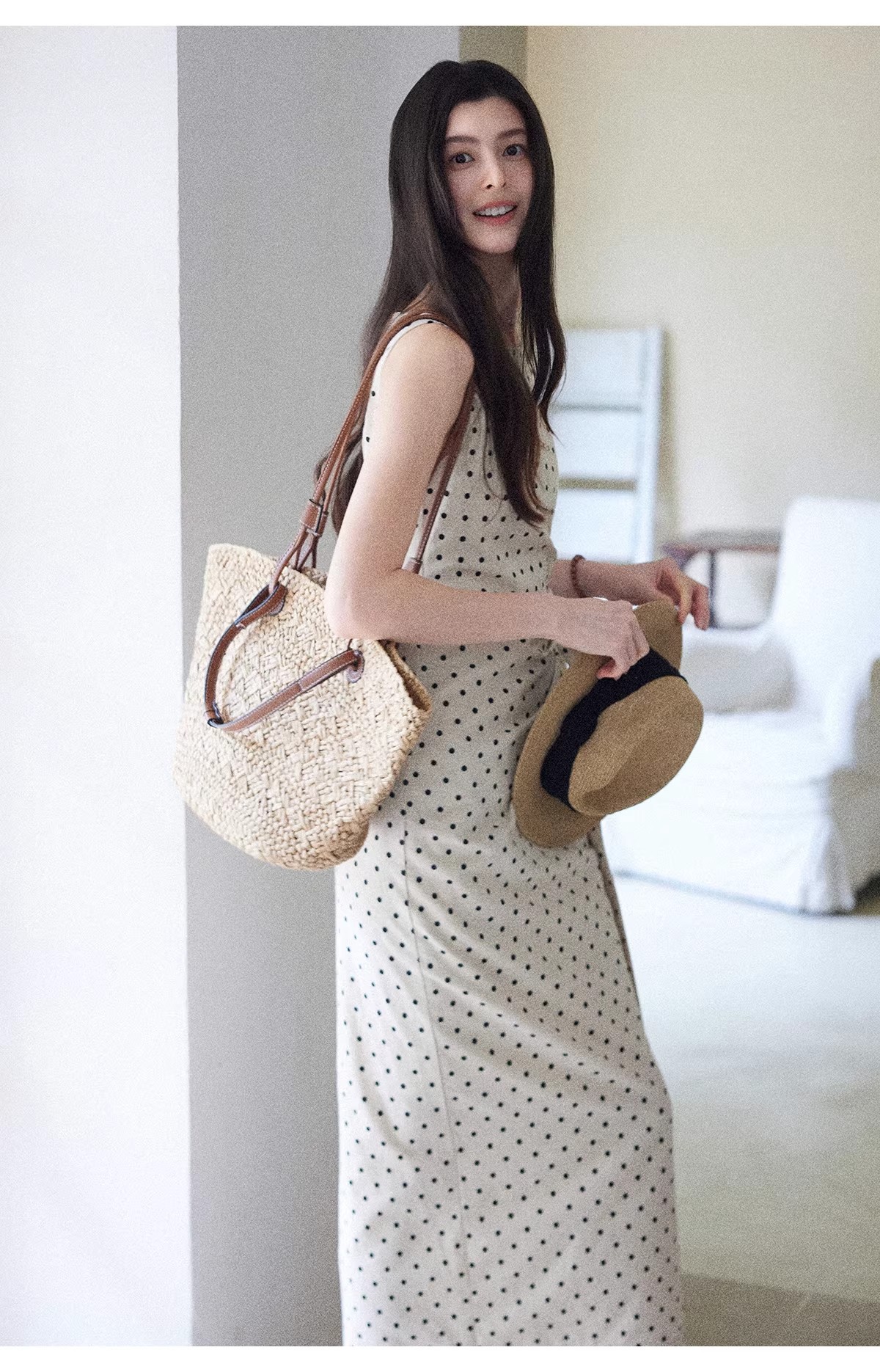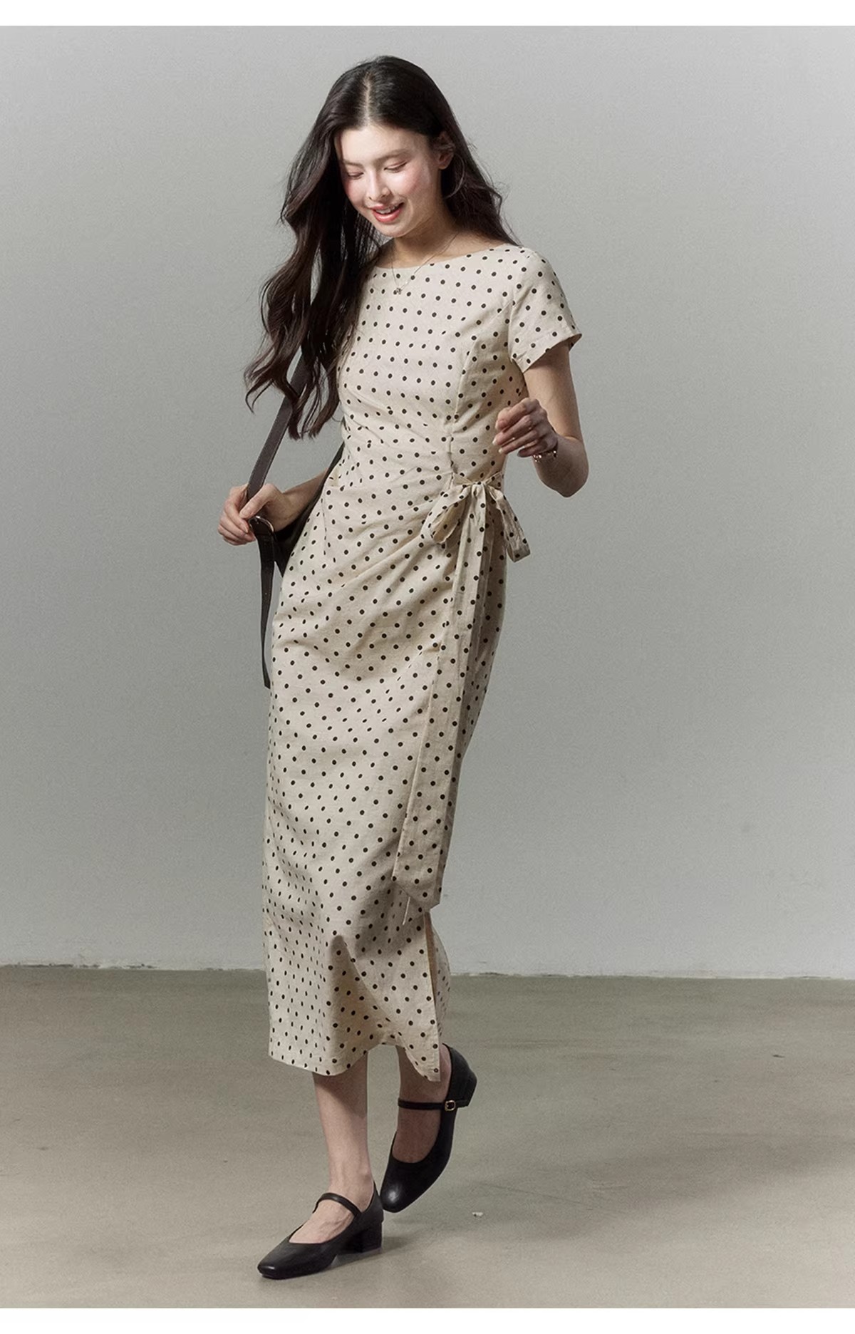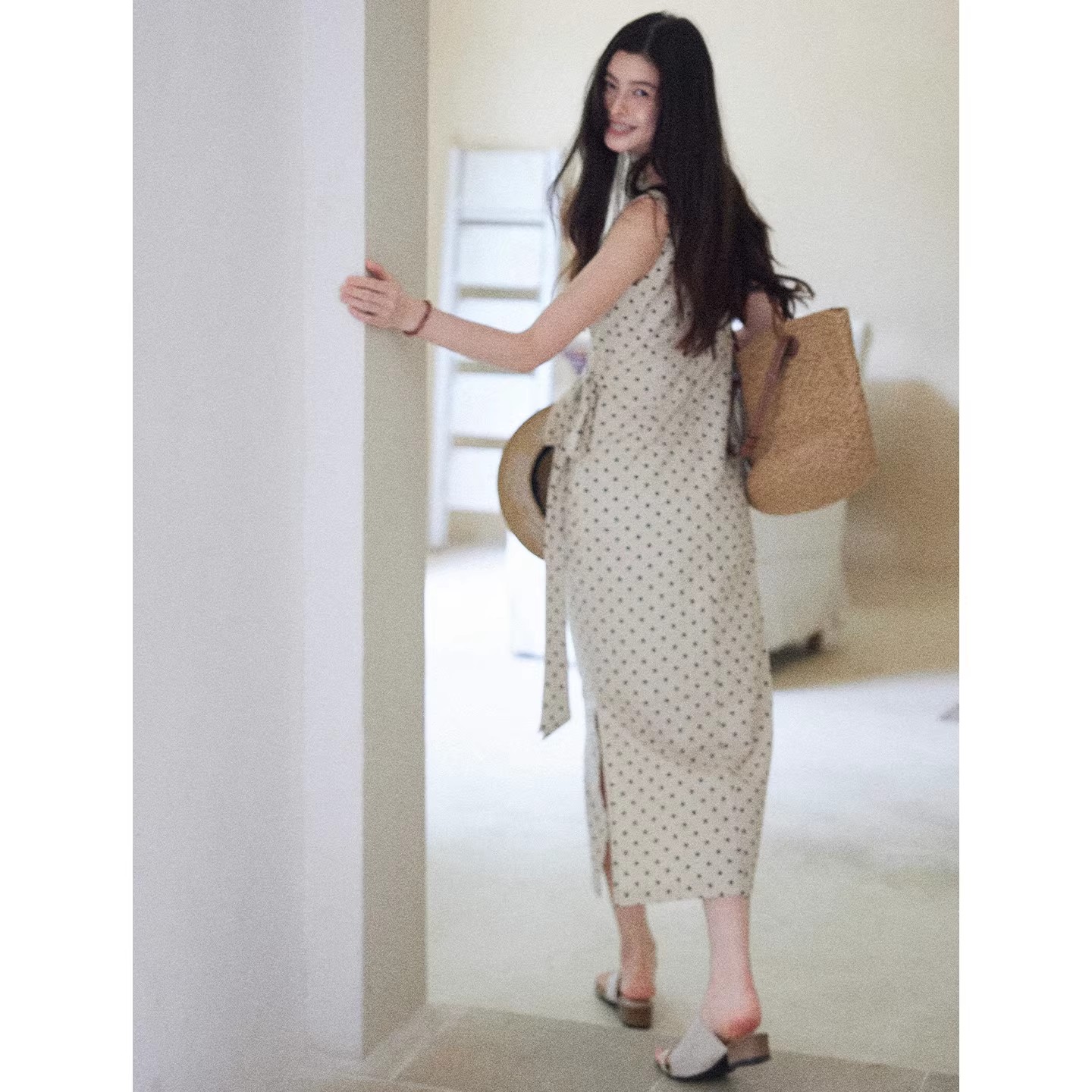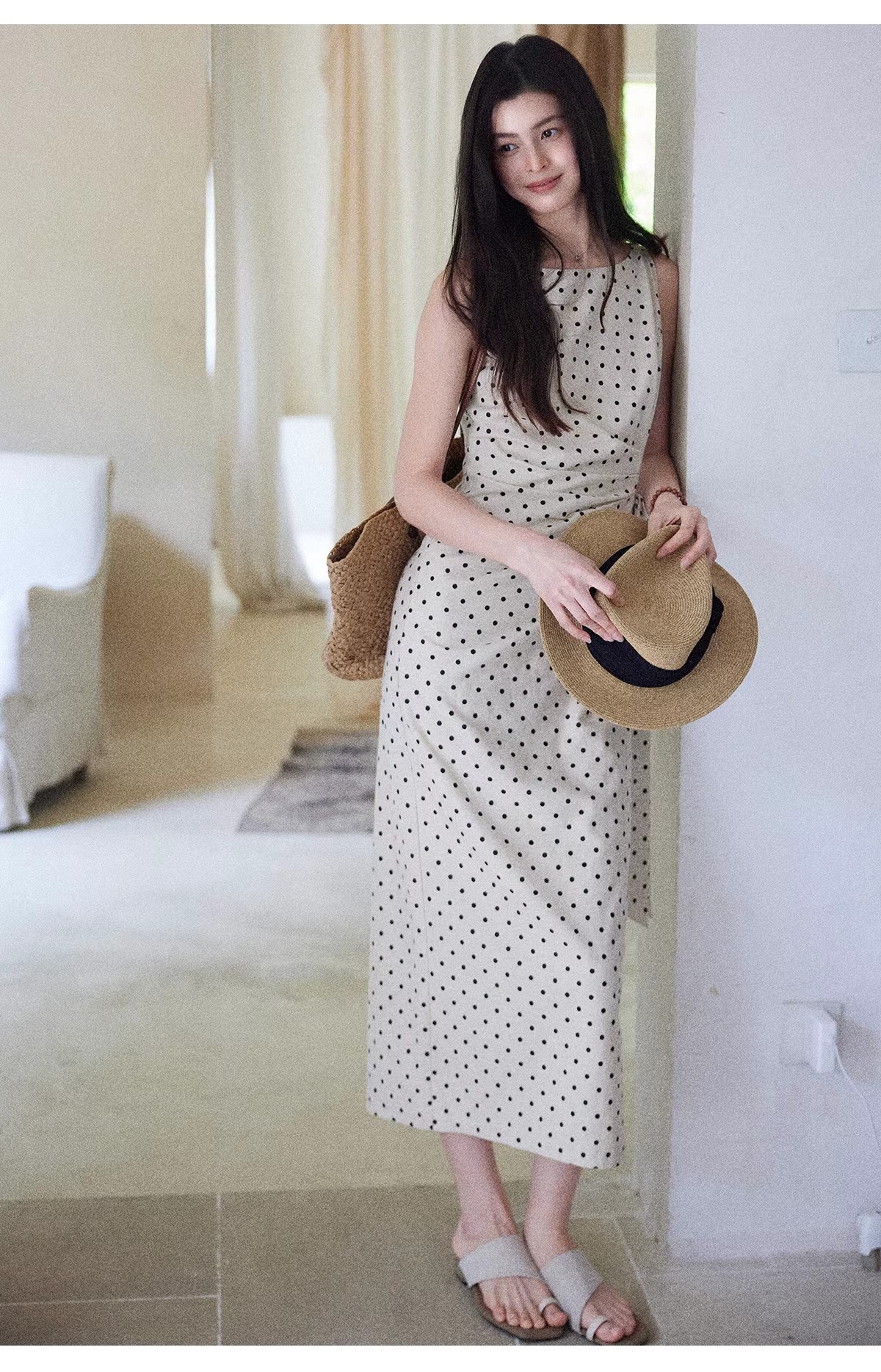 소나무 객실 달 고급 센스 품격 도트 무늬 여성 드레스 측면 허리 수축 리넨 면화 프랑스식 롱 스커트