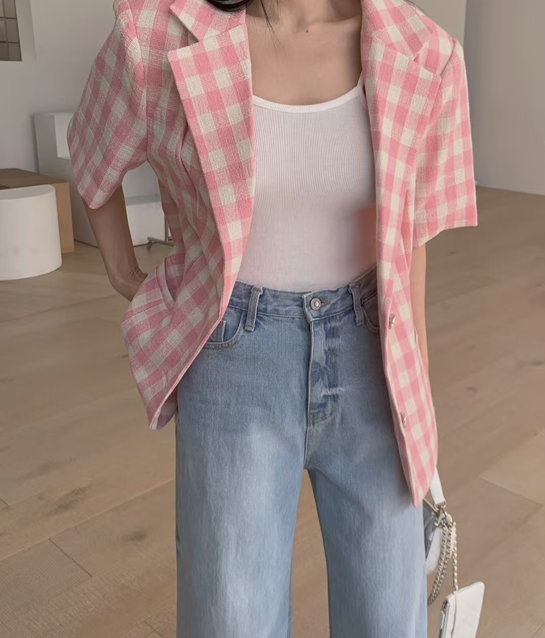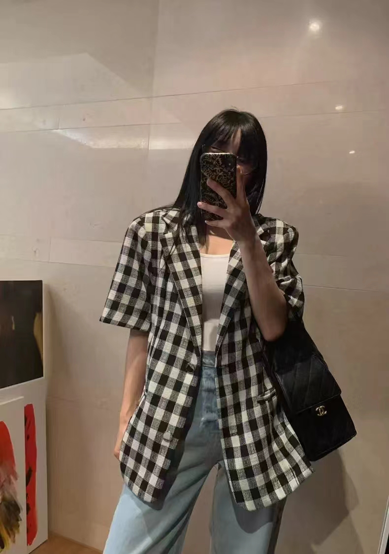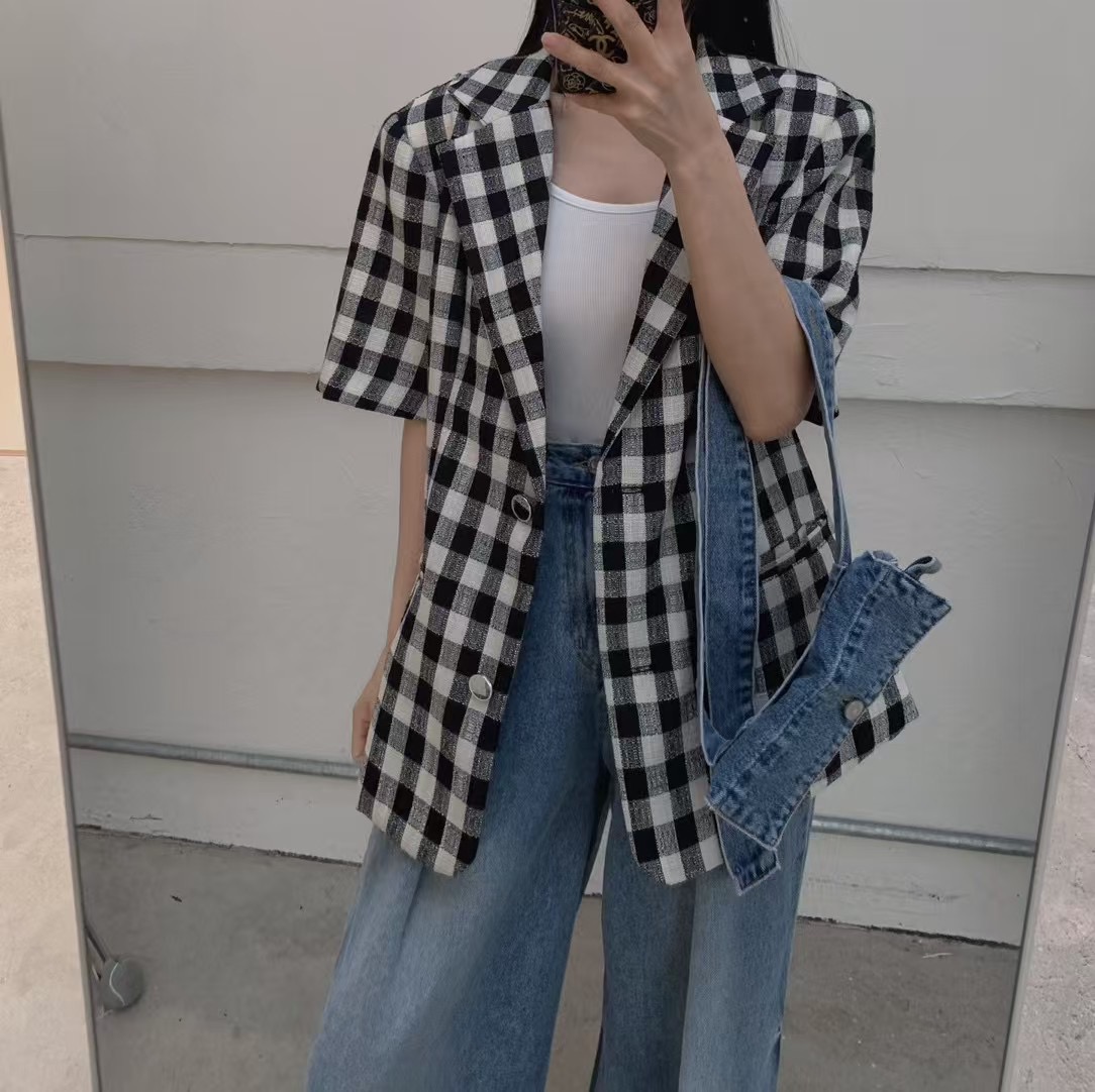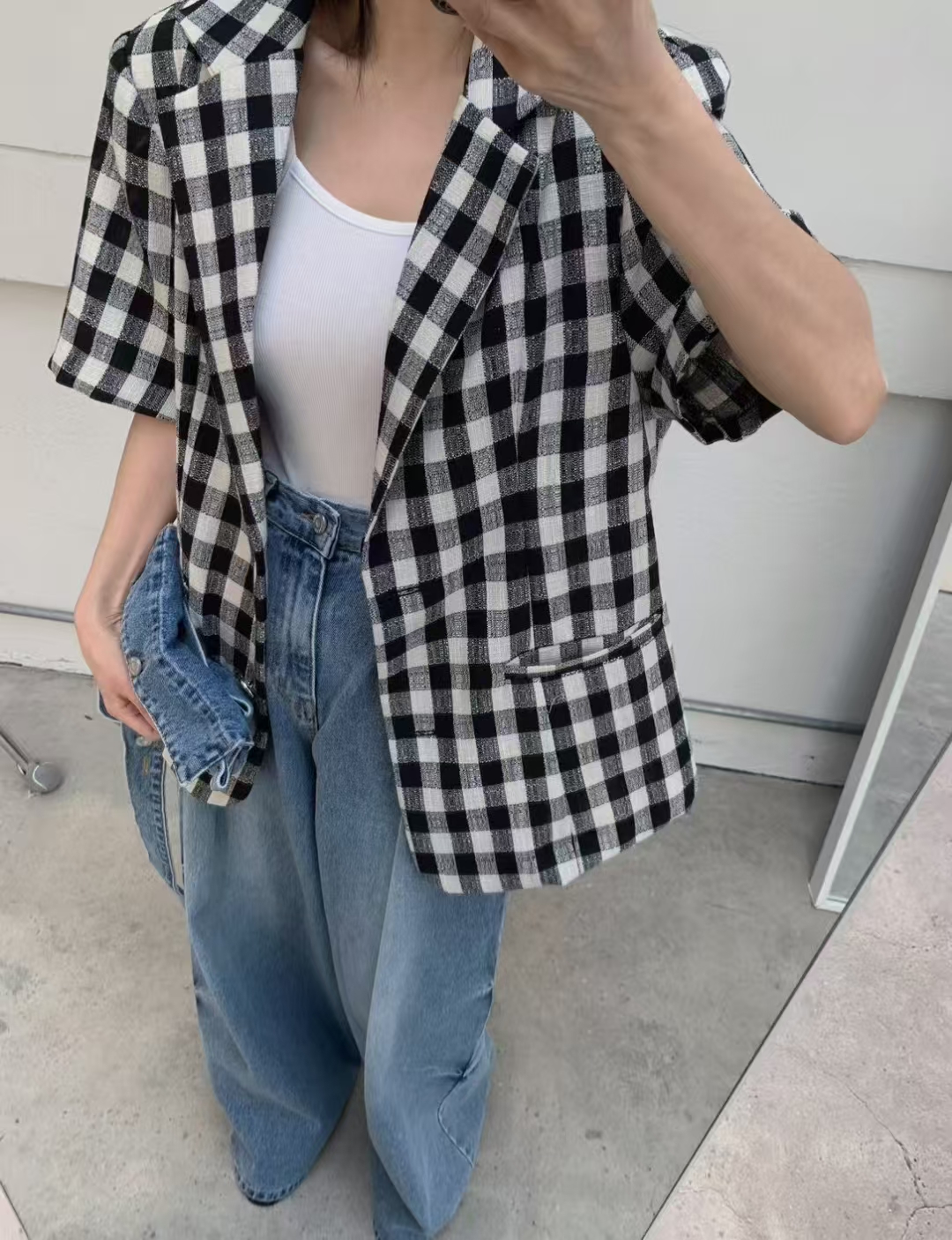 재고 있음 한국 동대문 여름 새로운 패치워크 색상 체크무늬 부서 버클 폴로 칼라 재킷