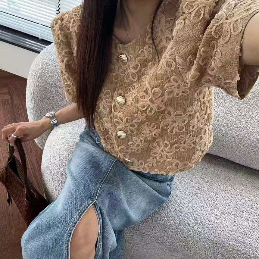 재고 있음 한국 여성 의류 해야한다 프랑스식 작은 샤넬 스타일 3 차원 꽃 자수 거품 소매 반팔 셔츠 여성 코트