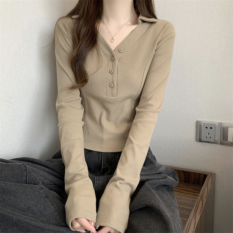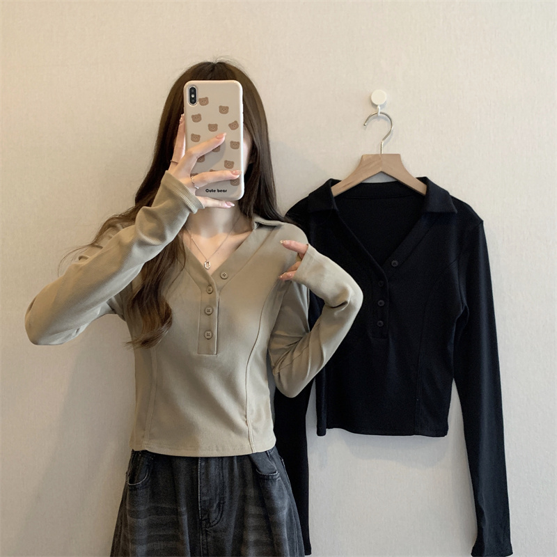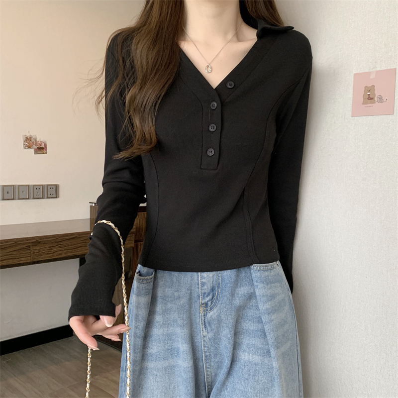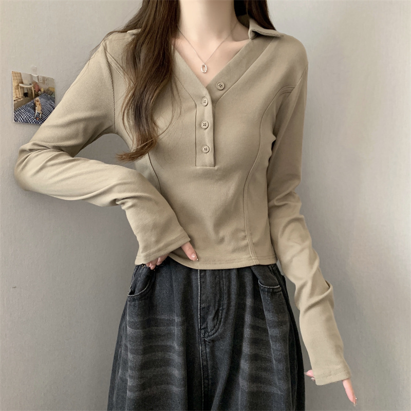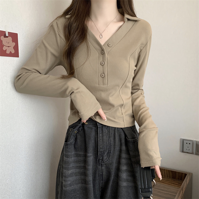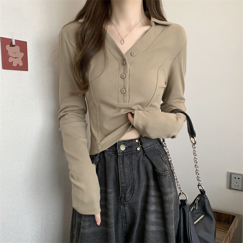 봄 새로운 V넥 어깨 패드 몸매 가꾸기 핫걸 긴팔 POLO 셔츠 여성 짧은 허리 수축 작은 대중 생선뼈 티셔츠
