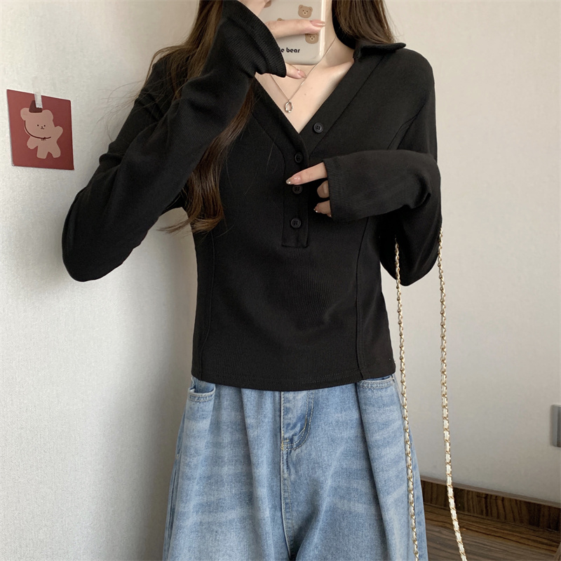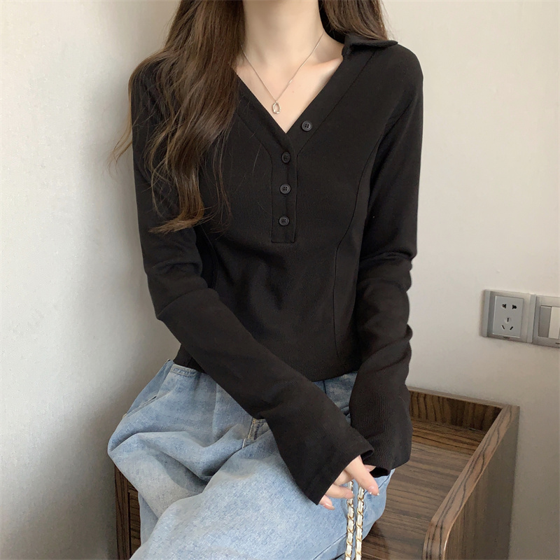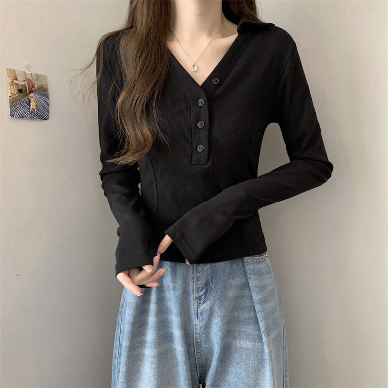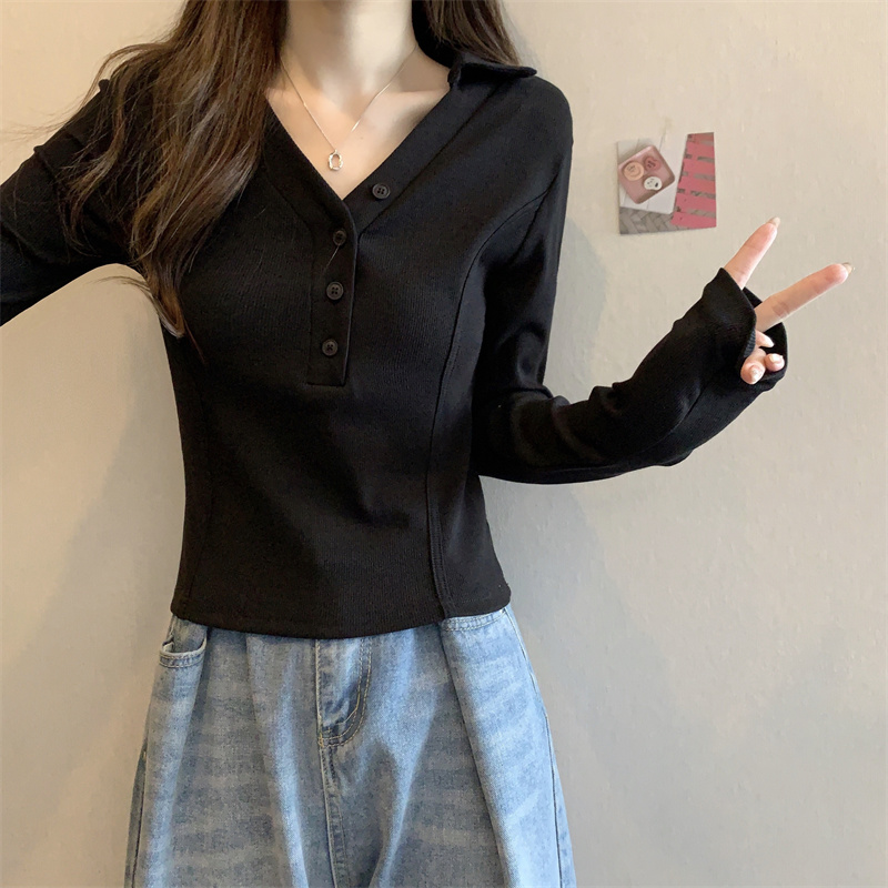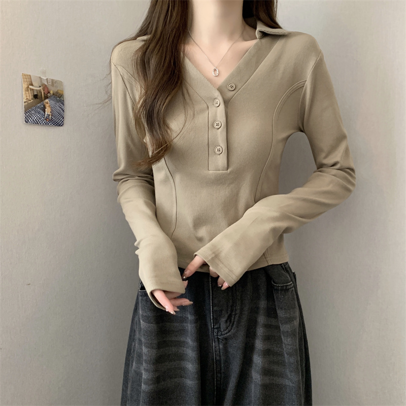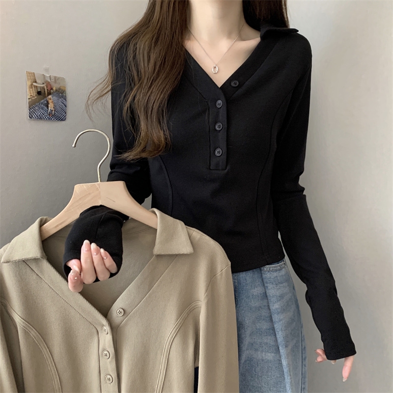 봄 새로운 V넥 어깨 패드 몸매 가꾸기 핫걸 긴팔 POLO 셔츠 여성 짧은 허리 수축 작은 대중 생선뼈 티셔츠