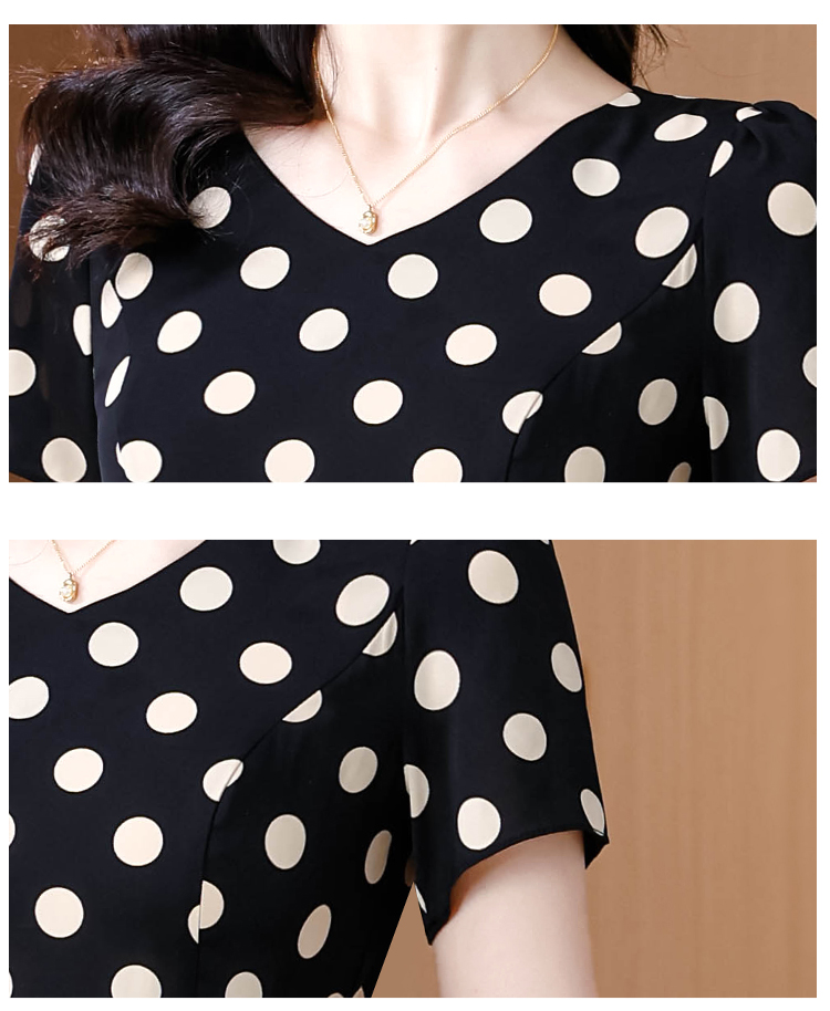 실사 여름 새로운 레트로 도트 무늬 리본 V넥 품격 반팔 니트 스웨터 여성 루즈핏 연령 감소 디자인 맨위