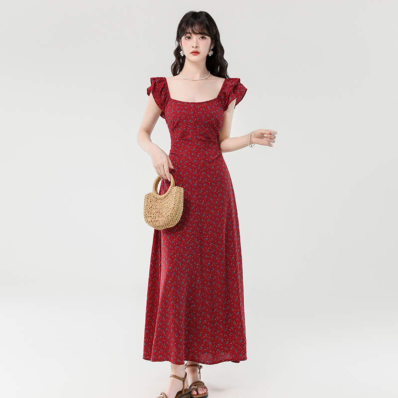 실사 2026 여름 새로운 프랑스식 레이스업 휴가 바람 허리 수축 슬림해 보이는 롱 코트 쉬폰 꽃무늬 슬립 드레스
