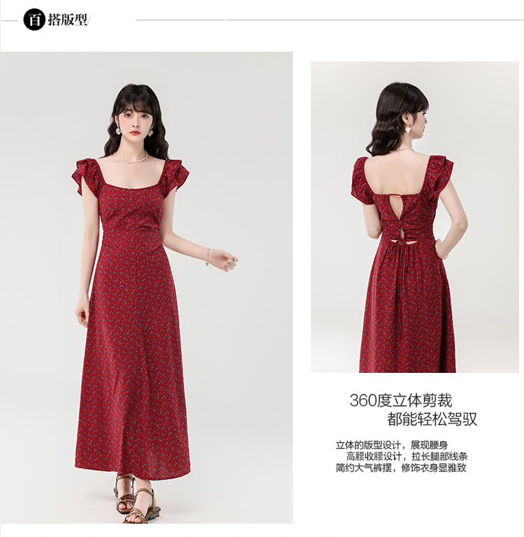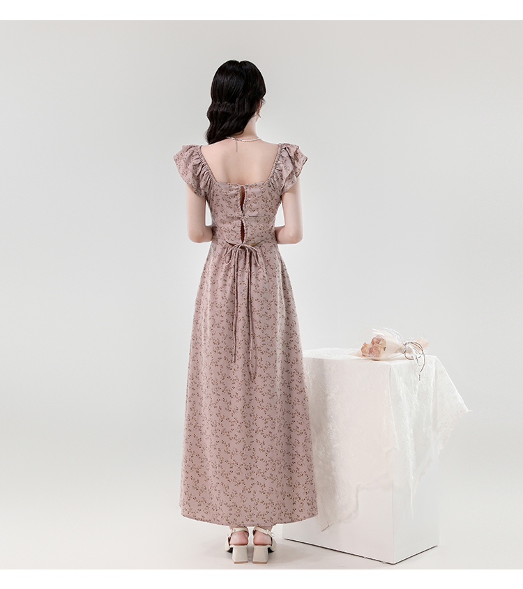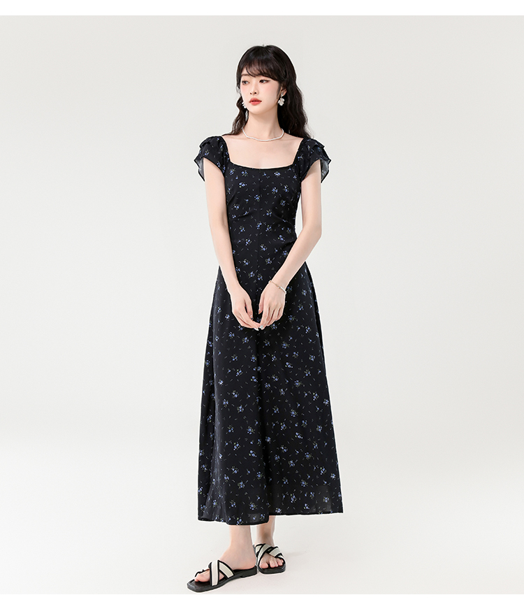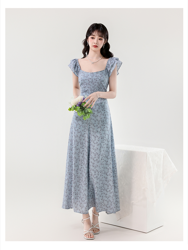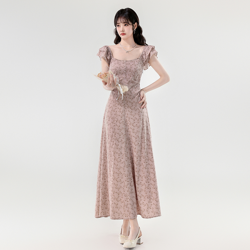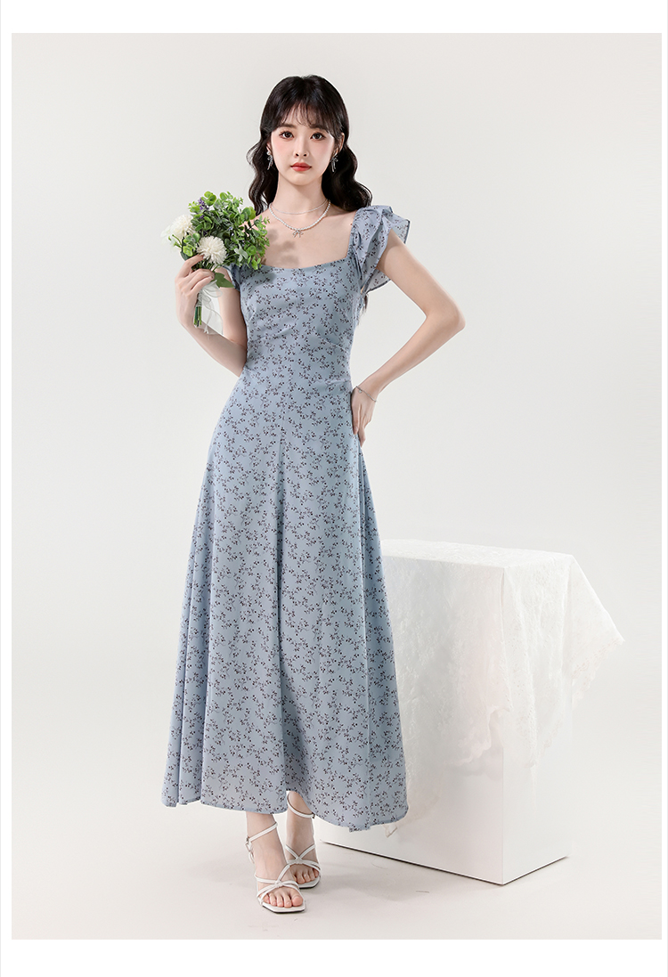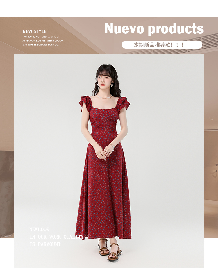 실사 2026 여름 새로운 프랑스식 광장 칼라 작은 날다 소매 롱 코트 슬림해 보이는 프린트 남쪽 법도 가짜 바람 드레스