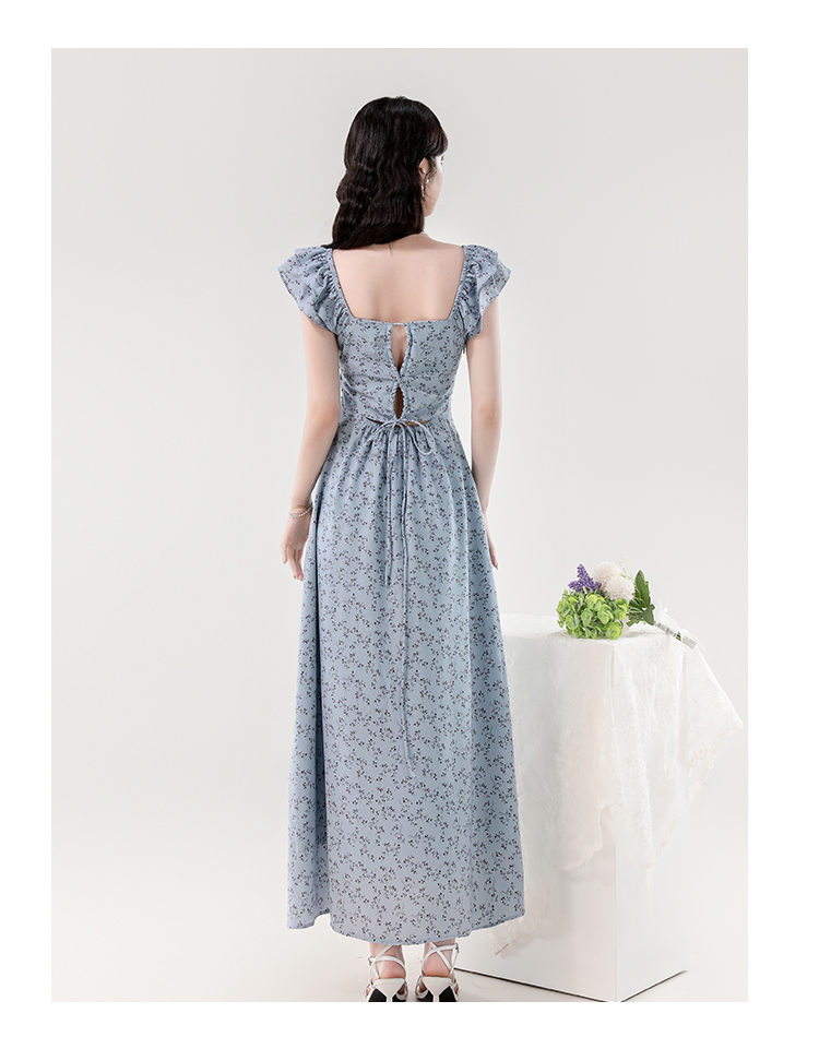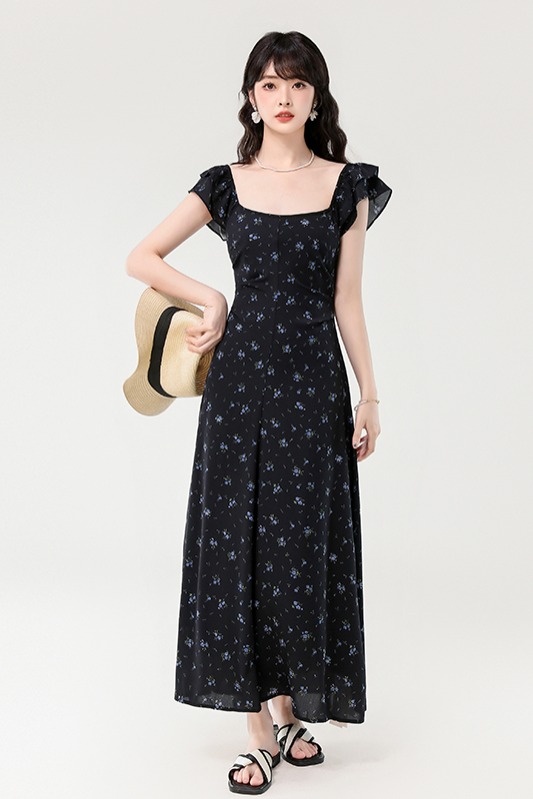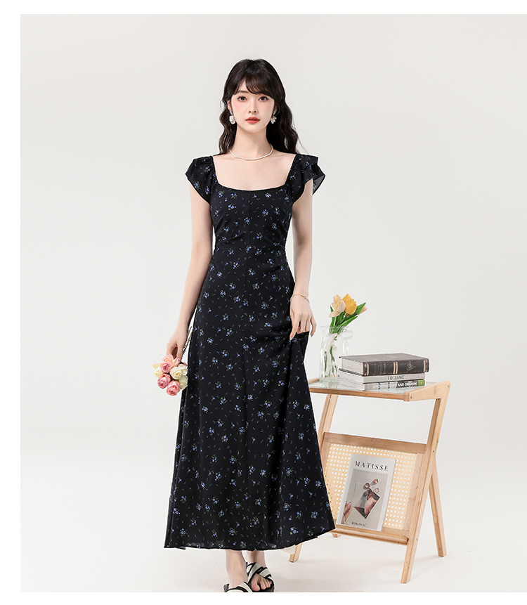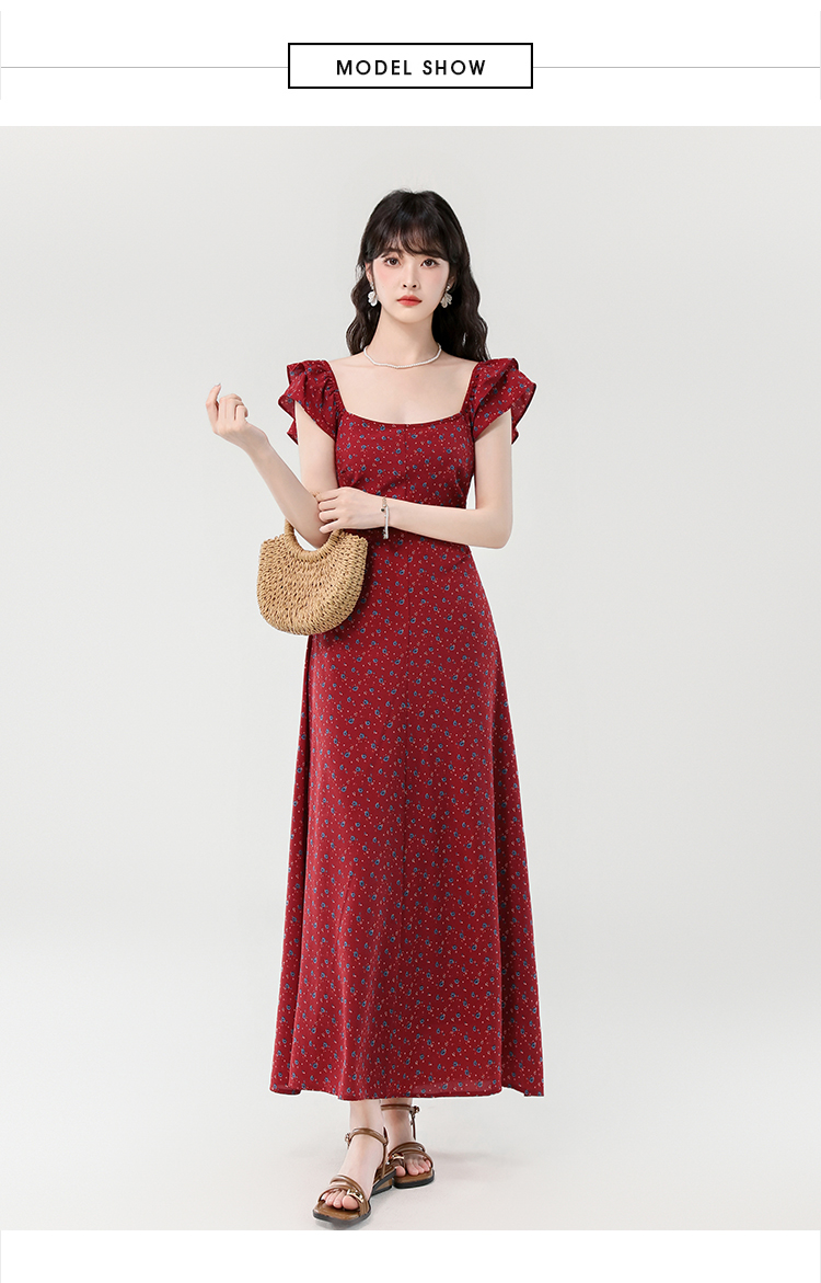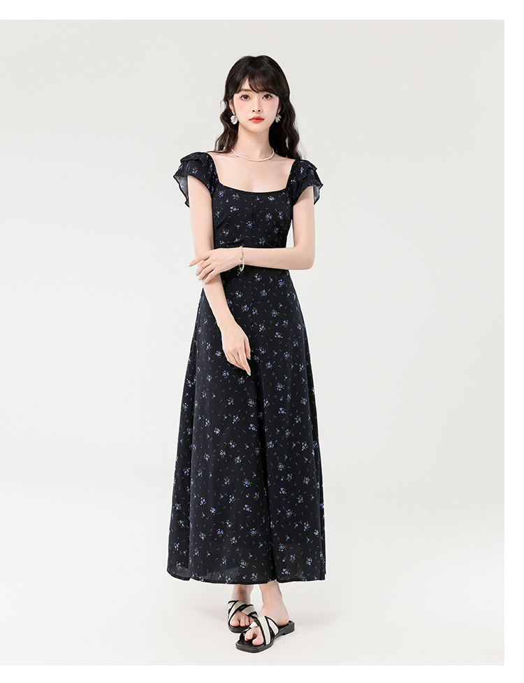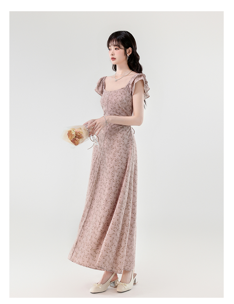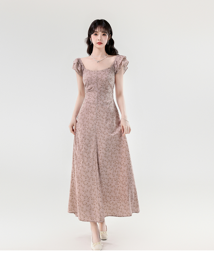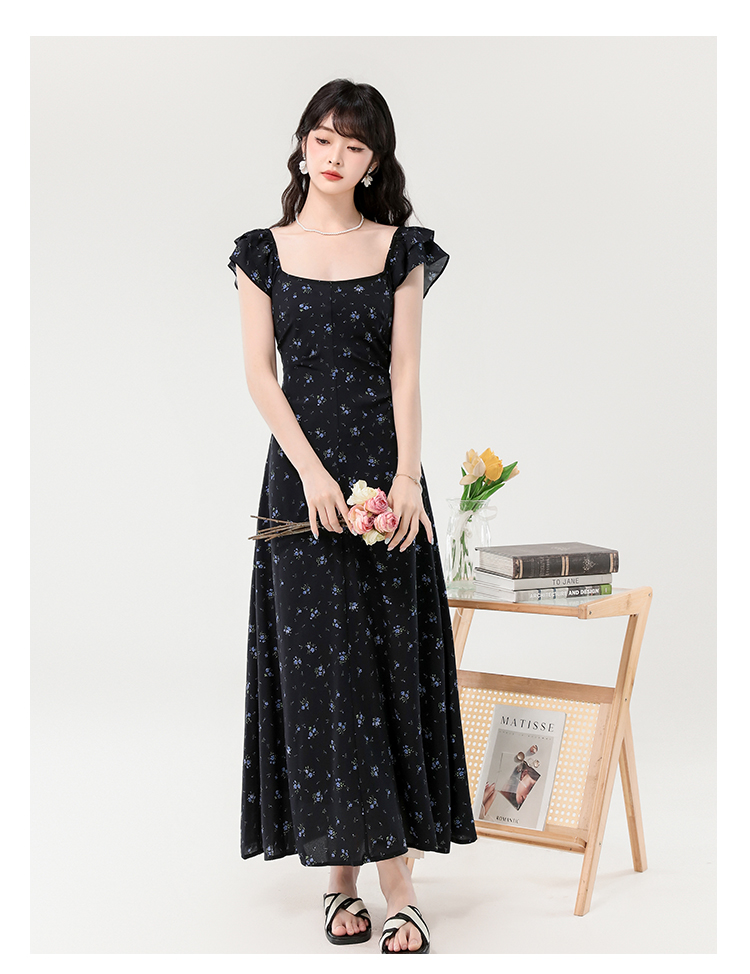 실사 2026 여름 새로운 프랑스식 광장 칼라 작은 날다 소매 롱 코트 슬림해 보이는 프린트 남쪽 법도 가짜 바람 드레스