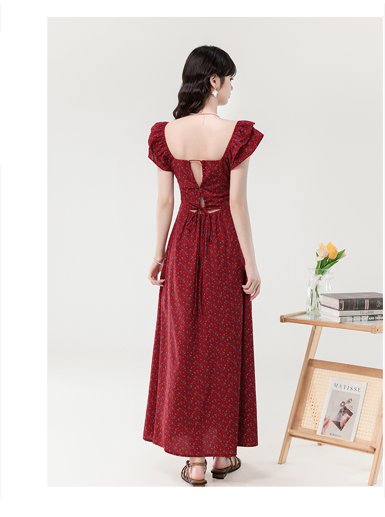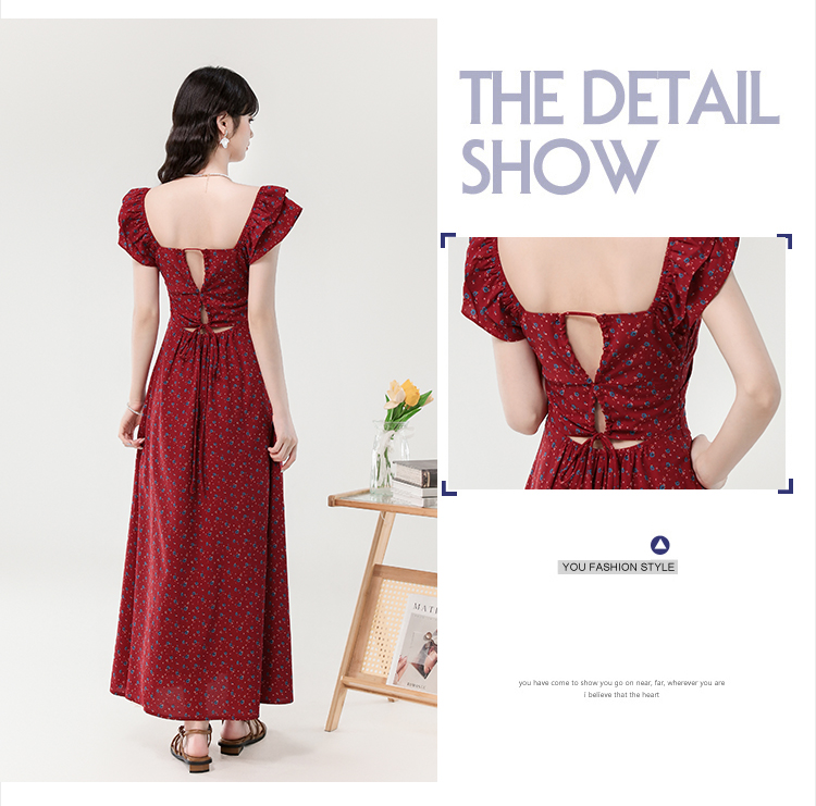 실사 2026 여름 새로운 프랑스식 우아함 광장 칼라 작은 꽃무늬 펌프 로프 레이스업 슬림해 보이는 롱 코트 휴가 바람 드레스