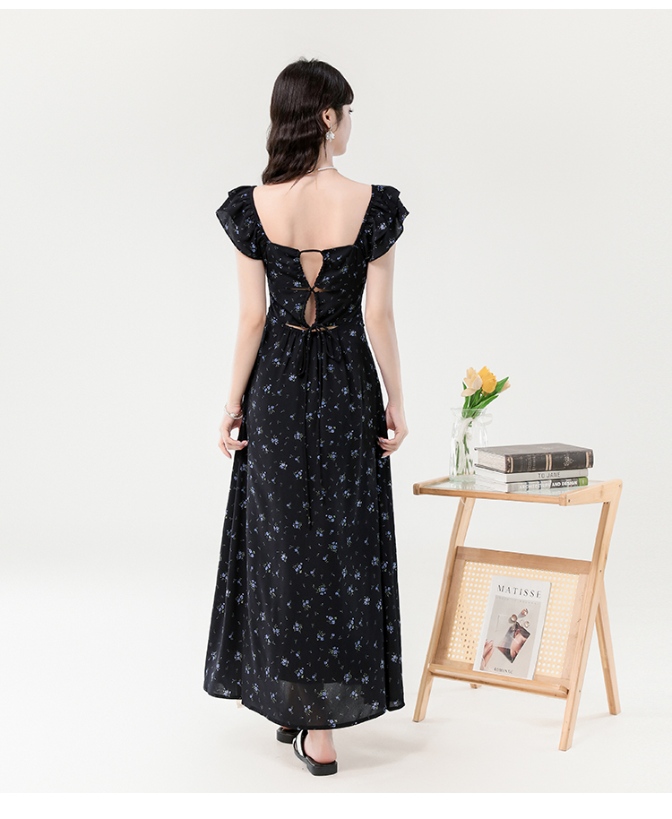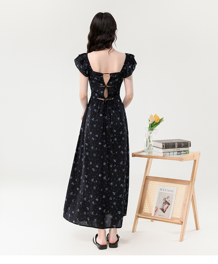 iu 같은 단락 2026 봄 흑인과 백인 꽃무늬 프린트 백리스 레이스업 드레스