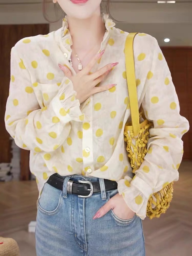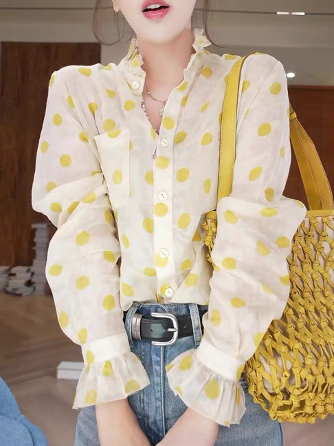 프랑스식 패션 디자인 센스 황색 도트 무늬 프릴 여성 셔츠 2026 새로운 긴팔 고급 센스 외국 가스 맨위